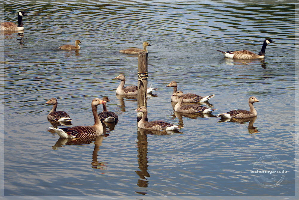 Vorne Familie Graugans, hinten Familie Kanadagans |