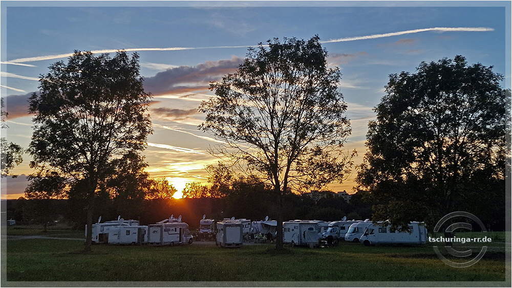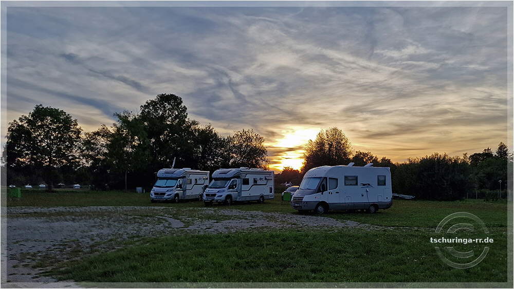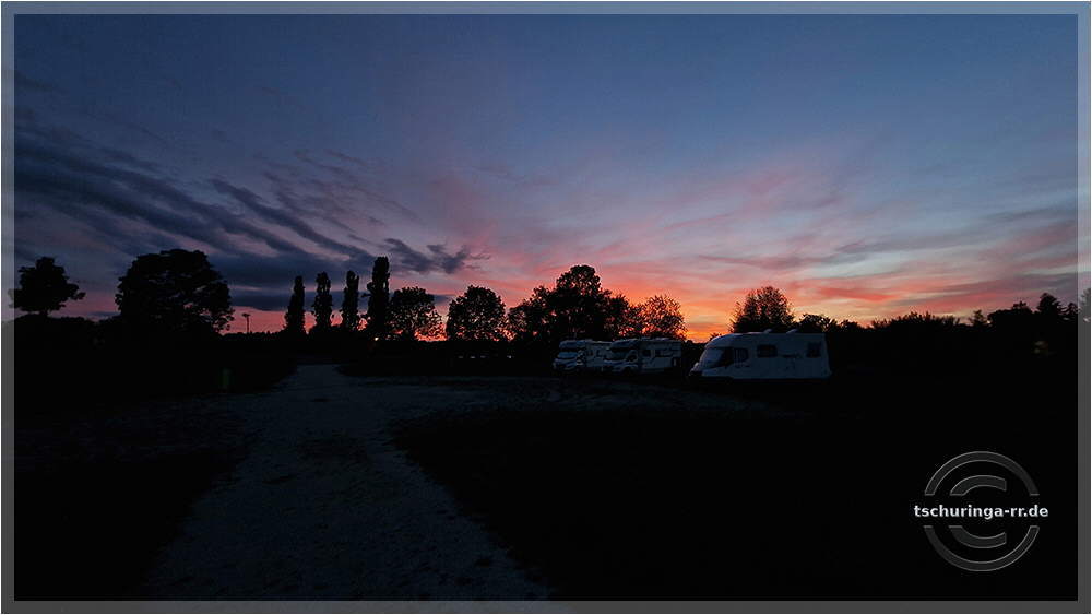 Die ersten zwei Laikas fahren heute schon wieder. Nicht alle sind Rentner und haben unbegrenzt Zeit und müssen auch noch einige Kilometer fahren. Nach den Verabschiedungen kehrt etwas Ruhe ein. Friedbert und ein paar andere besuchen noch mal die Therme. Das gemeinschaftliche Grillen fällt heute im wahrsten Sinne des Wortes ins Wasser. Ein paar Grüppchen finden sich zusammen und grillen unter den Markisen. Währendessen kommt schon wieder die Sonne raus und es gibt einen wirklich tollen Regenbogen über unseren Laikas. |