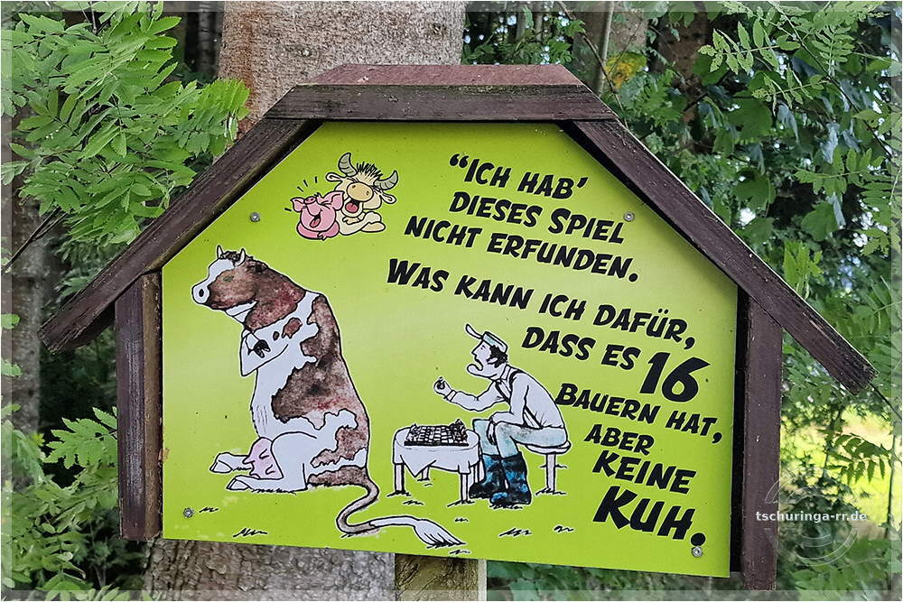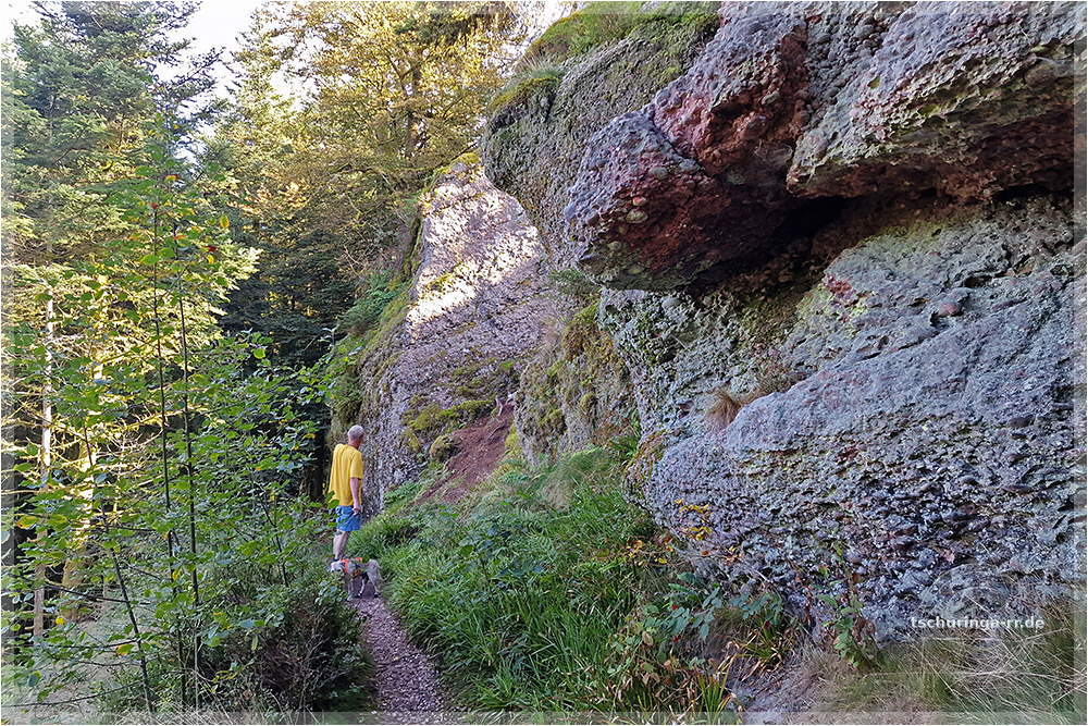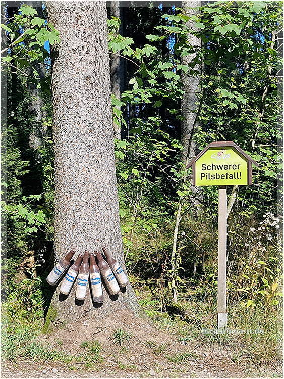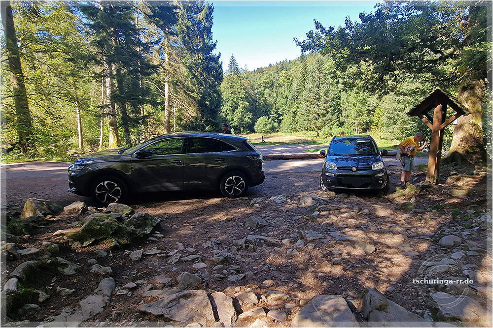 Nach dem Frühstück fahren wir zum Einkaufen nach Titisee-Neustadt. Morgens ist es noch kühl genug, so dass wir die Hunde im Womo lassen können. Nachmittags fahren wir ein paar Kilometer, denn wir wollen auf dem Gäg Wäg laufen. Ein Wanderweg mit einigen witzigen Sachen am Wegesrand. Der Untergrund ist sehr unterschiedlich. Deshalb nehmen wir für Yukon den Wagen mit. |