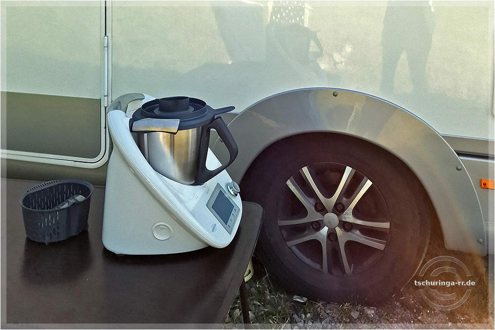 Nachdem Lennox mich heute Morgen um 4:00 Uhr aus dem Bett geschmissen hat, weil er raus musste, geht Friedbert nach dem Frühstück zum "Landhandel" und kauft Möhren. Der Thermomix darf dann Morosche Suppe kochen, welche super gegen Durchfall ist. Da es hier nachmittags regnen könnte, machen wir nach dem Mittagessen einen schönen Spaziergang. Irgendwann ziehen Wolken auf und wir bauen schon mal den Sunblokker ab, damit der auf jeden Fall trocken rein kommt. Es dauert aber nicht lange und alle Wolken sind weg und wir braten so vor uns hin. |
