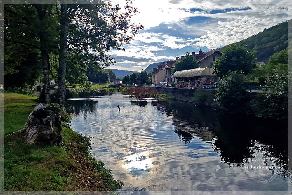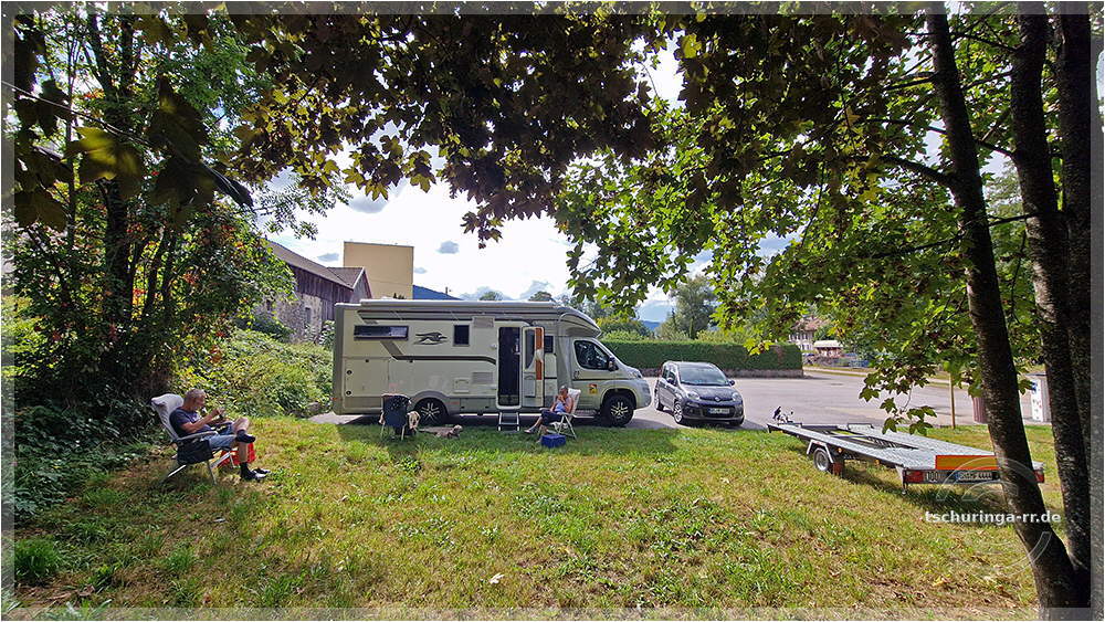 Wir sind in Frankreich. Über Col de la Schlucht, wo es brechend voll ist, fahren wir bis Cornimont auf den dortigen Stellplatz an dem Fluss Moselotte, die später in die Mosel mündet. Auf dem Weg hierher haben wir noch eingekauft, denn Friedbert musste sich mit französischem Käse eindecken. Der Kühlschrank platzt jetzt aus allen Nähten. Da wir bei der Gelegenheit noch ein großes Eis mitgenommen haben, dass wir natürlich mangels Platz im Gefrierfach sofort essen mussten, fällt das Mittagessen heute aus. Während der größten Hitze sitzen wir im Schatten der Bäume. Die nahe Umgebung erkunden wir später und laufen entlang der Moselotte in den Ort, bis wir an eine Straße kommen, wo es zumindest für Yukon nicht weiter geht. Hier drehen wir um und es geht gemütlich zurück zum Womo. |