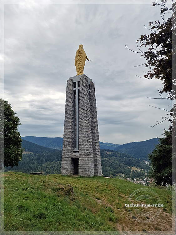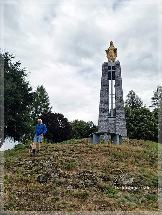 Heute macht die Sonne weitgehend Pause. Ab und zu kommen einige Tropfen. Ein paar Kleinigkeiten kaufen wir vormittags beim Marché und Aldi noch ein. Für mittags bringen wir sauleckeren Kuchen mit, der kalorientechnisch allerdings für den ganz Tag reicht. Nach Mittag fahren wir einige Kilometer den Berg hoch und laufen vom dortigen Parkplatz zur "Notre Dame de la Paix". |