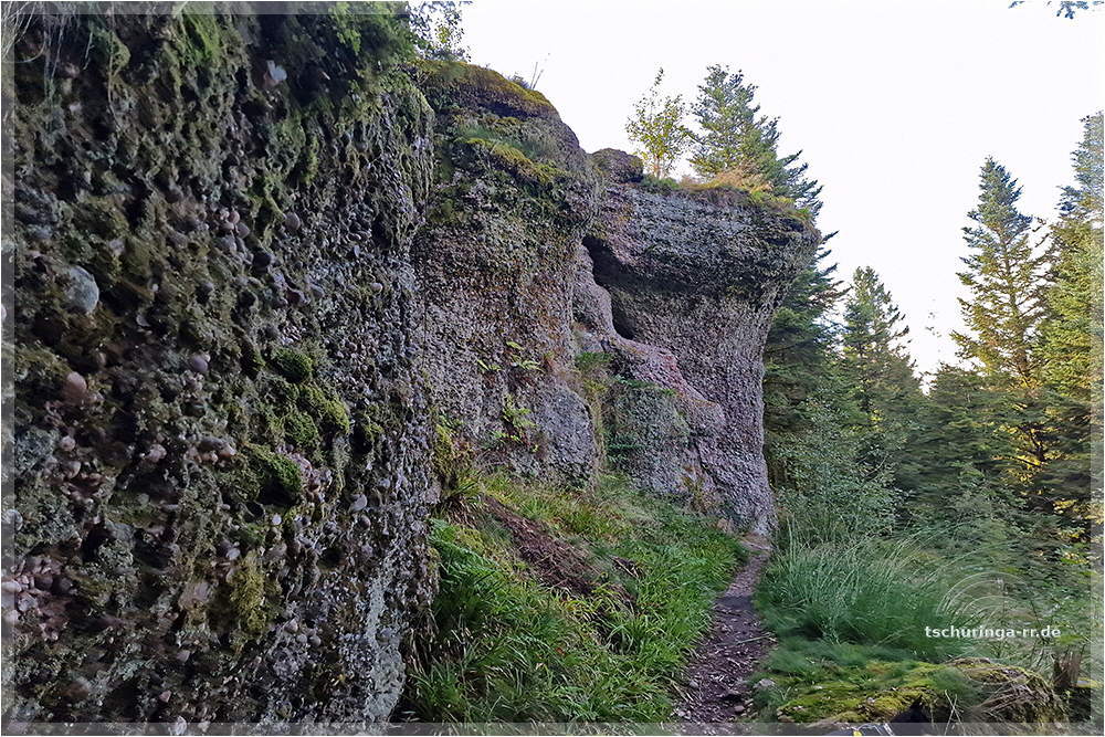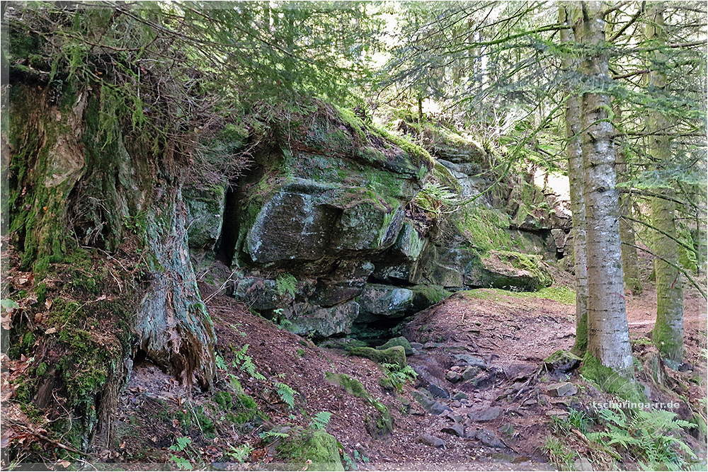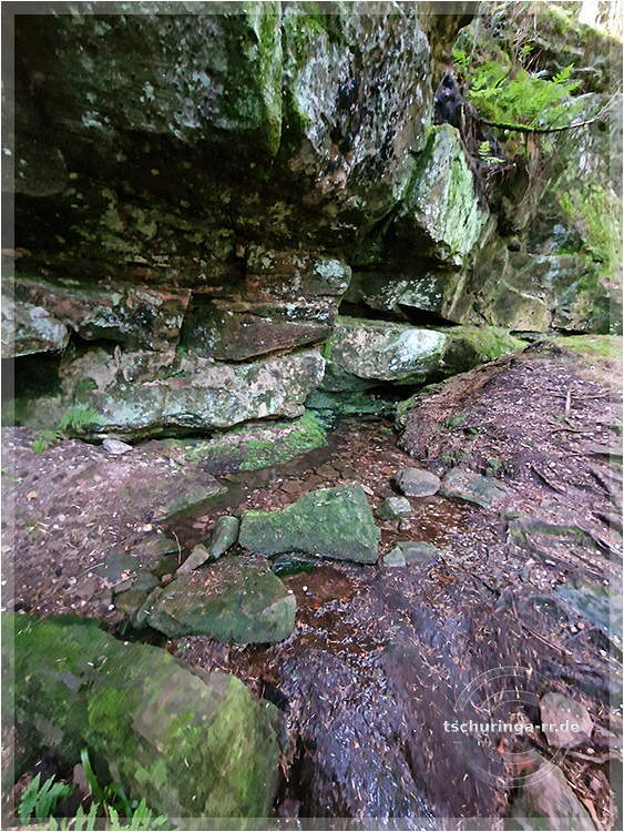 | Ansicht von unten. Die Sandsteinfelsen sind etwa 10 Meter hoch. | ||