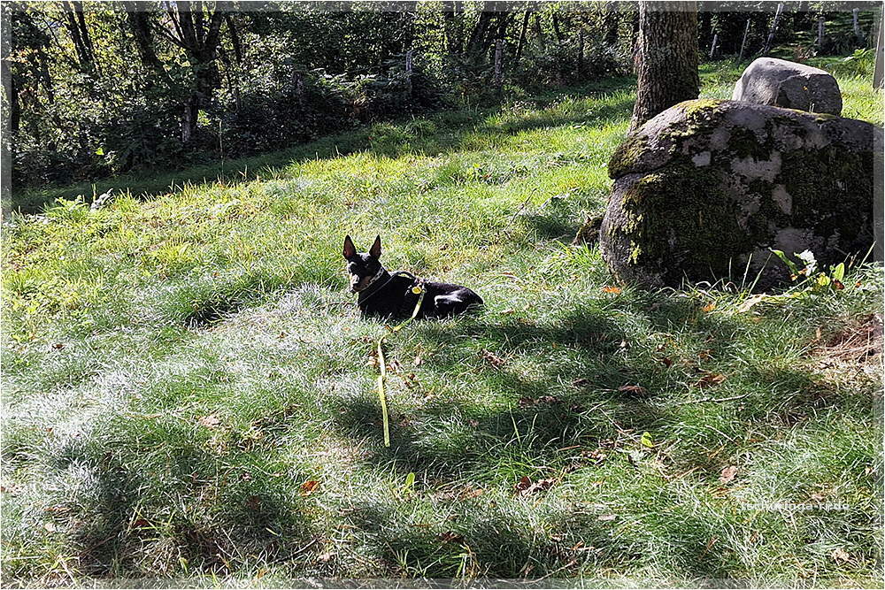 Es wird wieder warm. Während Friedbert zu Fuß im örtlichen Landhandel ein Brot besorgt, breche ich mit den Hunden im schön kühlen Wald zum Morgengassi auf. Im Anschluss daran verbringen wir den Tag mit kurzen Unterbrechungen vor dem Wohnmobil unter der Markise mit Sonnenschutz. Gegen 16:00 Uhr starten wir zu einem Spaziergang, in dessen Verlauf wir einen schönen Weg finden. Schattig und für Yukon super geeignet. |