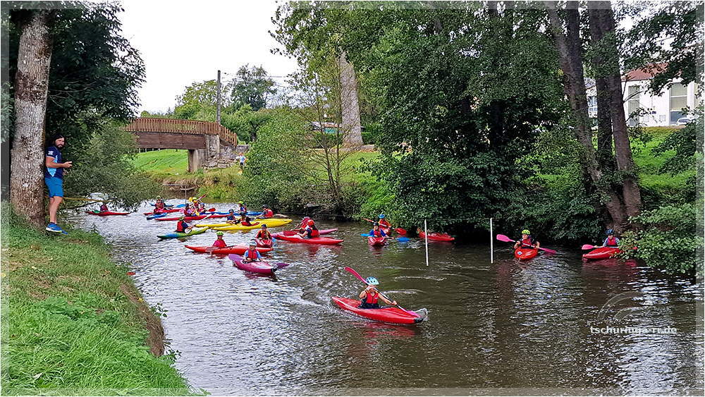 Das Wetter ist ziemlich durchwachsen. Am Vormittag sitzen wir draußen in der Sonne und laufen eine Runde um den Sportplatz. Mittags regnet es und donnert auch mal. Als es wieder auflockert laufen wir noch mal Richtung unserer "Wanderwiese" von gestern und vertreiben uns die Zeit mit Beobachten der jungen Wilden beim Paddeln. Den Jungs geht es soweit gut. Stuhlgang sieht zumindest bei Lennox wieder gut aus, Yukon hat sich den nach den paar Möhrchen von gestern gleich gespart. |