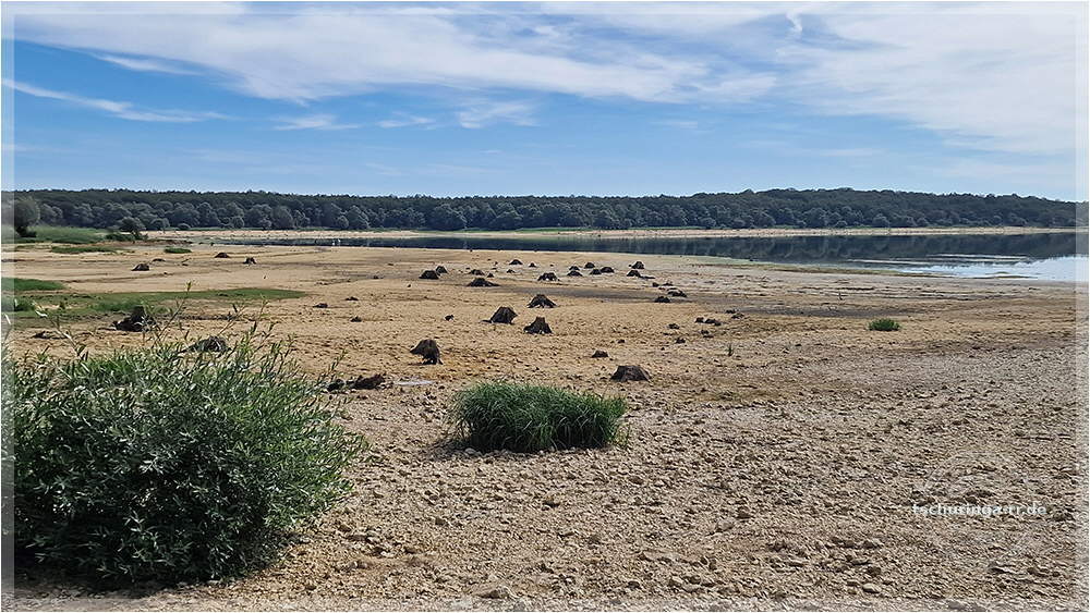 Unser heutiges Ziel ist der Lac d'Orient, ein ebenfalls angestauter See im Regionalen Naturpark Forêt d'Orient, der als Wasserreservoir genutzt wird. Hier waren wir vor 12 Jahren schon mal mit dem erst einjährigen Yukon und unserer Ridgeback-Hündin Kimba, die damals schon 13 Jahre alt war. Jetzt ist Yukon schon 13 Jahre alt. Wo ist nur die Zeit geblieben? Acht Kilometer laufen wir auf die Landzunge, die in den See hinein reicht. Eine schöne Tour. Es ist allerdings wieder sehr warm. Hier sind es um 18:00 Uhr immer noch 24°. |