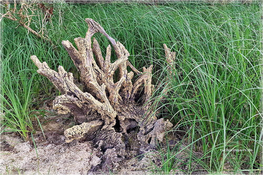 | Die Wurzeln, die von den Weiden unter Wasser ausgebildet wurden, sind jetzt trocken. | ||