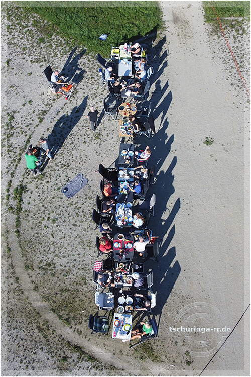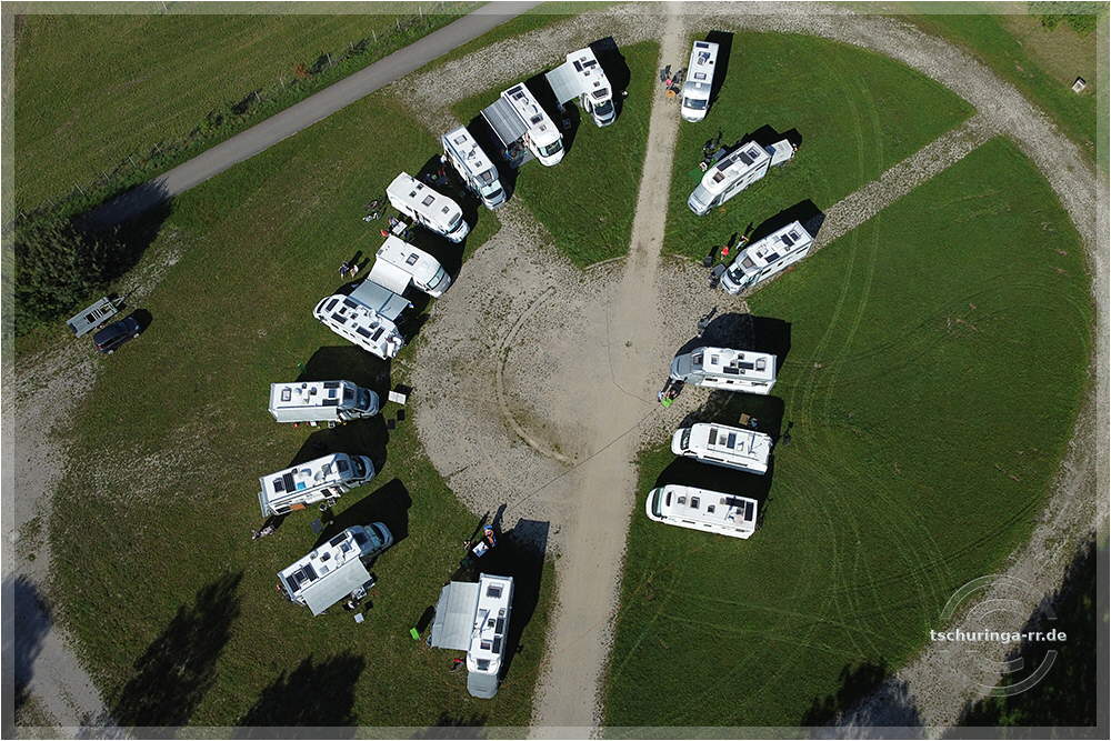 Der Platz füllt sich langsam. Als Höchstzahl für eine Nacht haben wir 17 Laikas hier stehen. Davon sieben Kreos 5009, so wie unser Manni. Ein älterer 5009 ist auch noch dabei, aber das ist das Vorgänger Modell, der 20 cm kürzer ist. Es wir gequatscht, geklönt, gefachsimpelt. Gestern Abend ist ein 5009er aus Grevenbroich dazu gekommen. Die Besatzung und die eines bereits anwesenden Laika Kosmo stellen fest, dass sie nicht mal 10 km voneinander entfernt leben. Die Camperwelt ist halt doch recht klein. Am späten Nachmittag wird eine Tischreihe für das gemeinsame Grillen aufgebaut. Jeder bringt seine eigenen Sachen mit und so sitzen wir in einer langen Reihe mitten auf dem Platz. |