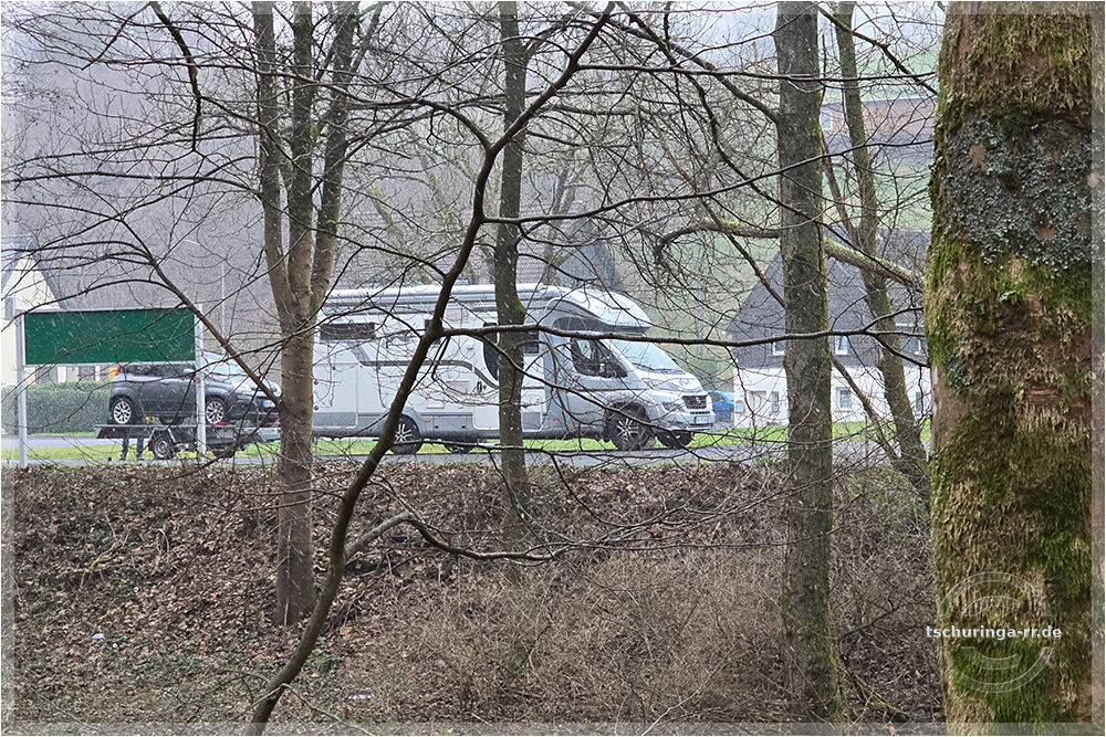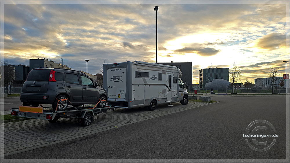 Gegen 10:00 Uhr sind wir startklar. Ich fahre mit dem Panda nach Morsbach zum Metzger und Lidl. Dann treffe ich mich mit Friedbert an der Tankstelle, wo der Panda auf den Trailer verladen wird. Während Friedbert alles sichert, gehe ich noch kurz mit den Hunden Gassi. Es ist bereits 16:30 Uhr als wir zu einem Spaziergang am Rhein aufbrechen. Die Runde wird auch nicht sehr lang, weil es schon fast dunkel ist. Das Wetter ist den gesamten Tag ungemütlich feuchtkalt und wir freuen uns wieder im warmen Womo zu sein. |
