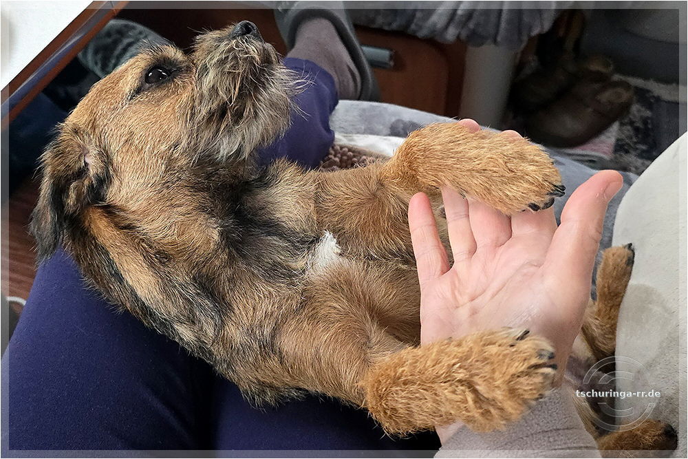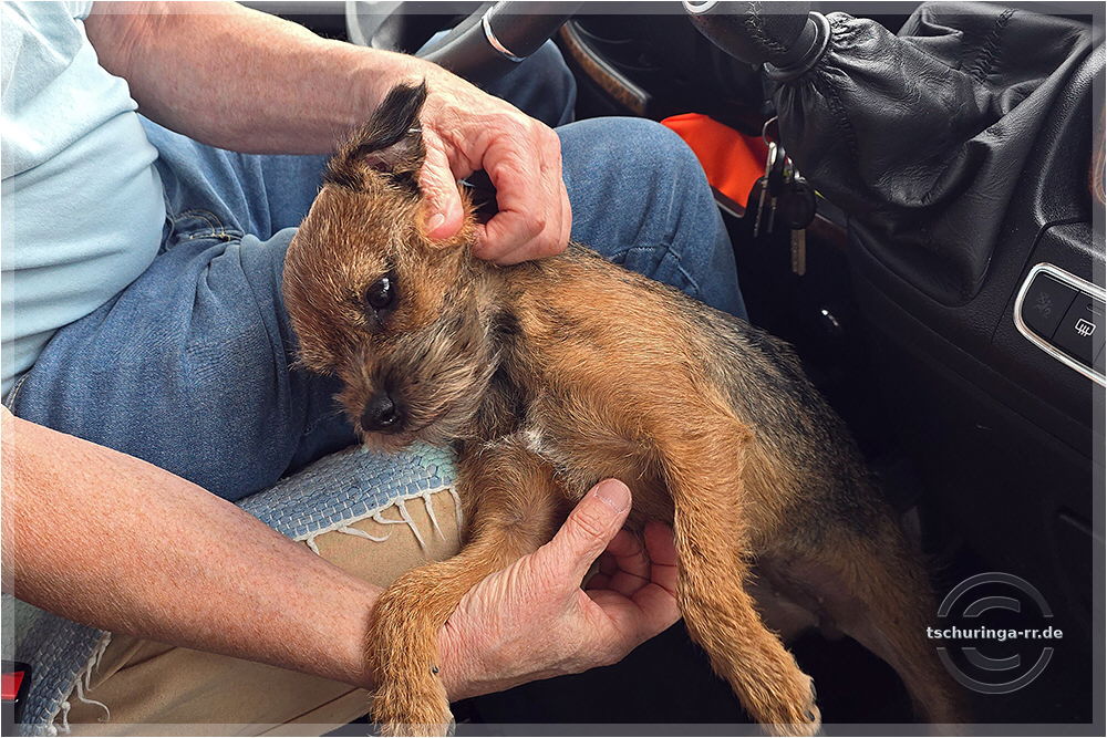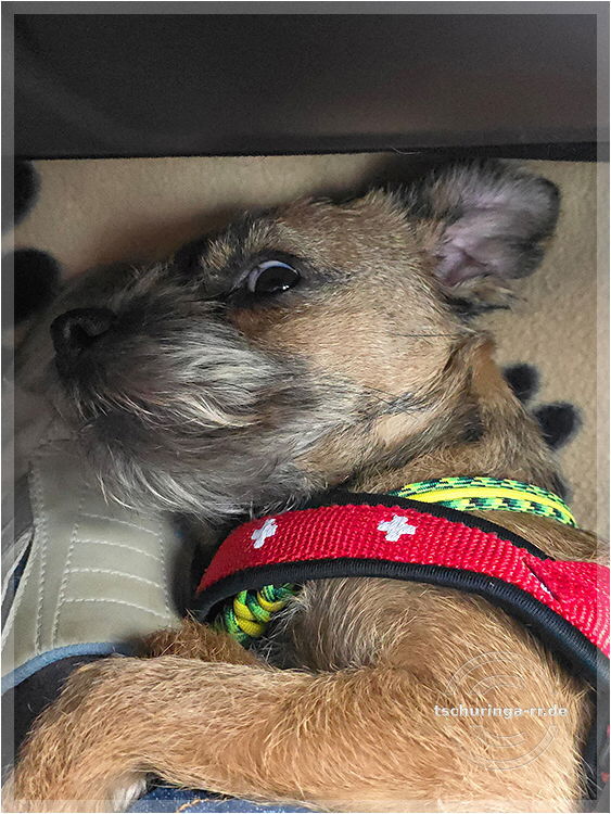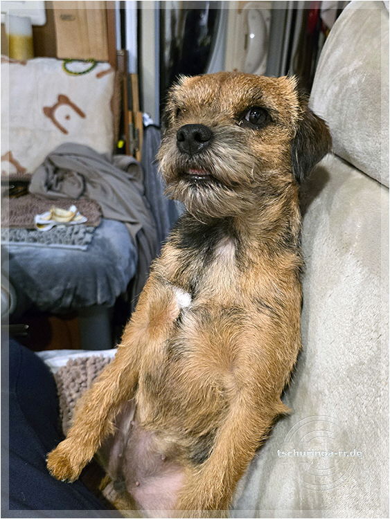 Fahrstopp zur Mittagspause. Da holt Una sich Schmuseeinheiten bei Herrchen ab. |