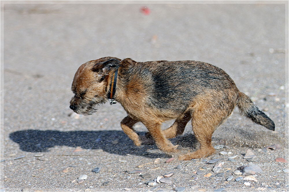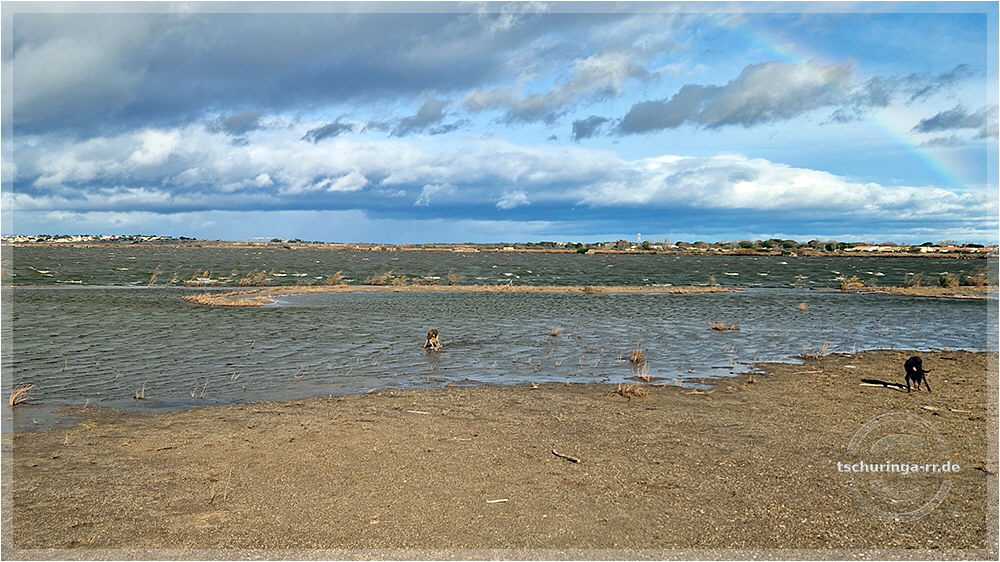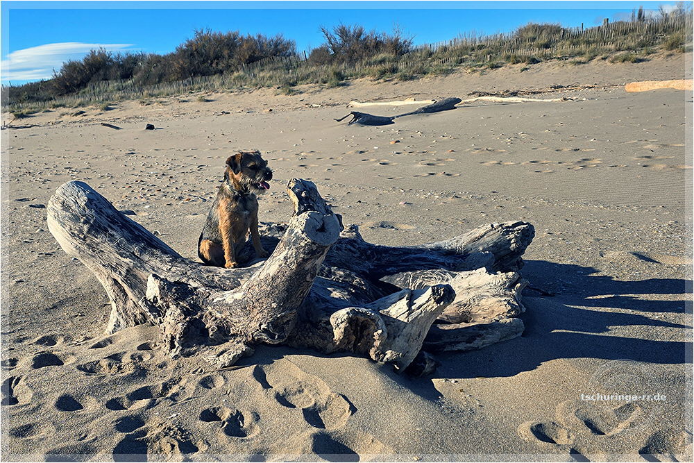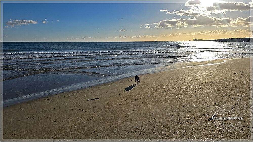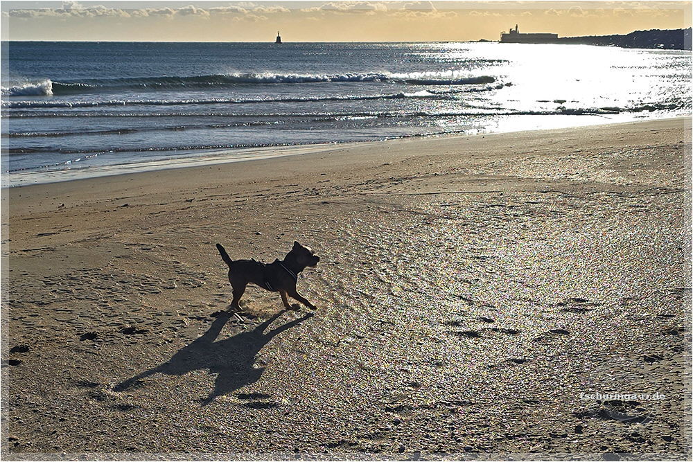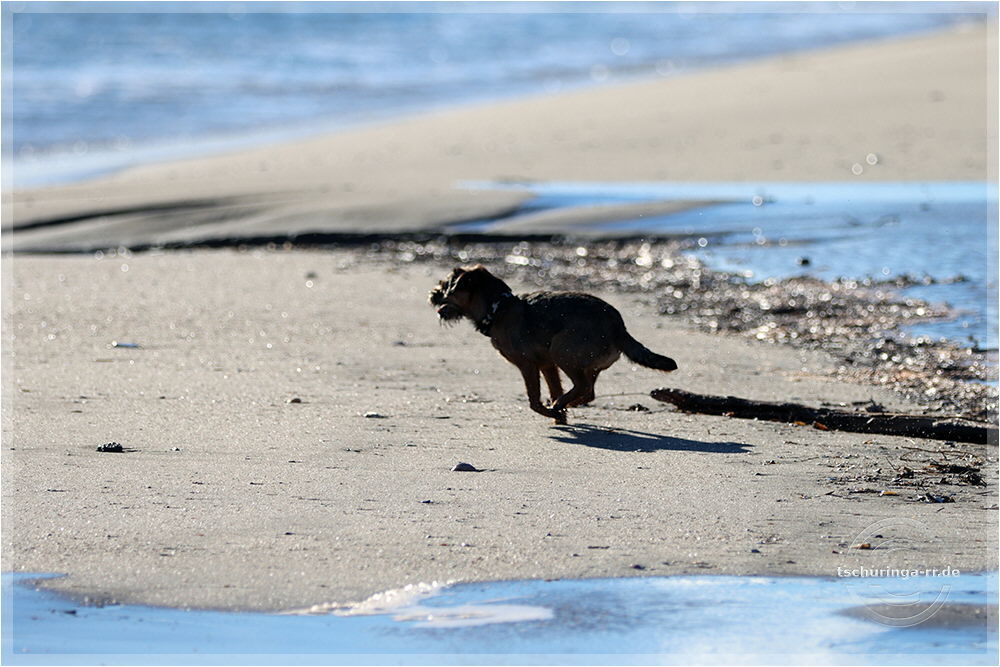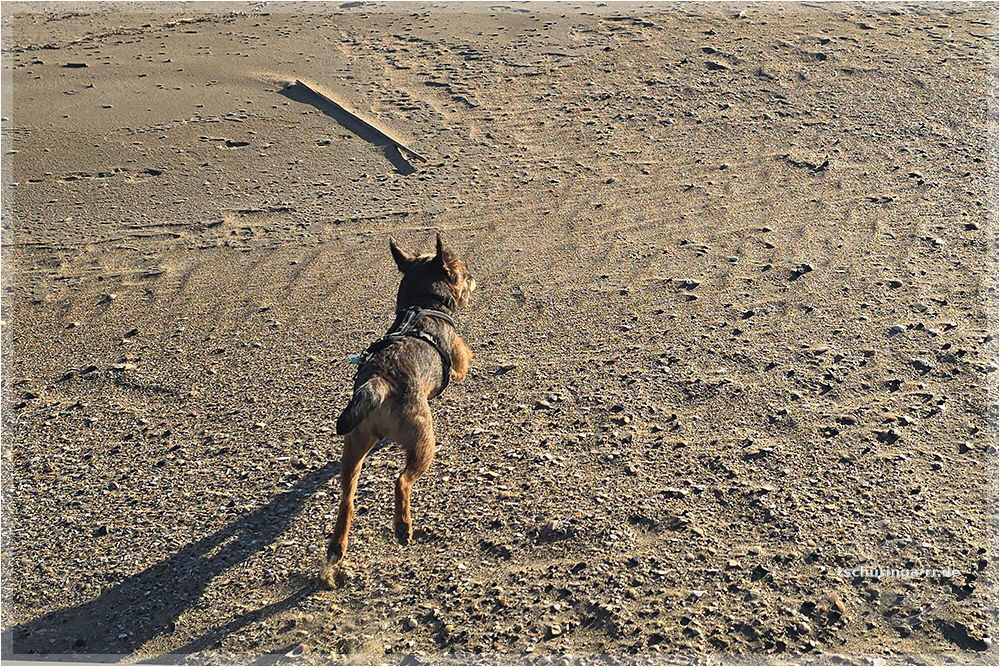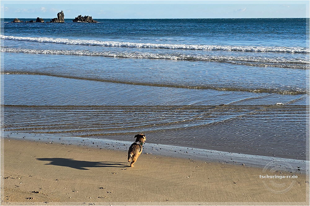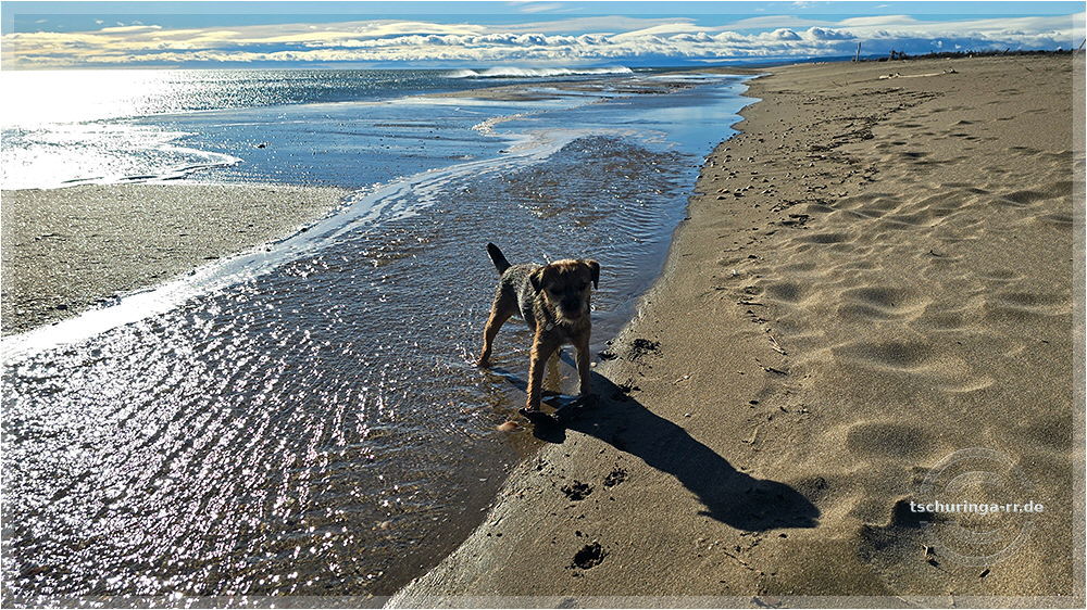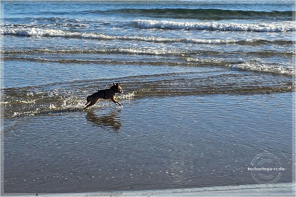 Am frühen Nachmittag fahren wir zum Strand, denn heute wollen wir endlich eine Strandwanderung machen. Hätte auch fast geklappt. Zu Anfang sieht das alles super aus. Wir laufen am Wasser einer kleinen Bucht entlang. Als wir dann aber direkt ans Meer kommen, müssen wir nach kurzer Zeit abbrechen. Der starke Wind kommt von der Landseite und treibt den Sand erbarmungslos in Richtung Wasser. Für uns schon unangenehm, für die Hunde, die ja viel weiter unten sind, eine Katastrophe. Lennox und Una haben so viel Sand in den Augen, dass sie fast nur noch damit beschäftigt sind, sich durch die Augen zu wischen. Also Abbruch. Das mit der Strandwanderung gestaltet sich irgendwie schwierig. Aber auf dem ersten Stück, wo der Sand nicht so weht, findet Una ihr Glück und rennt als wäre der Teufel hinter ihr her. |
