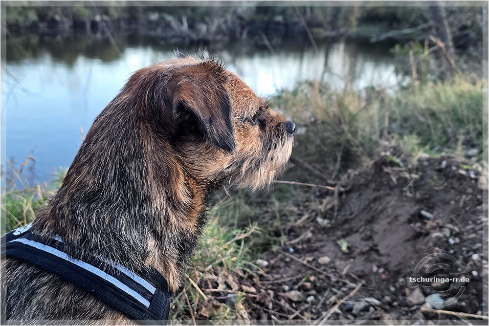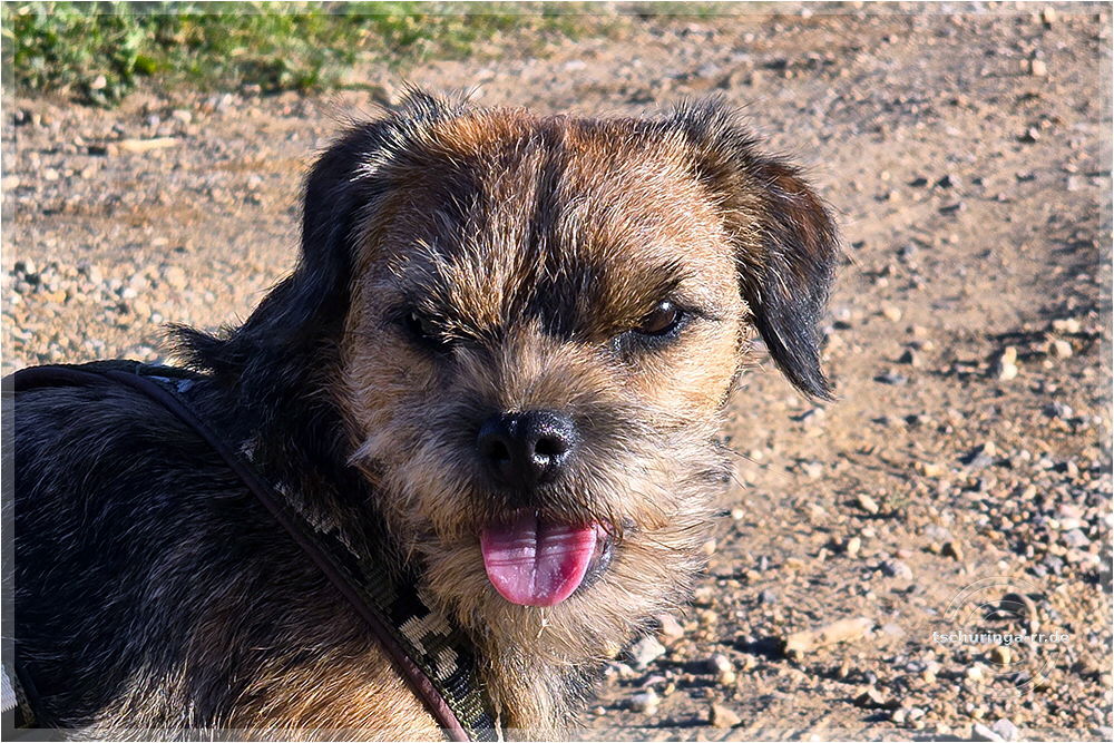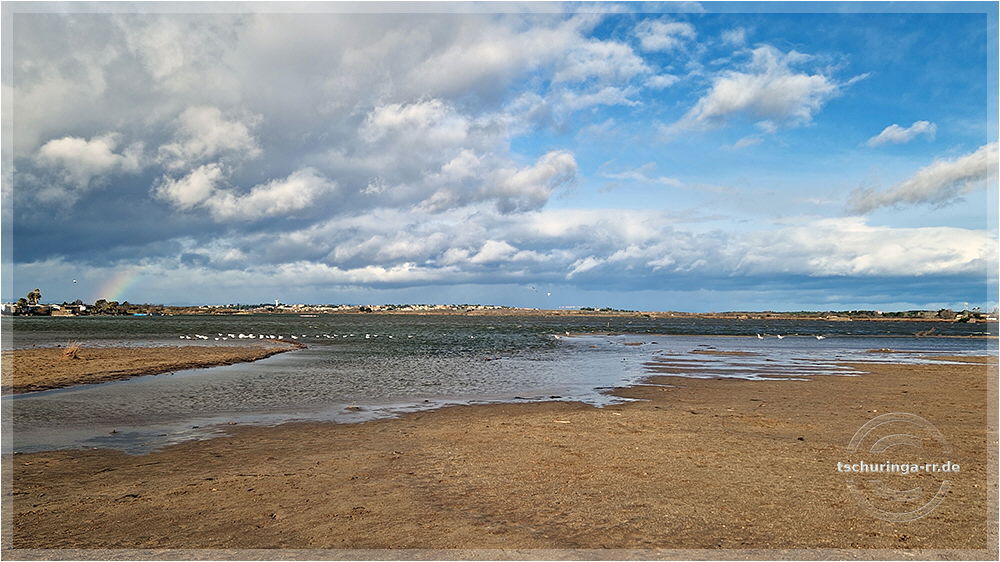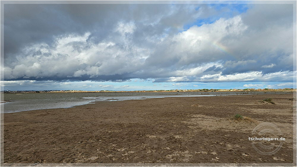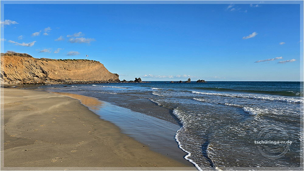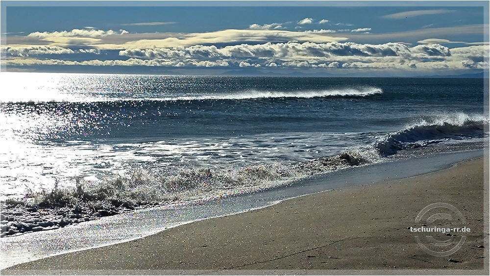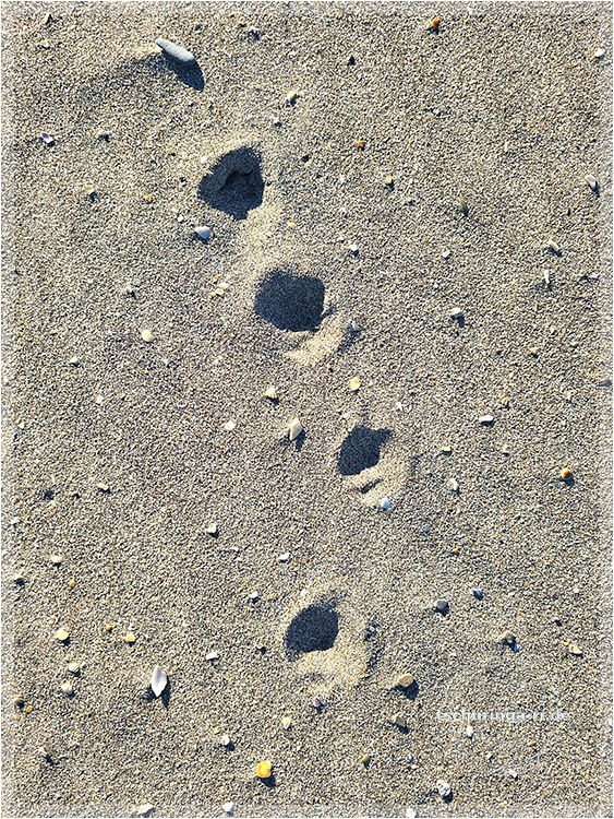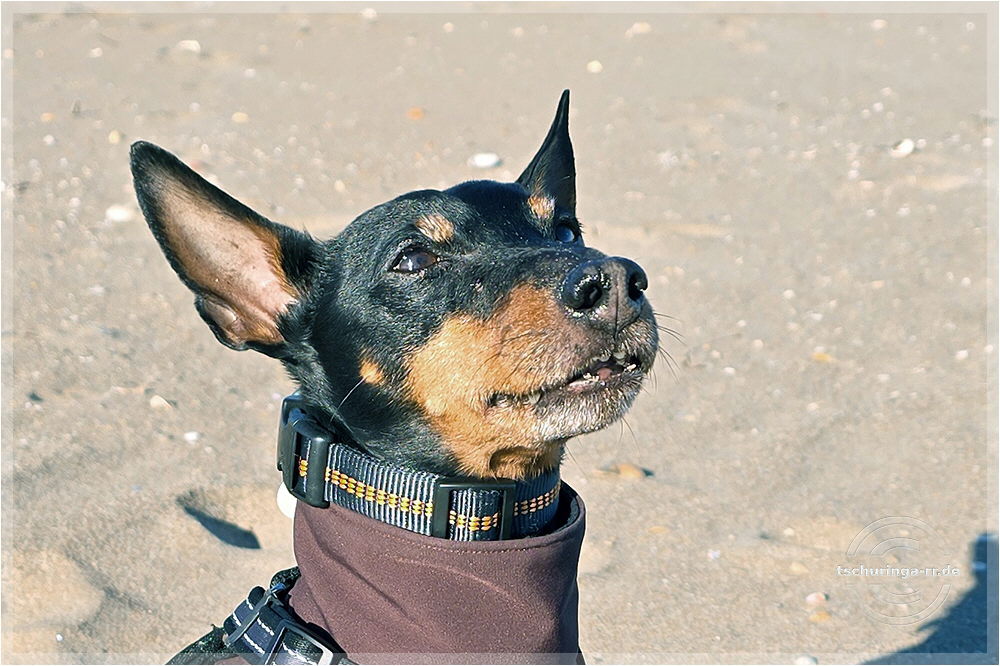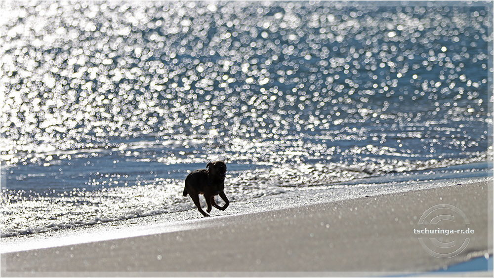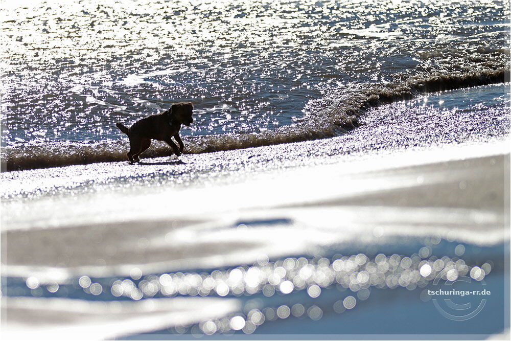 Am frühen Nachmittag fahren wir zum Strand, denn heute wollen wir endlich eine Strandwanderung machen. Hätte auch fast geklappt. Zu Anfang sieht das alles super aus. Wir laufen am Wasser einer kleinen Bucht entlang. Als wir dann aber direkt ans Meer kommen, müssen wir nach kurzer Zeit abbrechen. Der starke Wind kommt von der Landseite und treibt den Sand erbarmungslos in Richtung Wasser. Für uns schon unangenehm, für die Hunde, die ja viel weiter unten sind, eine Katastrophe. Lennox und Una haben so viel Sand in den Augen, dass sie fast nur noch damit beschäftigt sind, sich durch die Augen zu wischen. Also Abbruch. Das mit der Strandwanderung gestaltet sich irgendwie schwierig. Aber auf dem ersten Stück, wo der Sand nicht so weht, findet Una ihr Glück und rennt als wäre der Teufel hinter ihr her. |