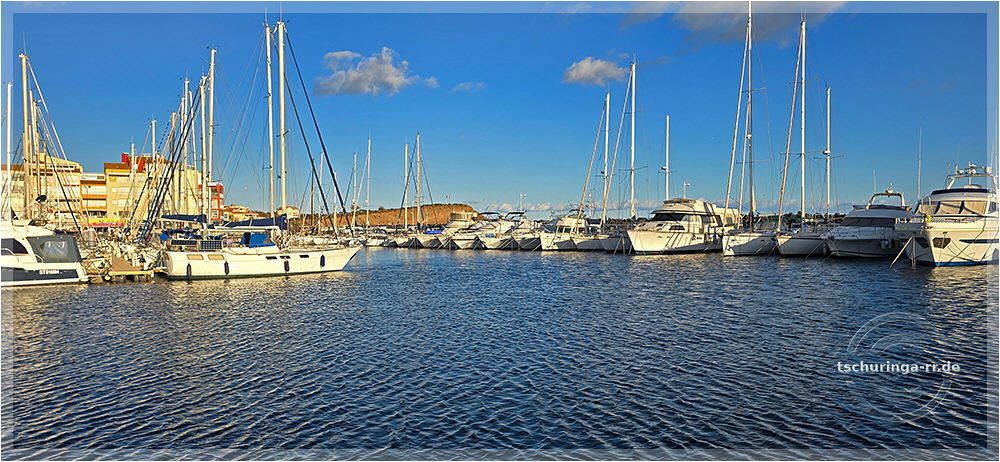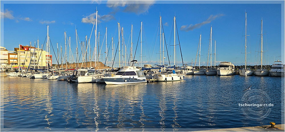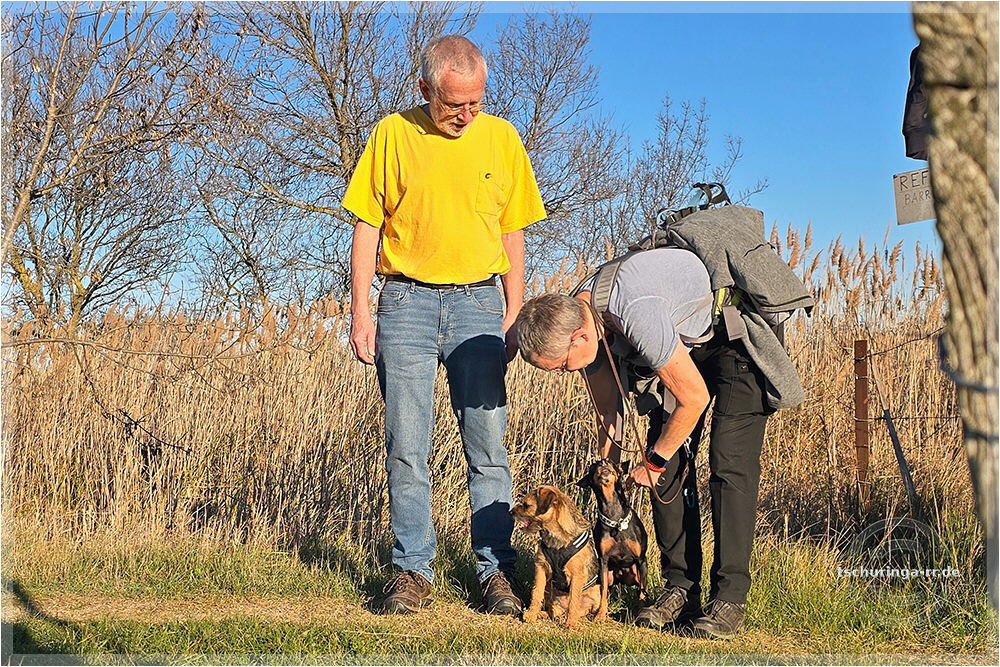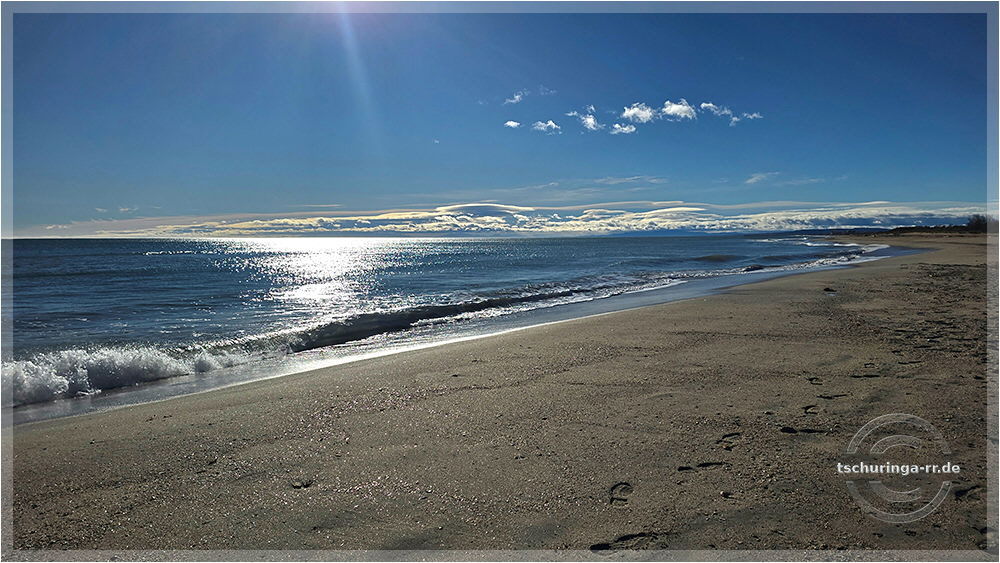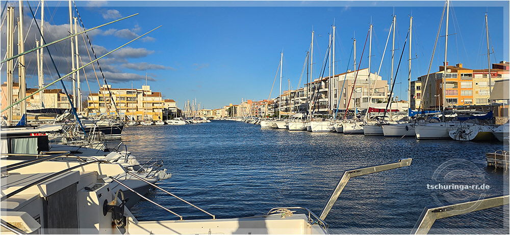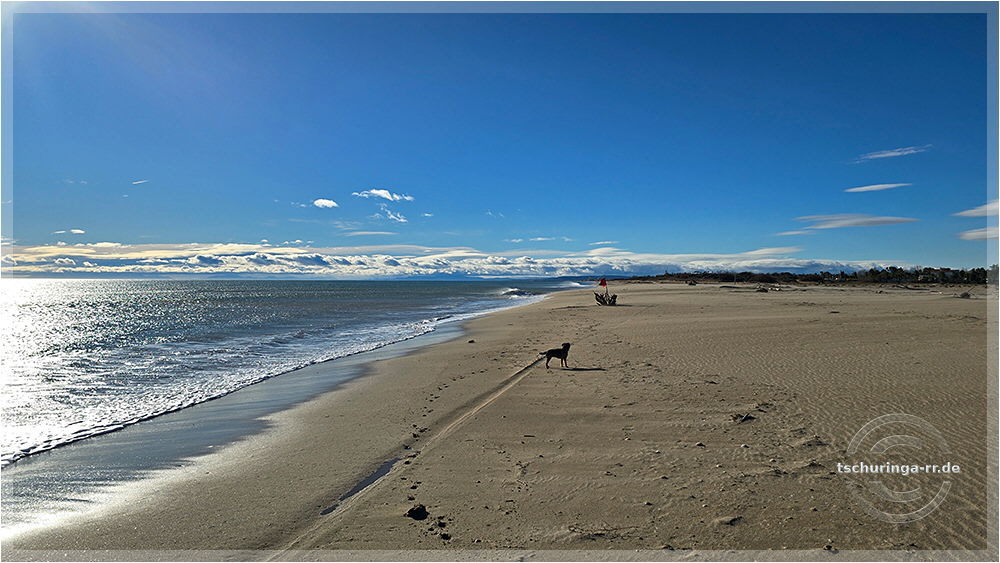 Wir haben gestern schon entschieden, dass wir über Weihnachten hier bleiben werden und deshalb heute Morgen in Agde einiges für's Fest einkaufen. Nachmittags wollen wir eine Strandwanderung machen. Die fällt allerdings aus, denn Strand zum Wandern gibt es keinen. Zumindest nicht da, wo wir hingefahren sind. Die paar Strandbereiche, die nicht aus Felsen bestehen, sind gerade mal 100 bis 200 Meter lang. Wenigstens kann Una ihre Strandliebe ausleben und ordentlich toben. Also planen wir um und machen einen Spaziergang am Hafen. In Port du Cap d'Agde liegen etliche Nobelyachten. Auf dem Rückweg zum Stellplatz halten wir kurz davor an und laufen noch mal mit den Hunden ein Stück durch die Natur. Friedbert fährt anschließend den Panda zurück, während ich die letzten paar hundert Meter zu Fuß mit den Hunden gehe. |