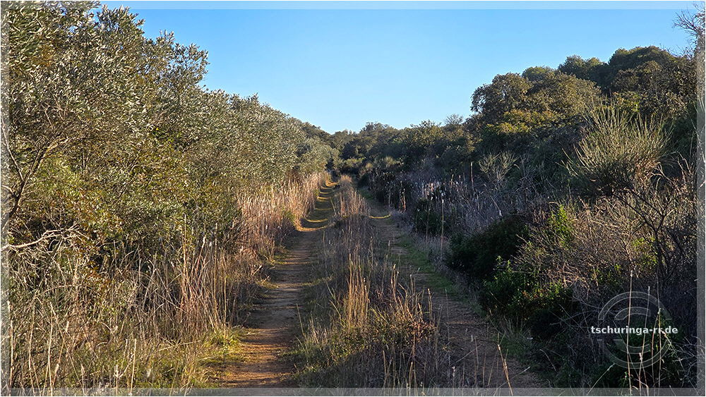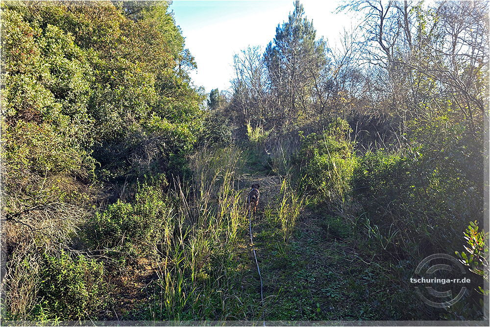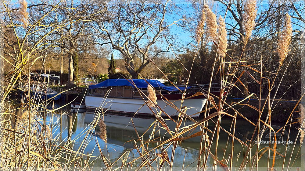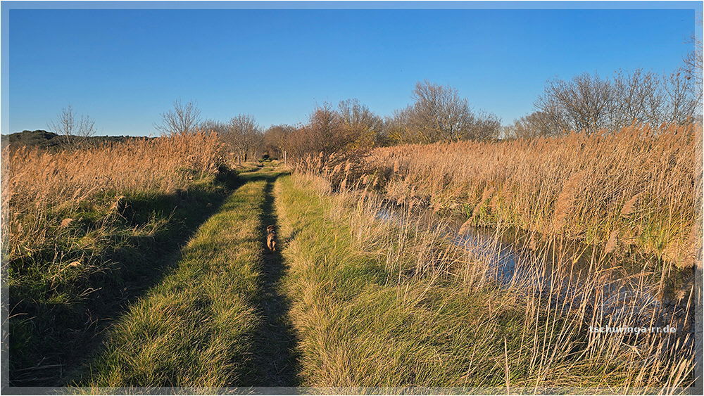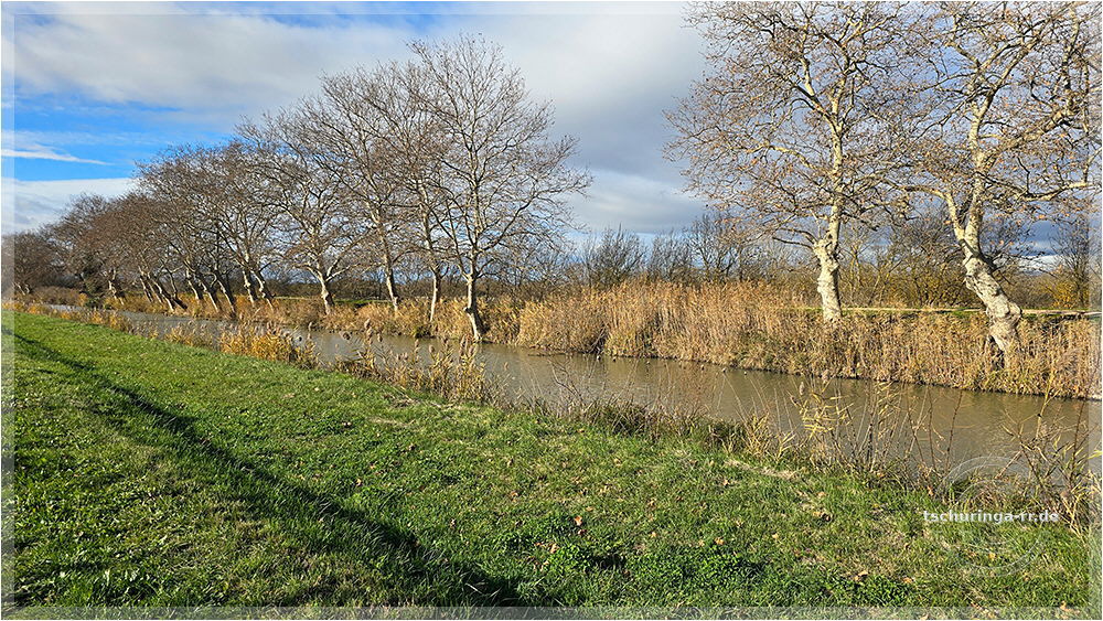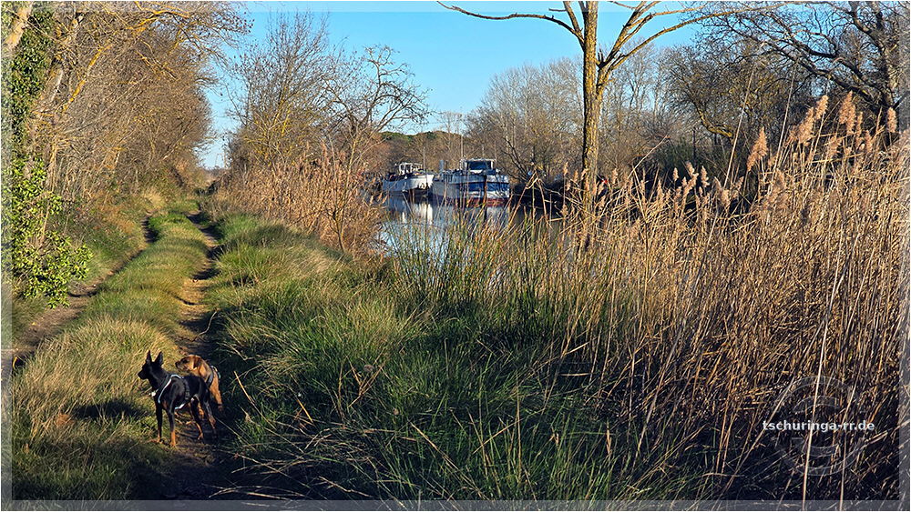 Knapp neun Kilometer ab Stellplatz wandern wir heute. Manchmal ist es etwas schwierig mit den Wegen. Nicht alle, die Komoot anzeigt, sind auch wirklich begehbar, wenn sie denn überhaupt vorhanden sind. Da steht man auch schon mal vor einem Privatgrundstück mit großem Tor, das mit einem ebenfalls großen Schloss versehen ist. Ein Stück geht es wieder am Canal du Midi entlang. Das Wetter ist herrlich. Lange Zeit laufen wir im T-Shirt, weil es bei 14° im Schatten in der Sonne richtig schön warm ist. |
