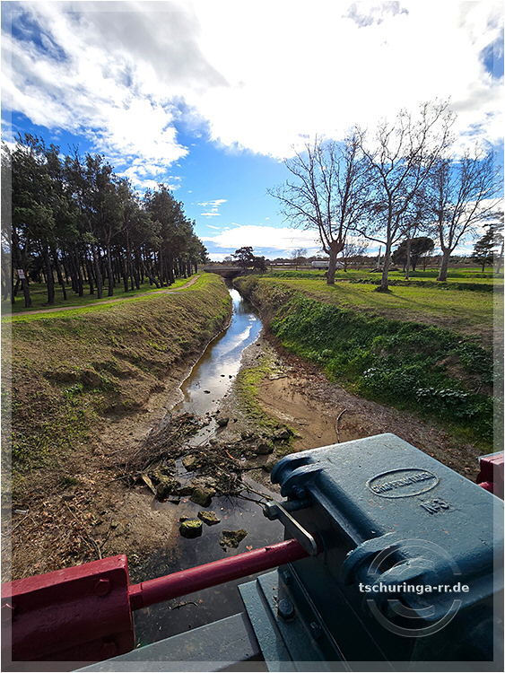 | Einer der Arme des Libron, der unter dem Kanal geteilt ist, um Schiffen die Durchfahrt auch bei Hochwasser zu ermöglichen. | ||