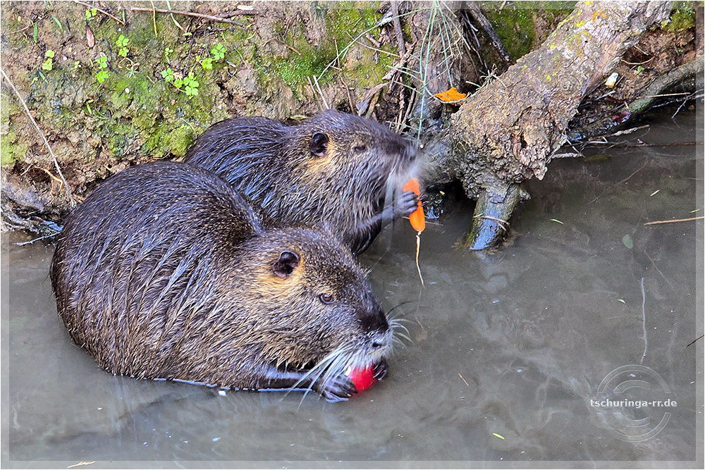 | Die Nutrias leben an dem Bach direkt am Stellplatz und werden von einem Paar vom Stellplatz gefüttert. | ||