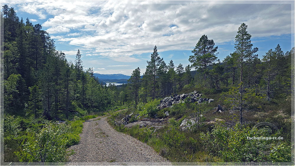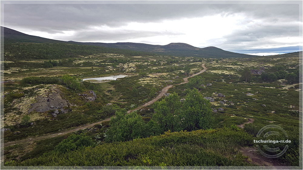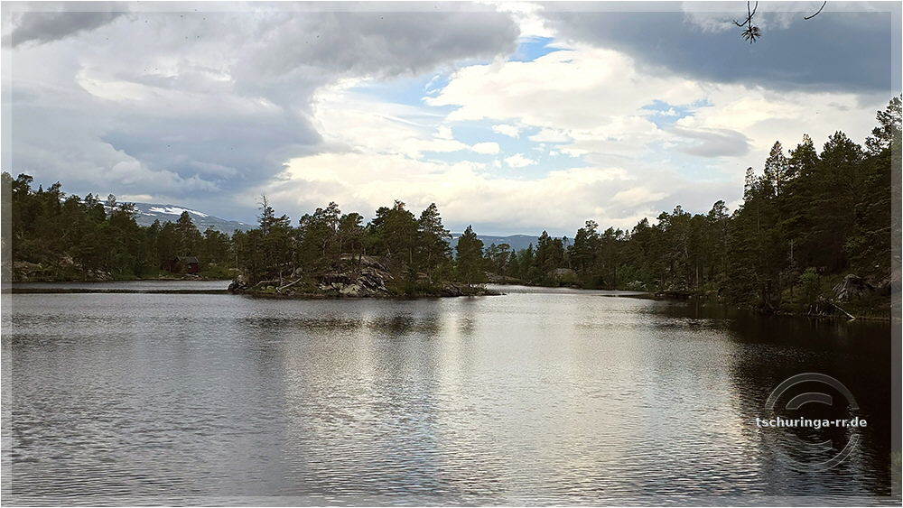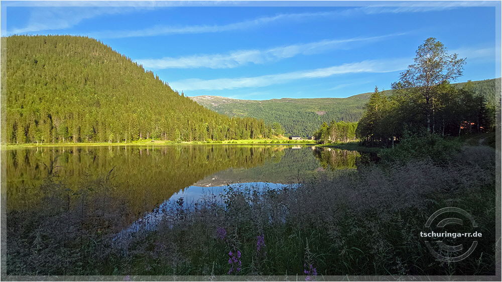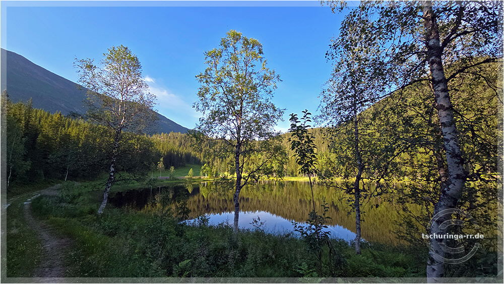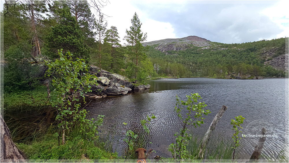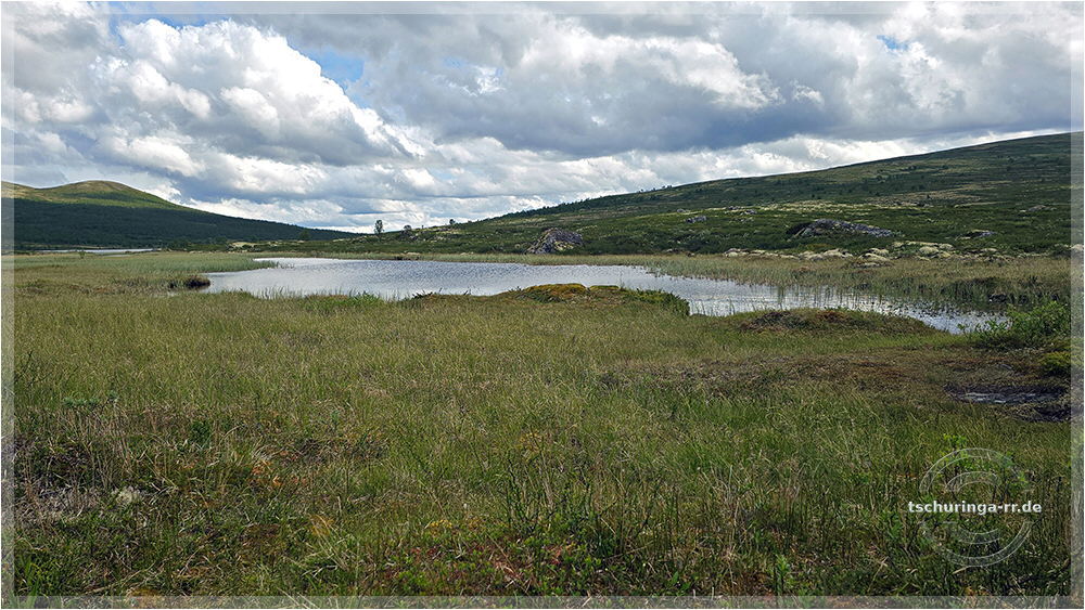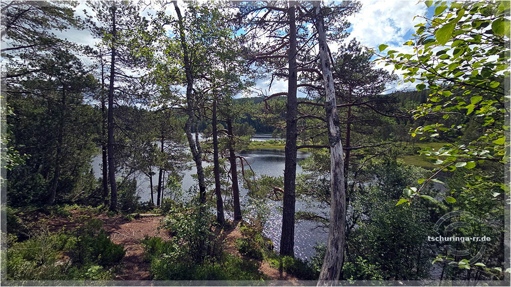 Wir fahren weiter Richtung Trondheim. Aber irgendwie scheint es die hier in der Gegend nicht zu geben. Weiter südlich habe ich schon welche gekauft und auch in zwei weiteren Läden gesehen, aber da die Truhe noch voll war, konnte ich keine mitnehmen. Jetzt ist Platz und nichts zu bekommen. Okay, dann gibt es halt Schwein. Den Hunden ist es sowieso egal, Hauptsache der Bauch wird gefüllt. Friedbert hat einen Parkplatz in der Nähe eines Sees ausgesucht. Als wir dort ankommen entscheiden wir uns dagegen, denn der ist gerammelt voll mit PKWs und Wohnmobilen. Wir fahren lieber noch ein gutes Stück bergauf und kommen auf dem Storsvingen Parkplatz unter, wo nur ein paar PKWs von Wanderern stehen. Am Abend sind wir da ganz allein. Mittags gibt es Kuchen und danach starten wir zu einer schönen Sechs-Kilometer-Wanderung. Unser Wanderweg geht über Loipen. Naja, im Winter sind es Loipen, jetzt teilweise Schotterwege. Wir biegen ab zum See Kobberdammen, den wir umrunden, um dann über die nächste Loipe den Heimweg anzutreten. |