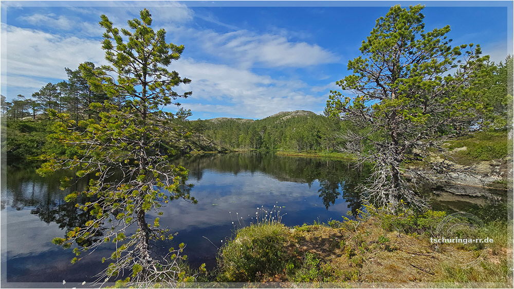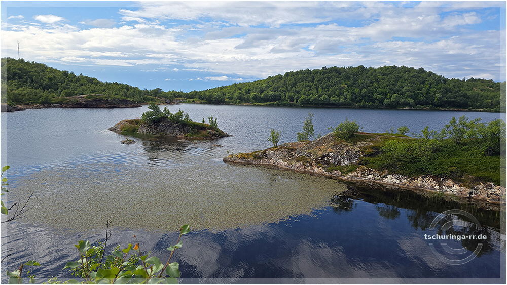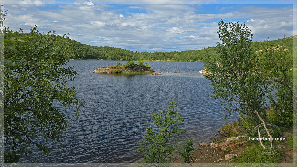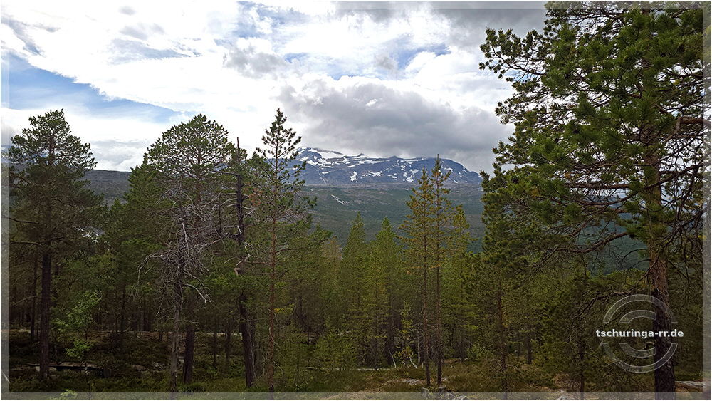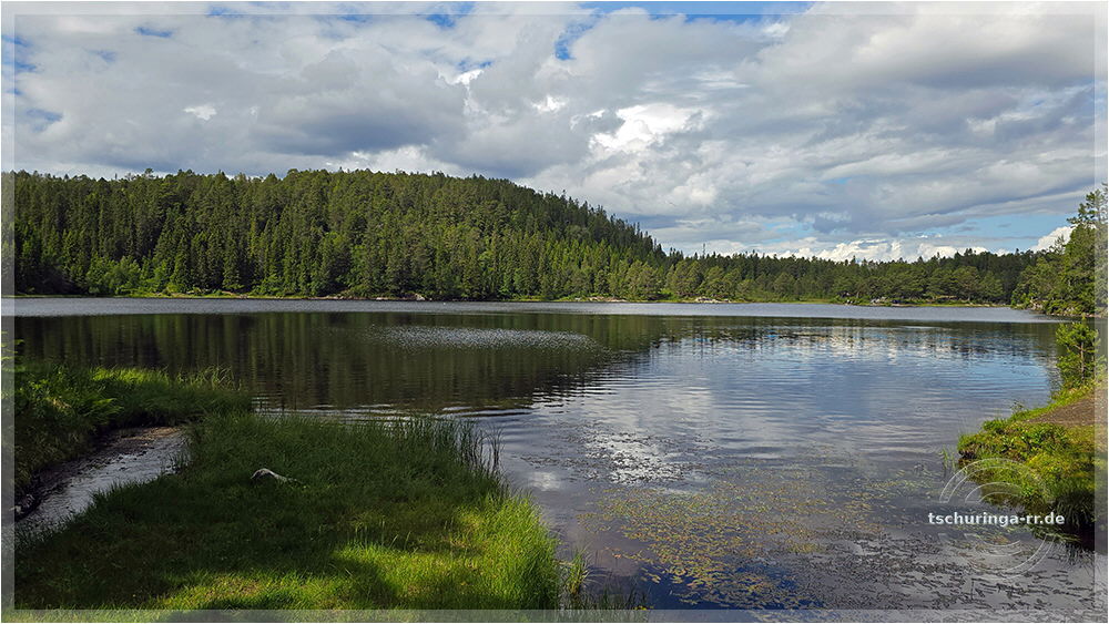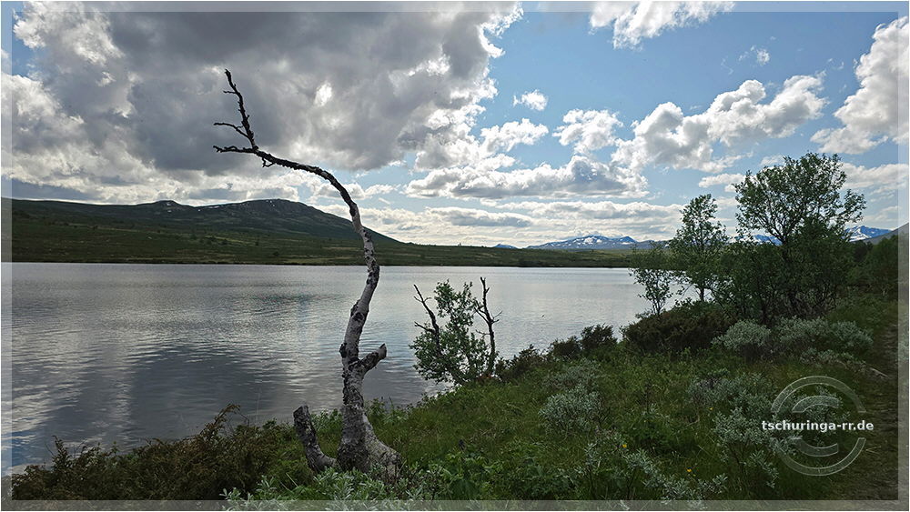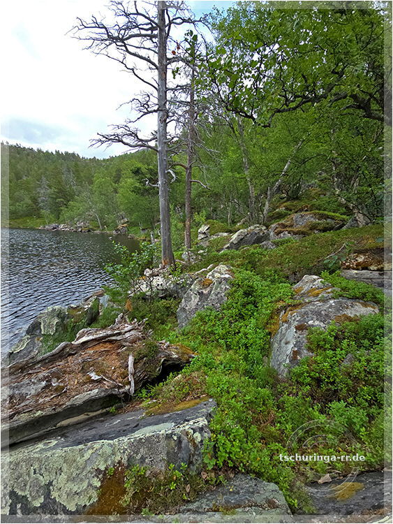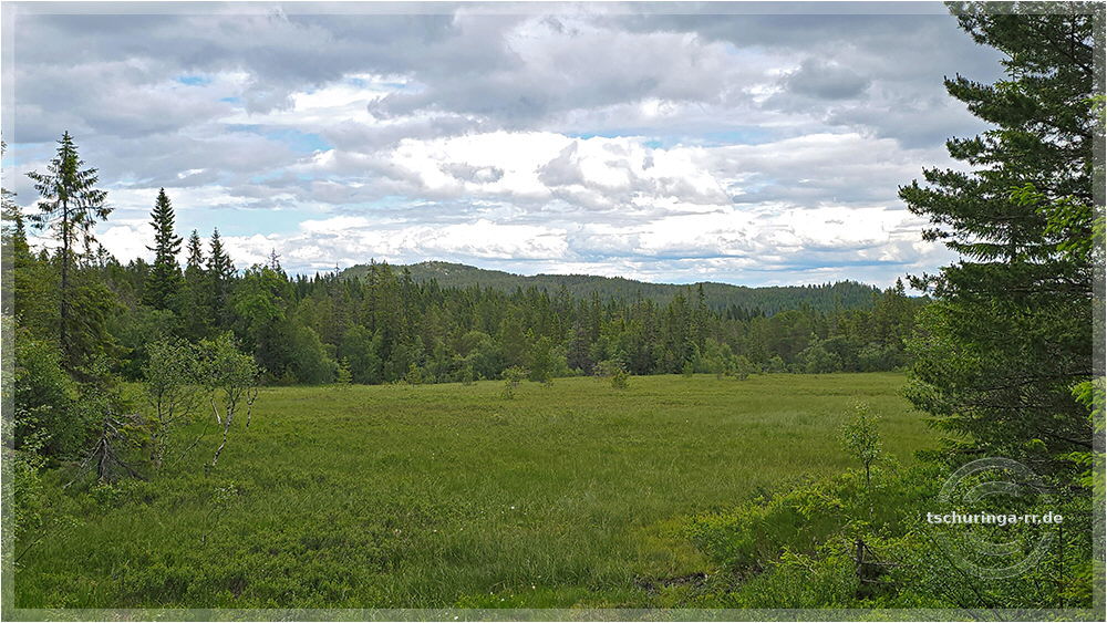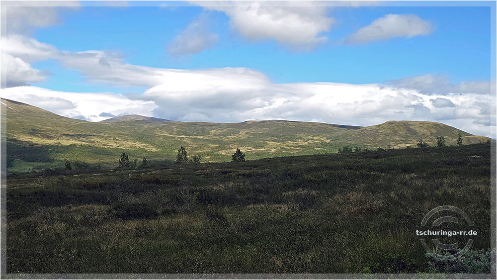 Wir fahren weiter Richtung Trondheim. Aber irgendwie scheint es die hier in der Gegend nicht zu geben. Weiter südlich habe ich schon welche gekauft und auch in zwei weiteren Läden gesehen, aber da die Truhe noch voll war, konnte ich keine mitnehmen. Jetzt ist Platz und nichts zu bekommen. Okay, dann gibt es halt Schwein. Den Hunden ist es sowieso egal, Hauptsache der Bauch wird gefüllt. Friedbert hat einen Parkplatz in der Nähe eines Sees ausgesucht. Als wir dort ankommen entscheiden wir uns dagegen, denn der ist gerammelt voll mit PKWs und Wohnmobilen. Wir fahren lieber noch ein gutes Stück bergauf und kommen auf dem Storsvingen Parkplatz unter, wo nur ein paar PKWs von Wanderern stehen. Am Abend sind wir da ganz allein. Mittags gibt es Kuchen und danach starten wir zu einer schönen Sechs-Kilometer-Wanderung. Unser Wanderweg geht über Loipen. Naja, im Winter sind es Loipen, jetzt teilweise Schotterwege. Wir biegen ab zum See Kobberdammen, den wir umrunden, um dann über die nächste Loipe den Heimweg anzutreten. |