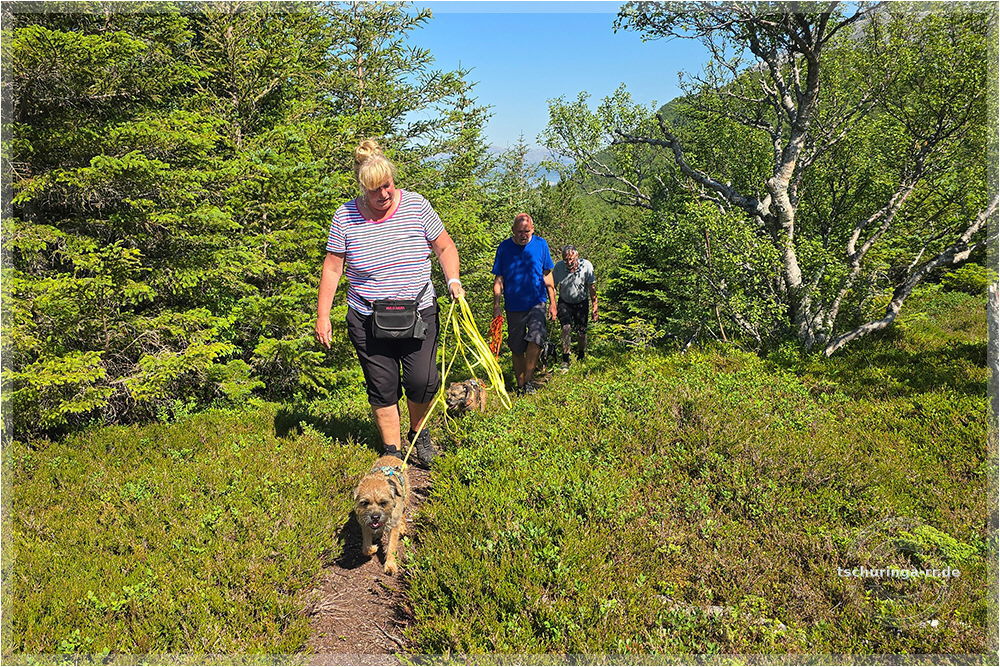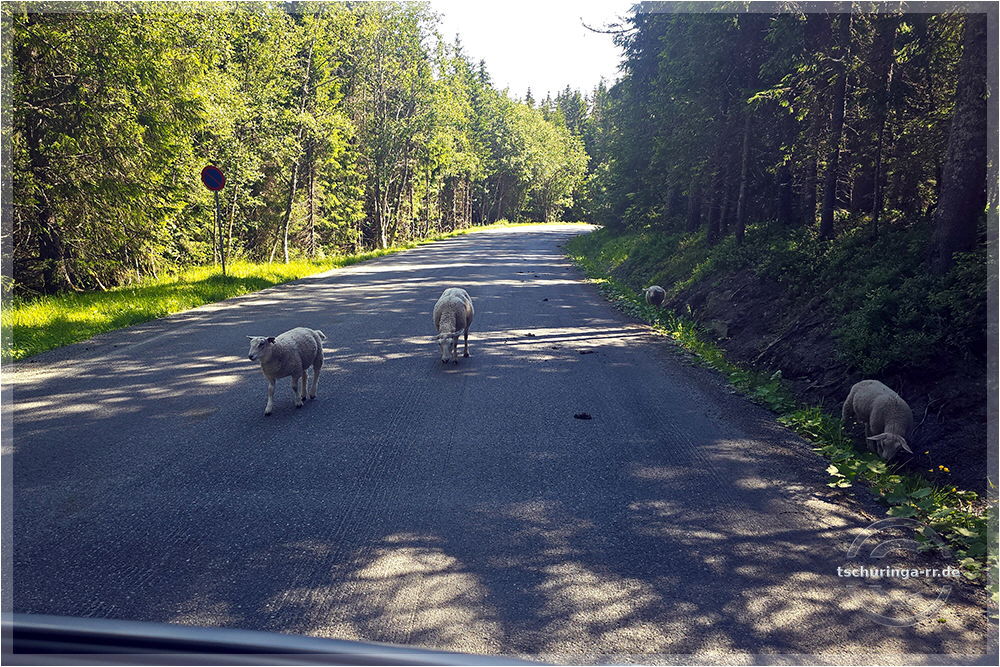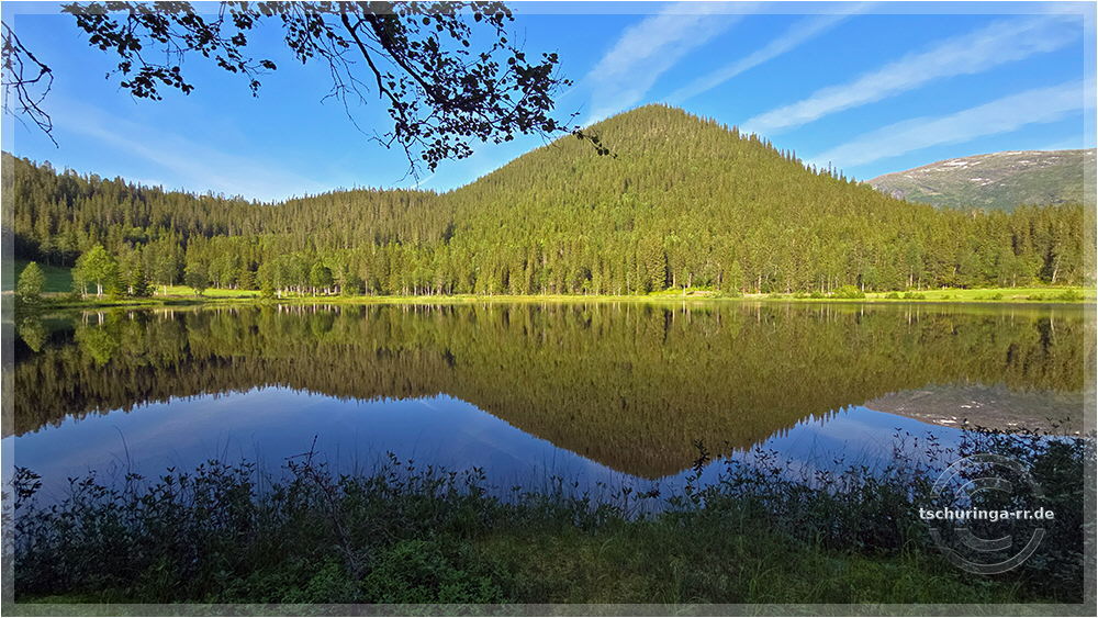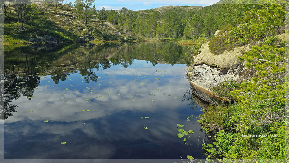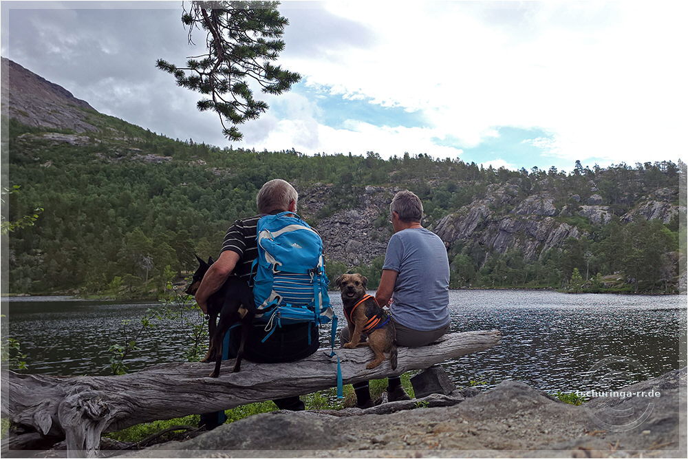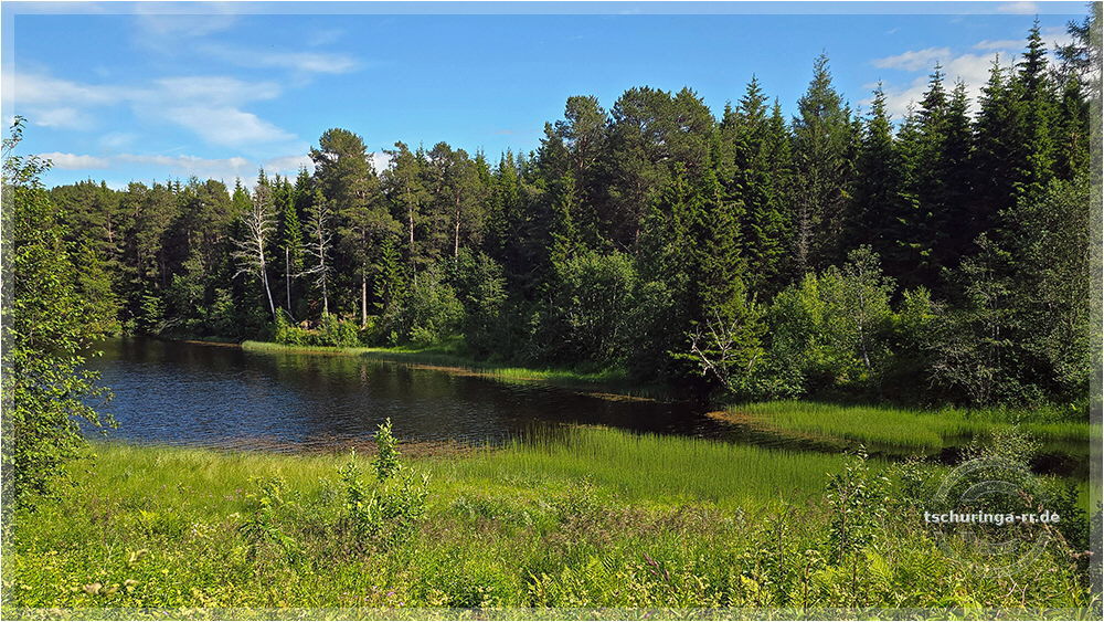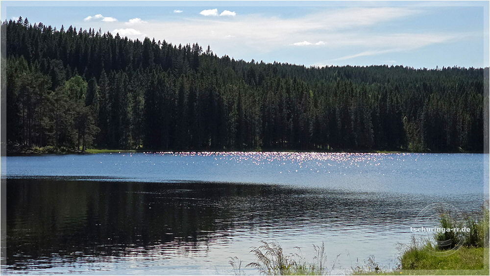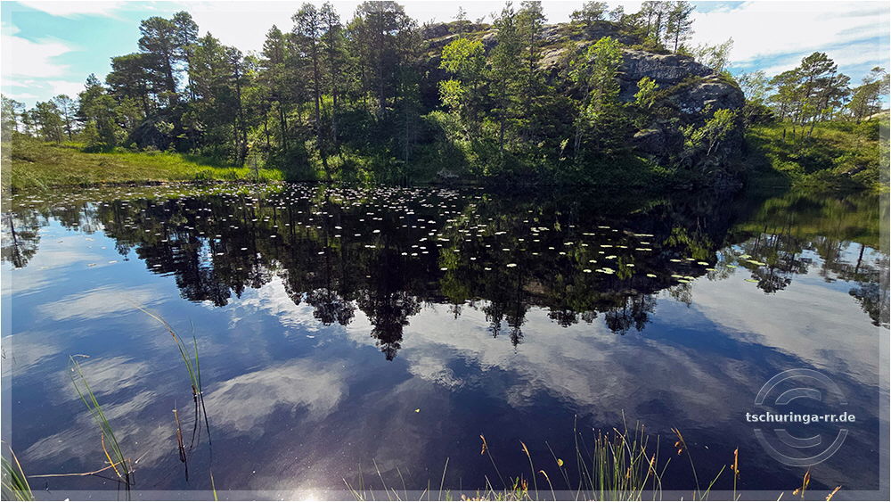 Wir fahren weiter Richtung Trondheim. Aber irgendwie scheint es die hier in der Gegend nicht zu geben. Weiter südlich habe ich schon welche gekauft und auch in zwei weiteren Läden gesehen, aber da die Truhe noch voll war, konnte ich keine mitnehmen. Jetzt ist Platz und nichts zu bekommen. Okay, dann gibt es halt Schwein. Den Hunden ist es sowieso egal, Hauptsache der Bauch wird gefüllt. Friedbert hat einen Parkplatz in der Nähe eines Sees ausgesucht. Als wir dort ankommen entscheiden wir uns dagegen, denn der ist gerammelt voll mit PKWs und Wohnmobilen. Wir fahren lieber noch ein gutes Stück bergauf und kommen auf dem Storsvingen Parkplatz unter, wo nur ein paar PKWs von Wanderern stehen. Am Abend sind wir da ganz allein. Mittags gibt es Kuchen und danach starten wir zu einer schönen Sechs-Kilometer-Wanderung. Unser Wanderweg geht über Loipen. Naja, im Winter sind es Loipen, jetzt teilweise Schotterwege. Wir biegen ab zum See Kobberdammen, den wir umrunden, um dann über die nächste Loipe den Heimweg anzutreten. |