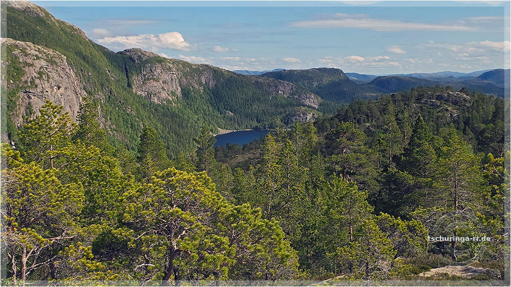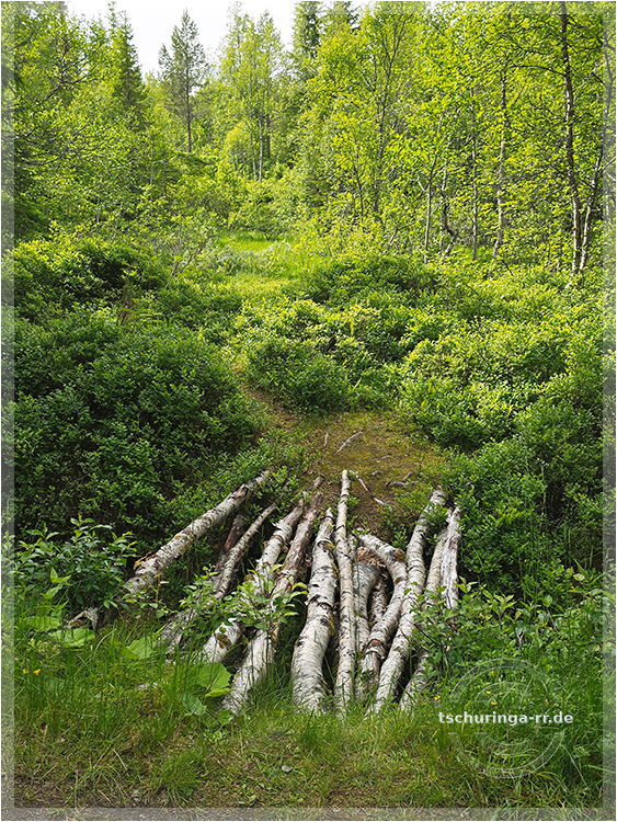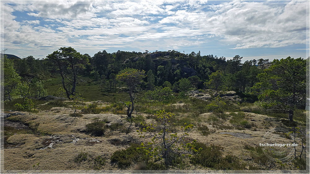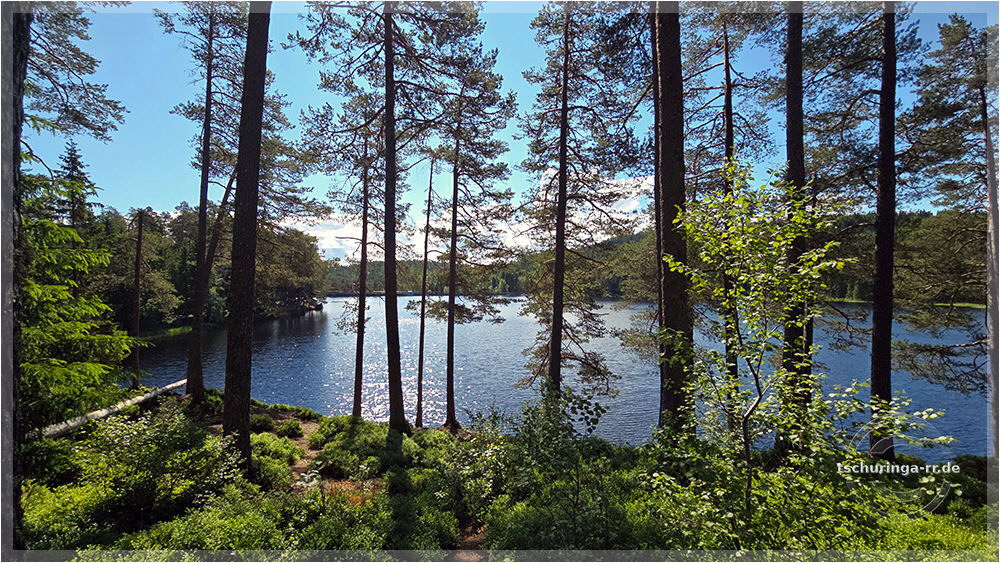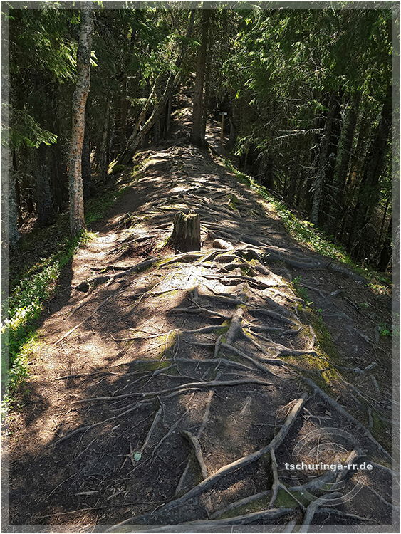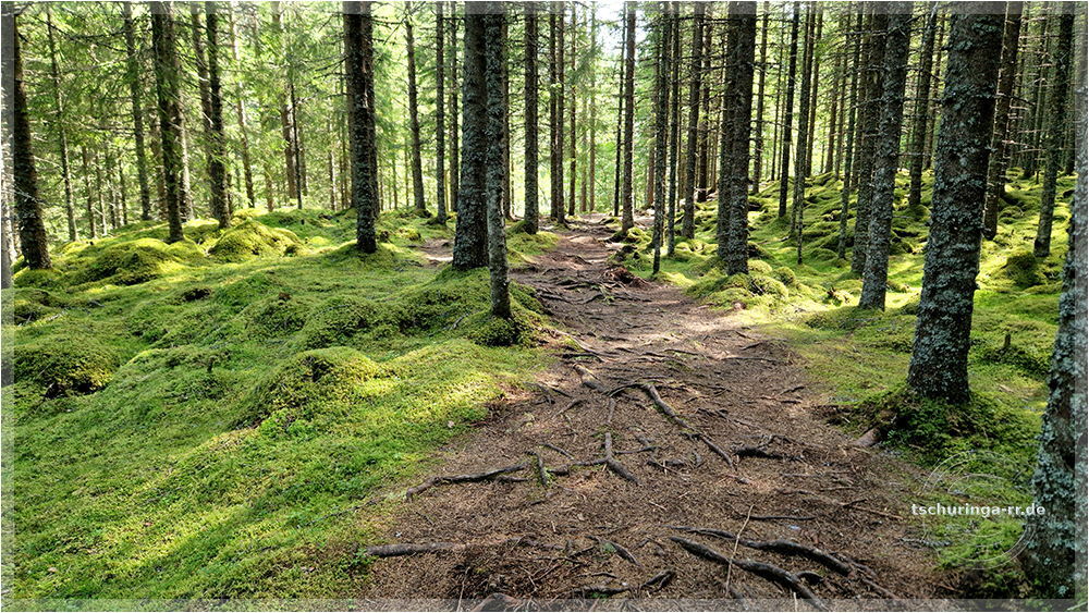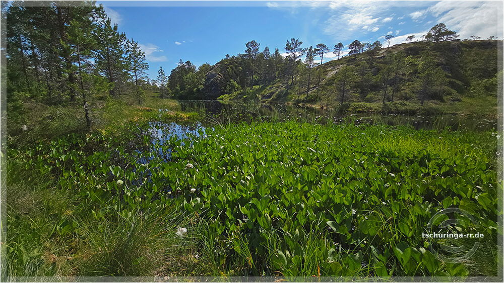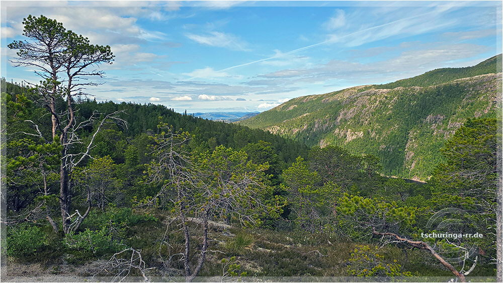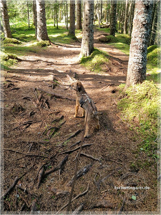 Wir fahren weiter Richtung Trondheim. Aber irgendwie scheint es die hier in der Gegend nicht zu geben. Weiter südlich habe ich schon welche gekauft und auch in zwei weiteren Läden gesehen, aber da die Truhe noch voll war, konnte ich keine mitnehmen. Jetzt ist Platz und nichts zu bekommen. Okay, dann gibt es halt Schwein. Den Hunden ist es sowieso egal, Hauptsache der Bauch wird gefüllt. Friedbert hat einen Parkplatz in der Nähe eines Sees ausgesucht. Als wir dort ankommen entscheiden wir uns dagegen, denn der ist gerammelt voll mit PKWs und Wohnmobilen. Wir fahren lieber noch ein gutes Stück bergauf und kommen auf dem Storsvingen Parkplatz unter, wo nur ein paar PKWs von Wanderern stehen. Am Abend sind wir da ganz allein. Mittags gibt es Kuchen und danach starten wir zu einer schönen Sechs-Kilometer-Wanderung. Unser Wanderweg geht über Loipen. Naja, im Winter sind es Loipen, jetzt teilweise Schotterwege. Wir biegen ab zum See Kobberdammen, den wir umrunden, um dann über die nächste Loipe den Heimweg anzutreten. |