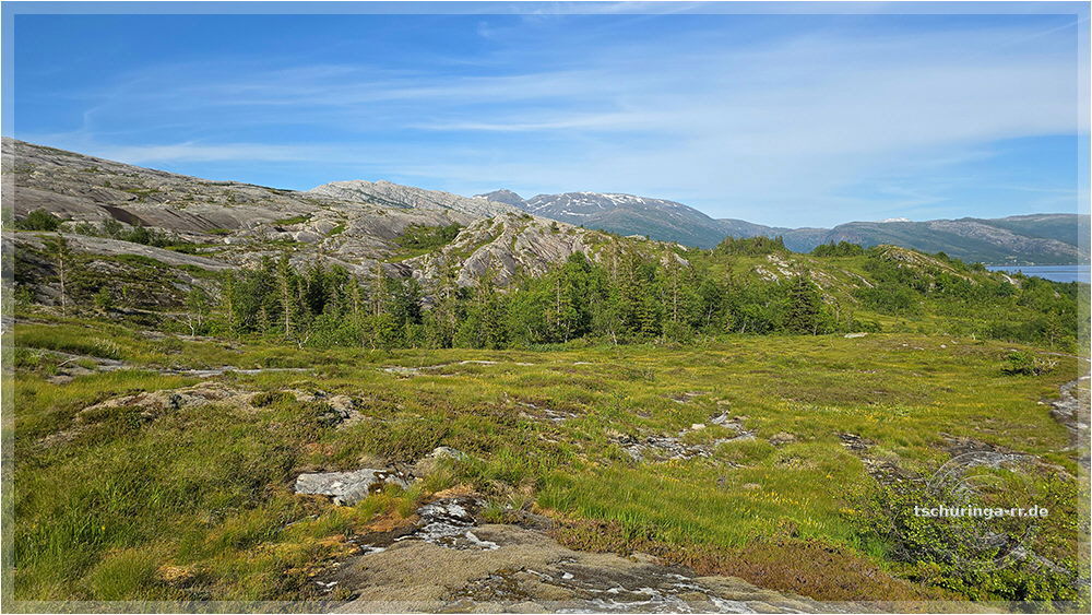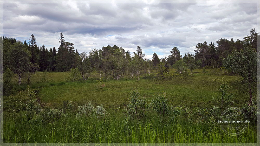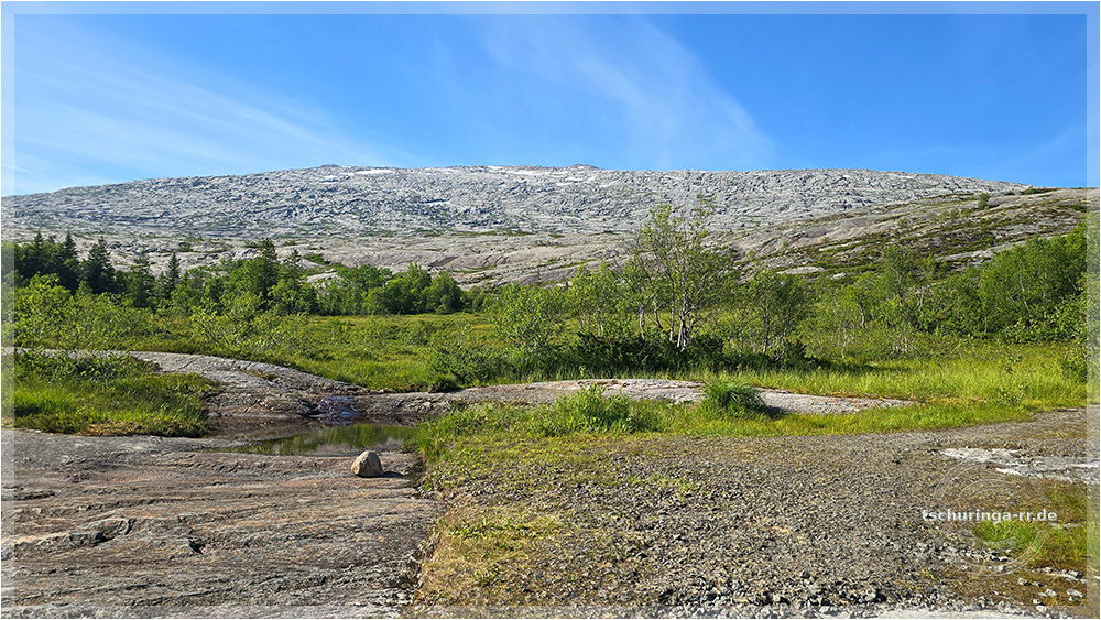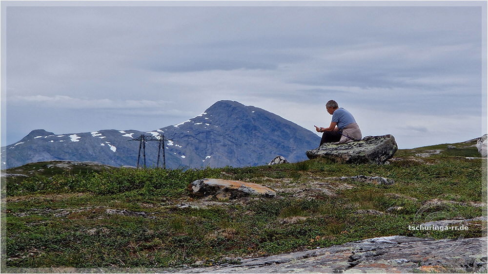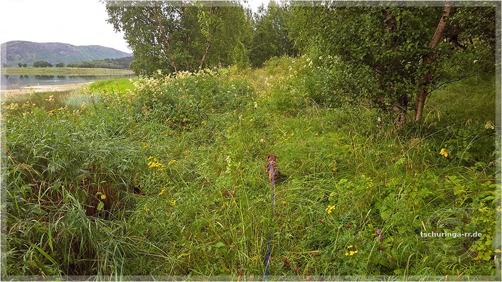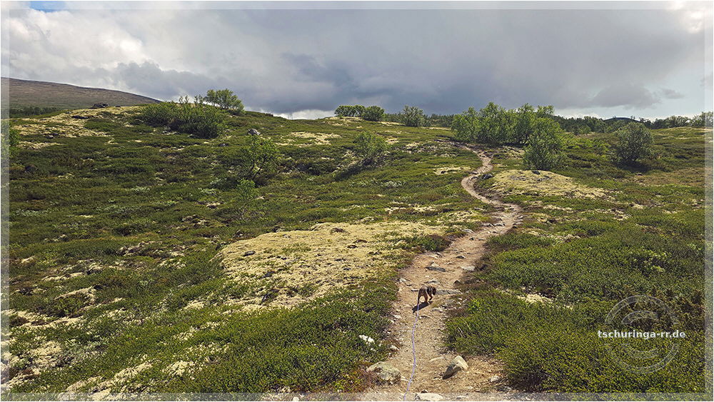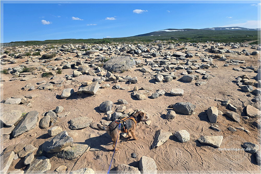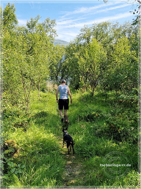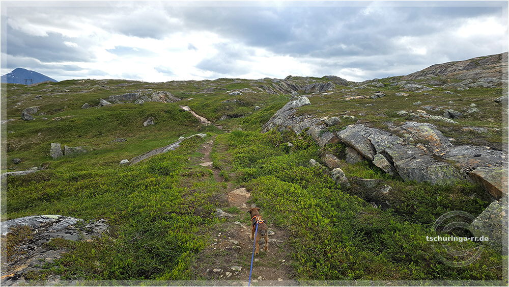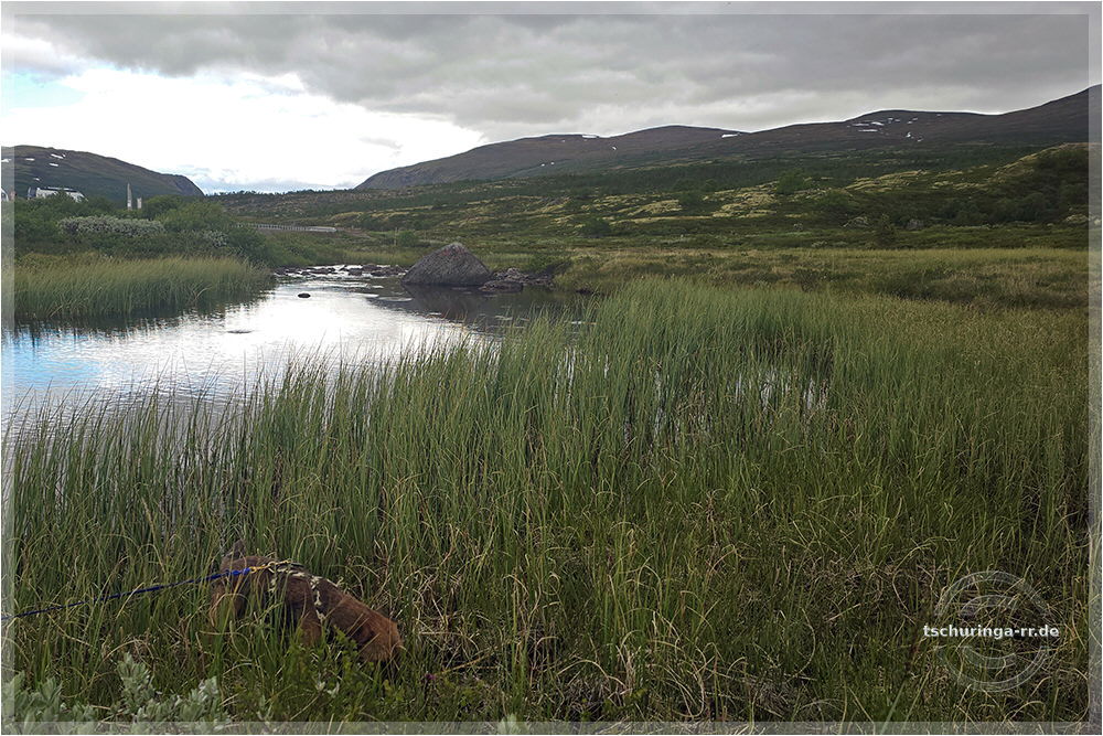 Nach einer größeren Waschaktion, weil Una ihre Box vollgek*tzt hat, laufe ich mit beiden Hunden eine kleine Gassirunde. Danach wollen wir eigentlich auf der anderen Seite der E6 wandern. Weit kommen wir allerdings nicht, denn kurz hinter dem Fluss Gubbeltædno steht ein Verbotsschild. Also heißt es: Umdrehen. Wir fahren weiter und lassen uns auf einem kleinen Parkplatz bei Storjord nieder. Nach dem Mittagessen starten wir zu einer Wanderung. Zuerst erkunden wir den Trampelpfad hinter dem Womo, der aber nach gut 100 Metern endet. Als wir zurück kommen ist "Manni" nicht mehr allein. Nach kurzem Gespräch mit den neuen Nachbarn wandern wir zum See Tjernfjelltjønna, den wir auf teilweise nicht vorhandem Pfad umrunden. Zum Teil geht es über Felsbrocken. Da läuft wohl sonst auch niemand her, denn die Angler nutzen eher die ausgetretenen Trampelpfade. |