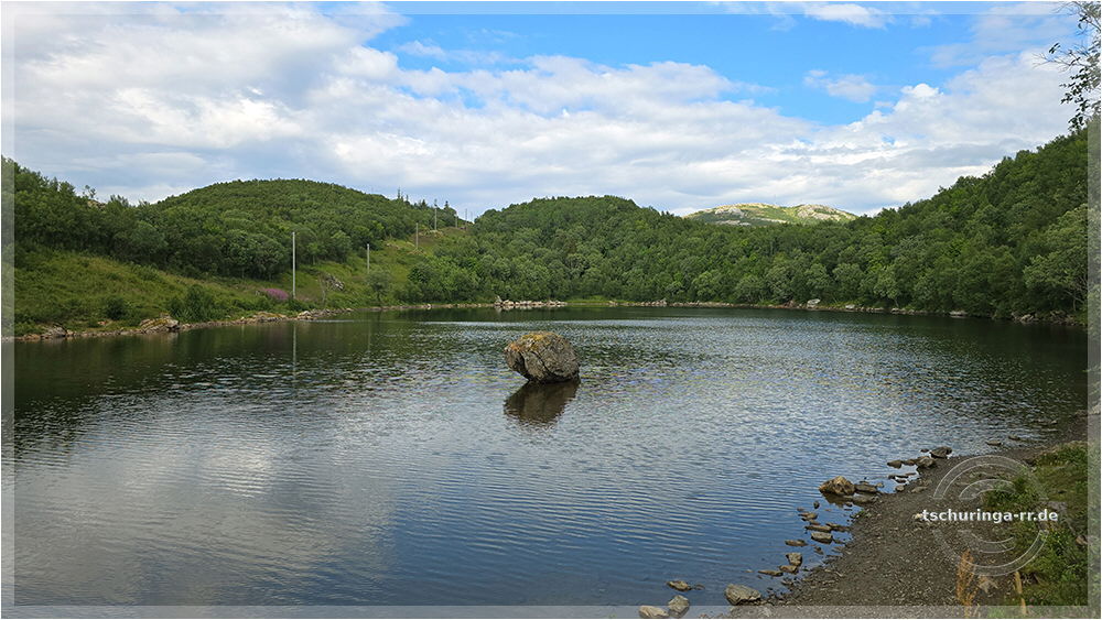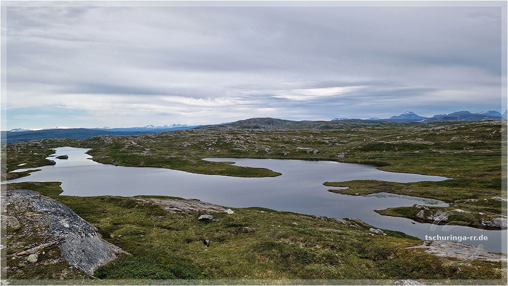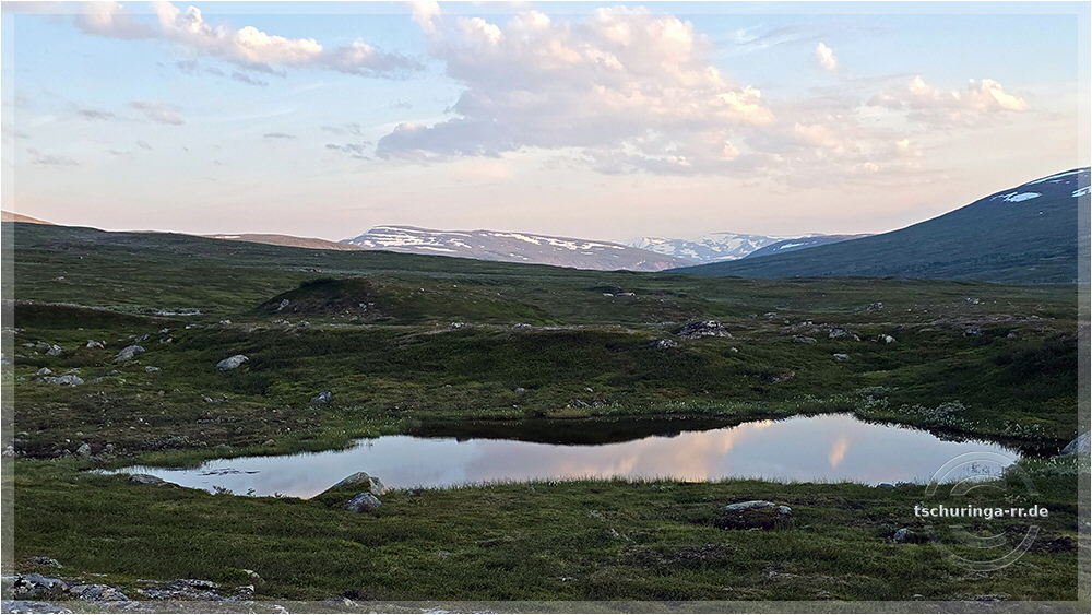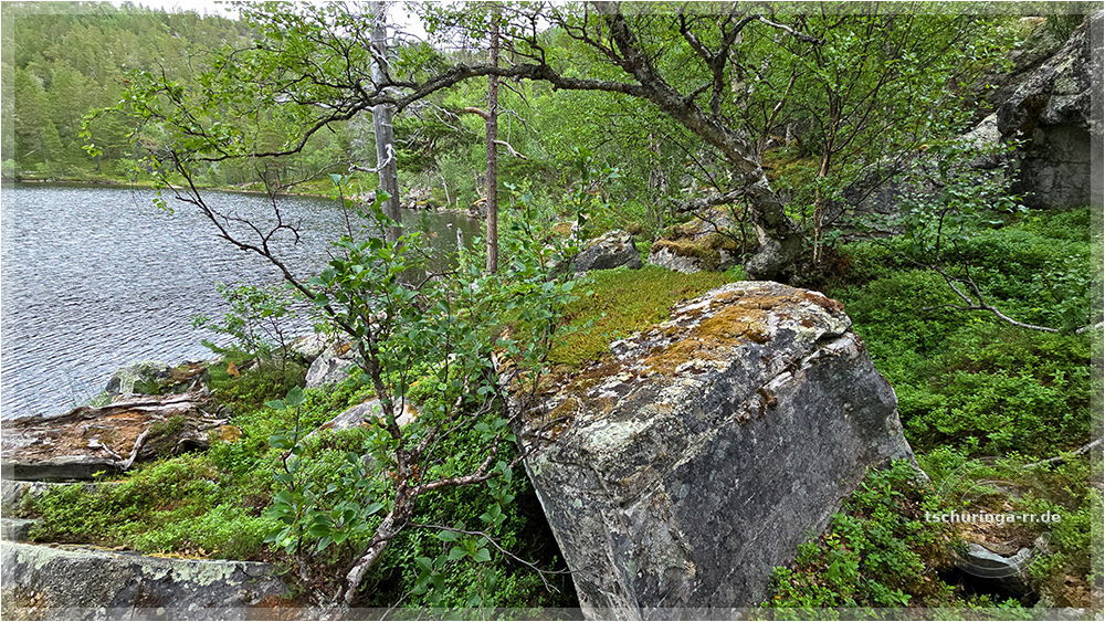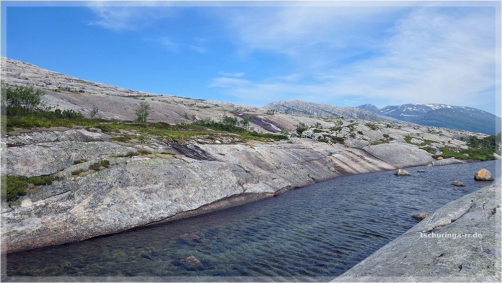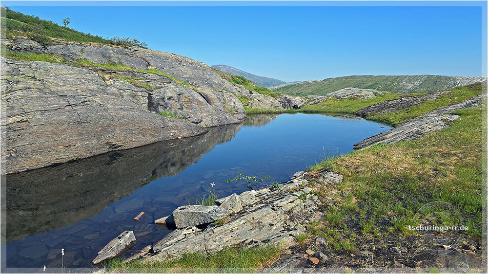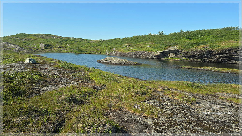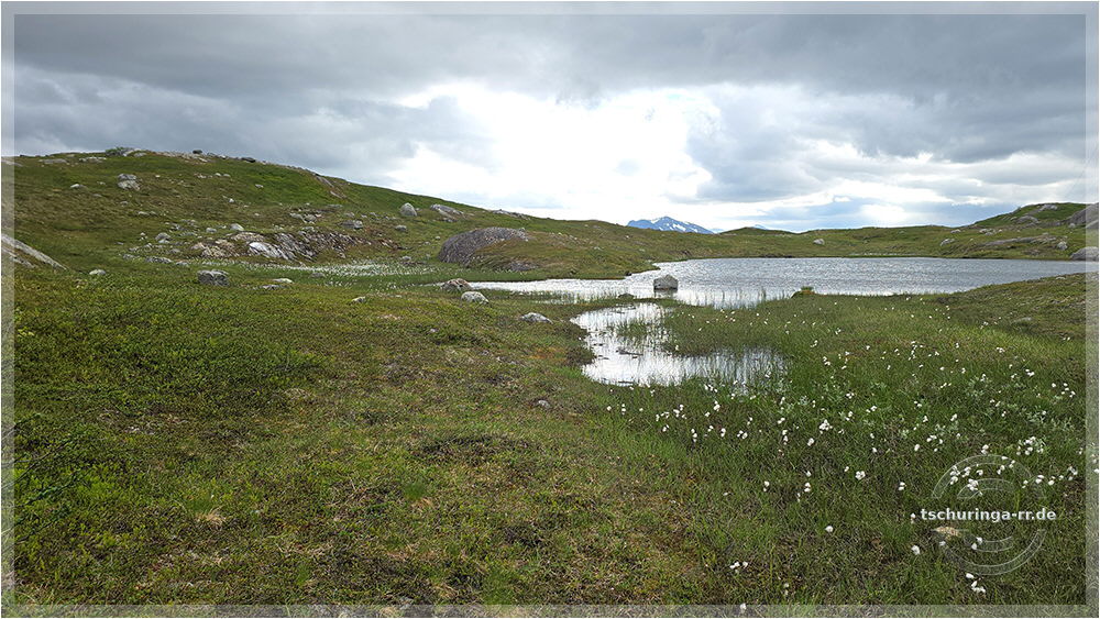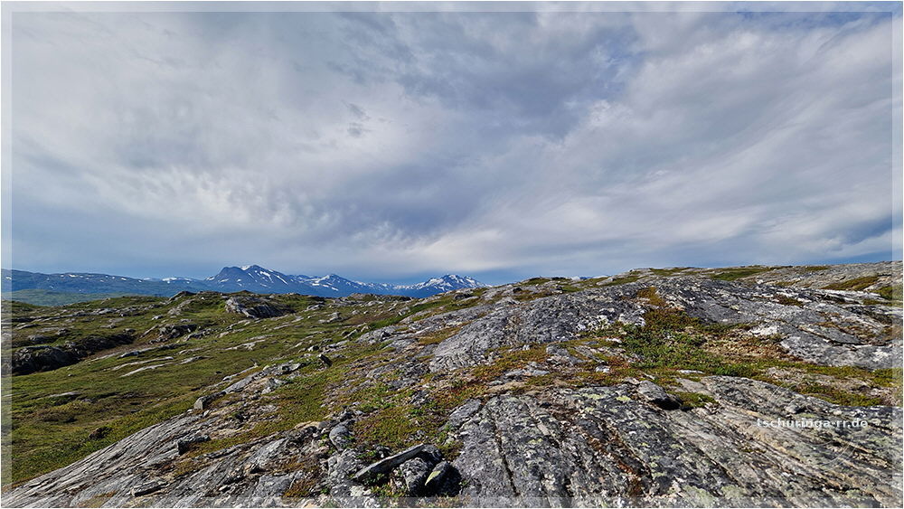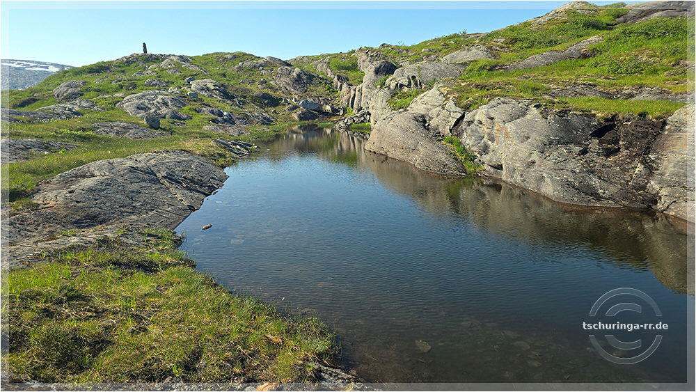 Nach einer größeren Waschaktion, weil Una ihre Box vollgek*tzt hat, laufe ich mit beiden Hunden eine kleine Gassirunde. Danach wollen wir eigentlich auf der anderen Seite der E6 wandern. Weit kommen wir allerdings nicht, denn kurz hinter dem Fluss Gubbeltædno steht ein Verbotsschild. Also heißt es: Umdrehen. Wir fahren weiter und lassen uns auf einem kleinen Parkplatz bei Storjord nieder. Nach dem Mittagessen starten wir zu einer Wanderung. Zuerst erkunden wir den Trampelpfad hinter dem Womo, der aber nach gut 100 Metern endet. Als wir zurück kommen ist "Manni" nicht mehr allein. Nach kurzem Gespräch mit den neuen Nachbarn wandern wir zum See Tjernfjelltjønna, den wir auf teilweise nicht vorhandem Pfad umrunden. Zum Teil geht es über Felsbrocken. Da läuft wohl sonst auch niemand her, denn die Angler nutzen eher die ausgetretenen Trampelpfade. |