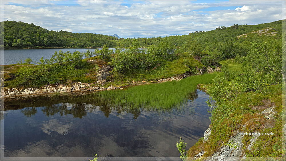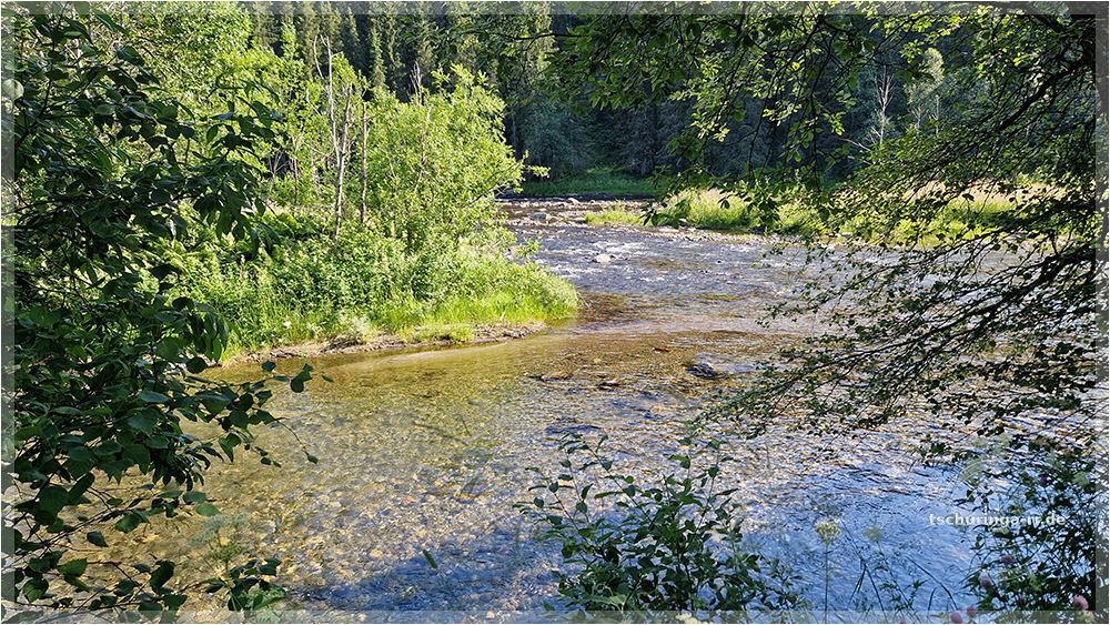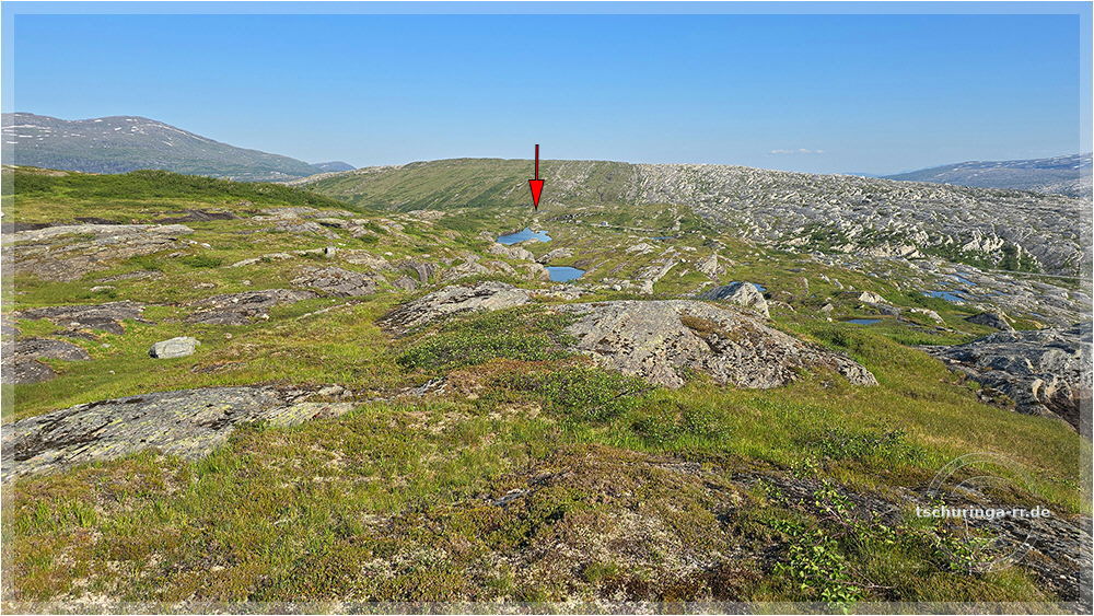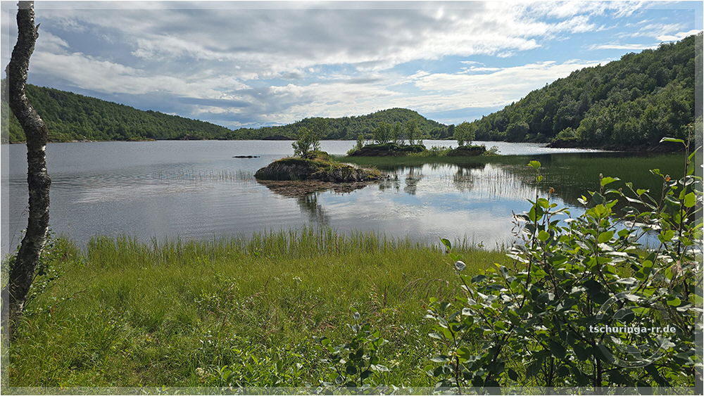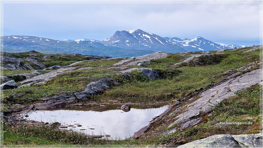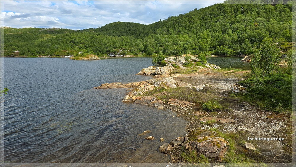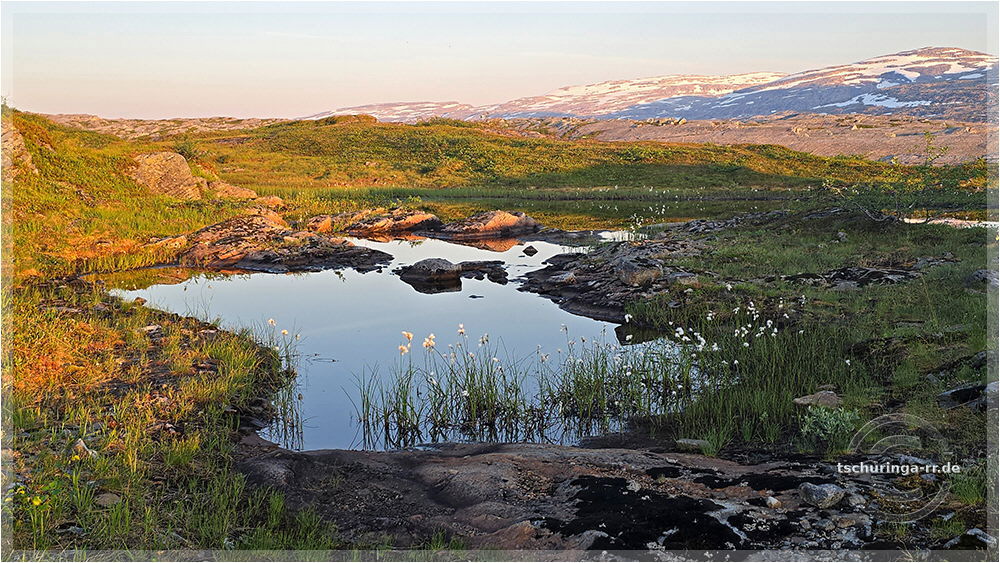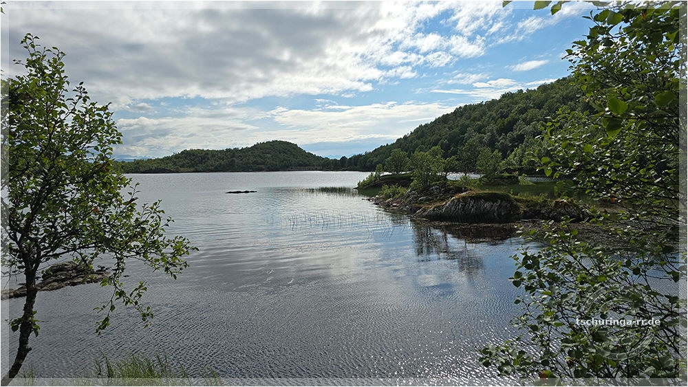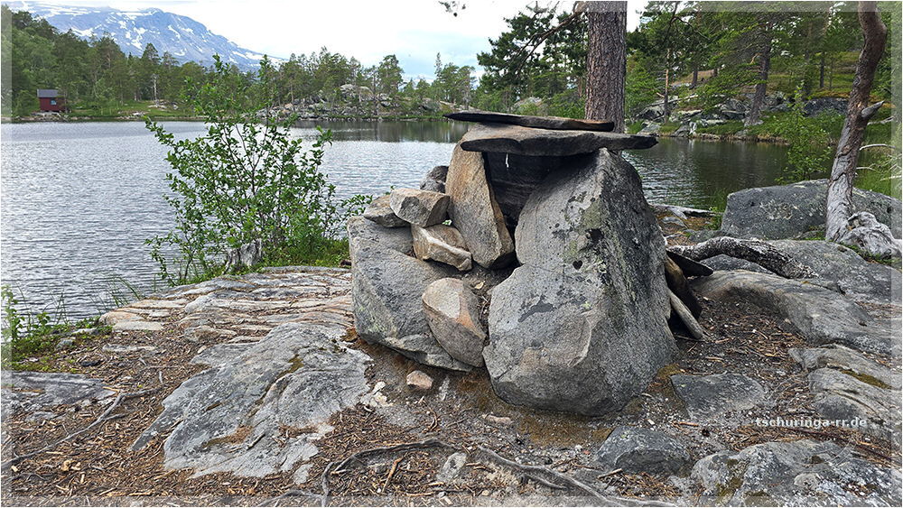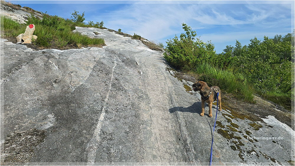 Nach einer größeren Waschaktion, weil Una ihre Box vollgek*tzt hat, laufe ich mit beiden Hunden eine kleine Gassirunde. Danach wollen wir eigentlich auf der anderen Seite der E6 wandern. Weit kommen wir allerdings nicht, denn kurz hinter dem Fluss Gubbeltædno steht ein Verbotsschild. Also heißt es: Umdrehen. Wir fahren weiter und lassen uns auf einem kleinen Parkplatz bei Storjord nieder. Nach dem Mittagessen starten wir zu einer Wanderung. Zuerst erkunden wir den Trampelpfad hinter dem Womo, der aber nach gut 100 Metern endet. Als wir zurück kommen ist "Manni" nicht mehr allein. Nach kurzem Gespräch mit den neuen Nachbarn wandern wir zum See Tjernfjelltjønna, den wir auf teilweise nicht vorhandem Pfad umrunden. Zum Teil geht es über Felsbrocken. Da läuft wohl sonst auch niemand her, denn die Angler nutzen eher die ausgetretenen Trampelpfade. |