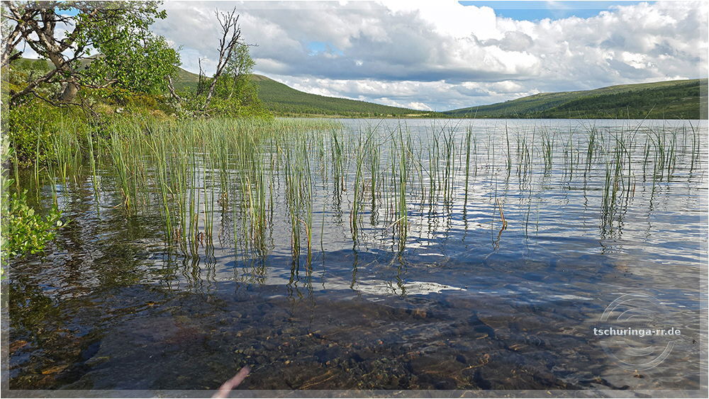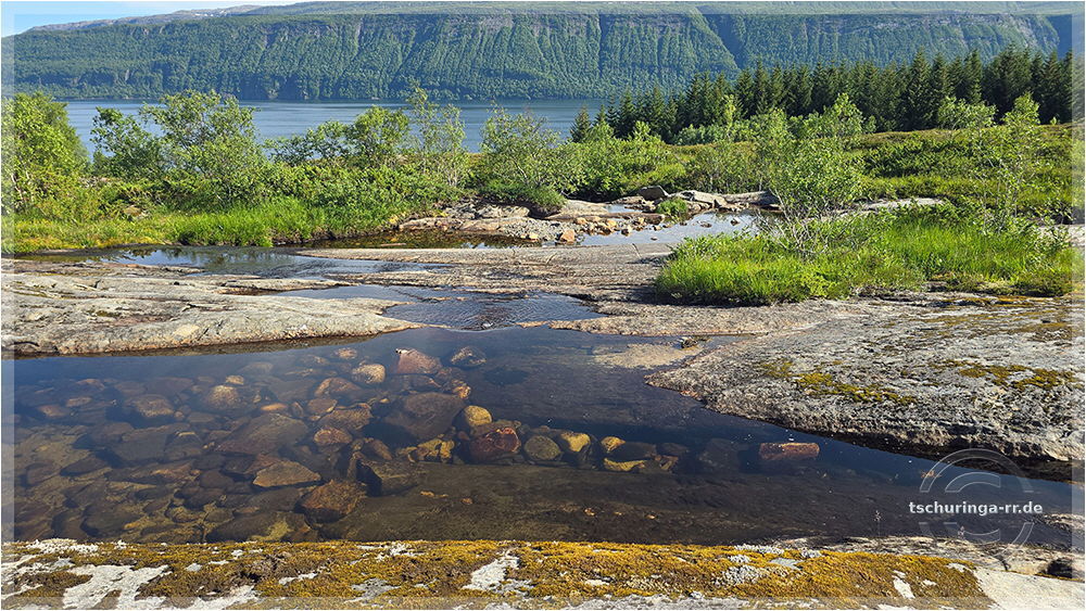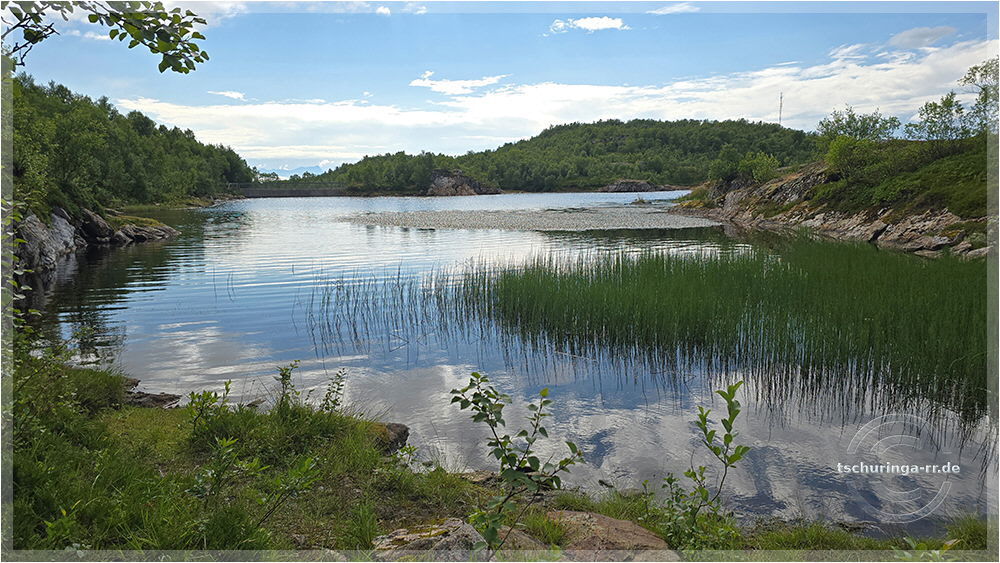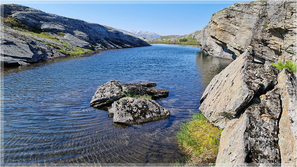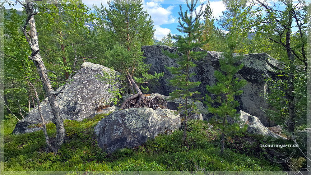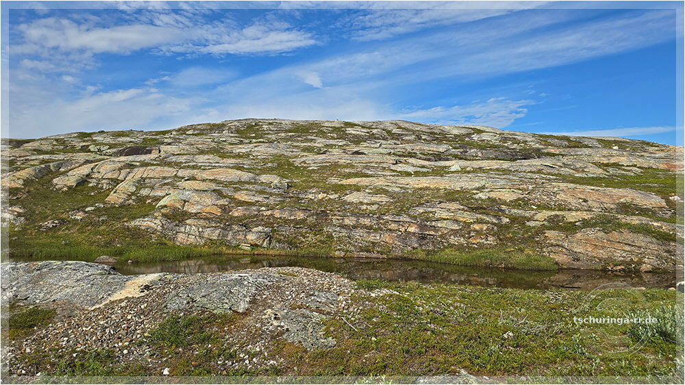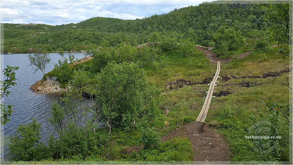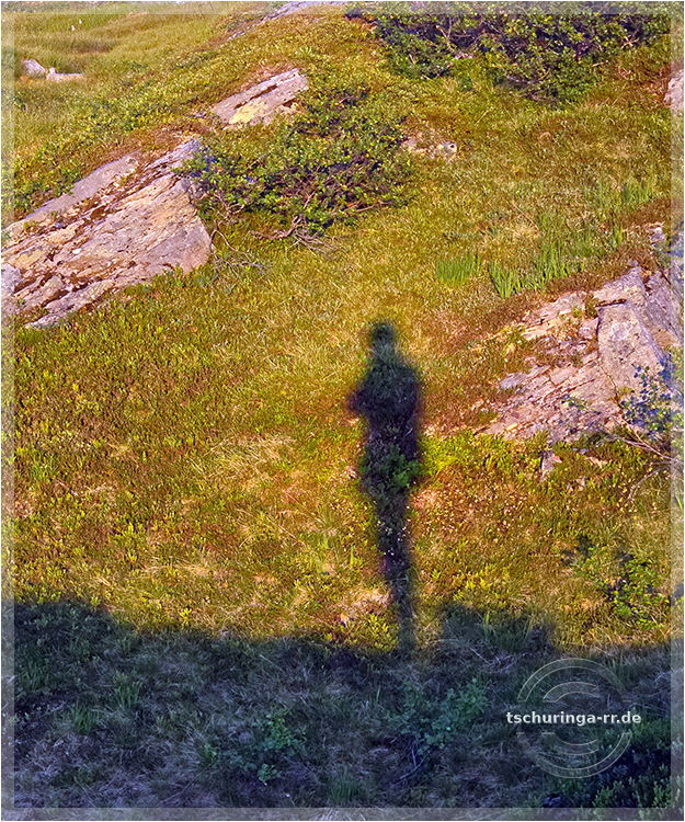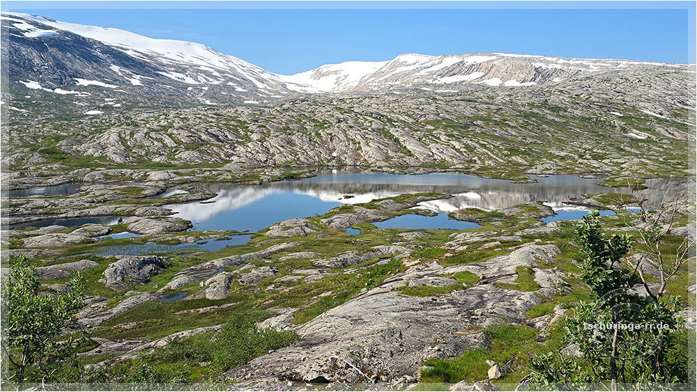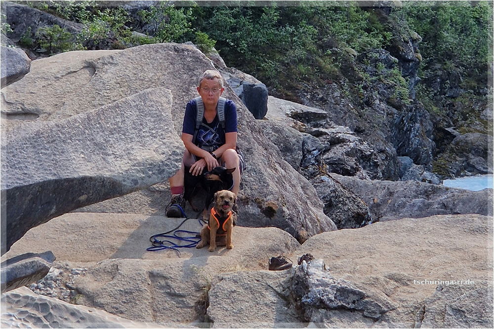 Nach einer größeren Waschaktion, weil Una ihre Box vollgek*tzt hat, laufe ich mit beiden Hunden eine kleine Gassirunde. Danach wollen wir eigentlich auf der anderen Seite der E6 wandern. Weit kommen wir allerdings nicht, denn kurz hinter dem Fluss Gubbeltædno steht ein Verbotsschild. Also heißt es: Umdrehen. Wir fahren weiter und lassen uns auf einem kleinen Parkplatz bei Storjord nieder. Nach dem Mittagessen starten wir zu einer Wanderung. Zuerst erkunden wir den Trampelpfad hinter dem Womo, der aber nach gut 100 Metern endet. Als wir zurück kommen ist "Manni" nicht mehr allein. Nach kurzem Gespräch mit den neuen Nachbarn wandern wir zum See Tjernfjelltjønna, den wir auf teilweise nicht vorhandem Pfad umrunden. Zum Teil geht es über Felsbrocken. Da läuft wohl sonst auch niemand her, denn die Angler nutzen eher die ausgetretenen Trampelpfade. |