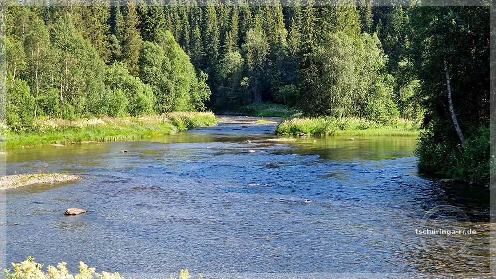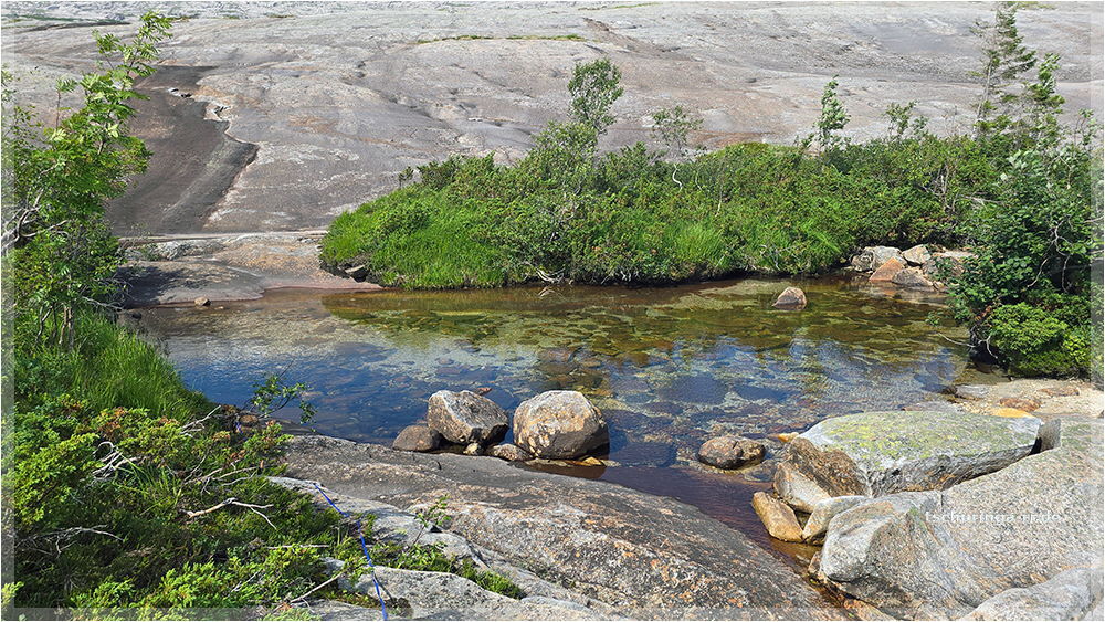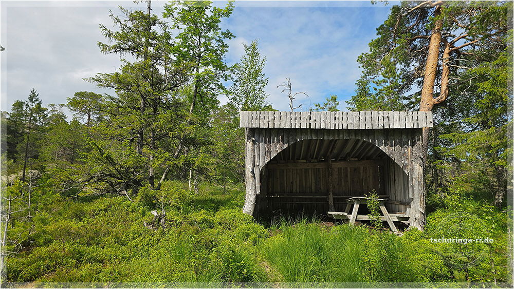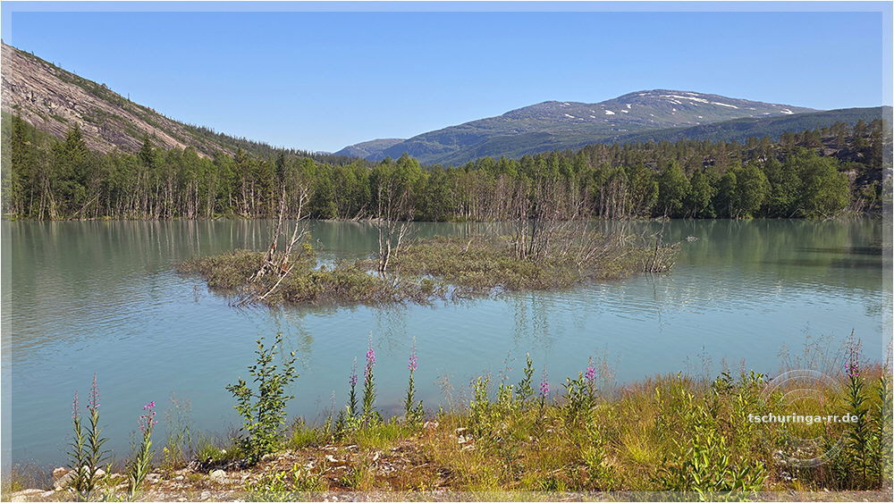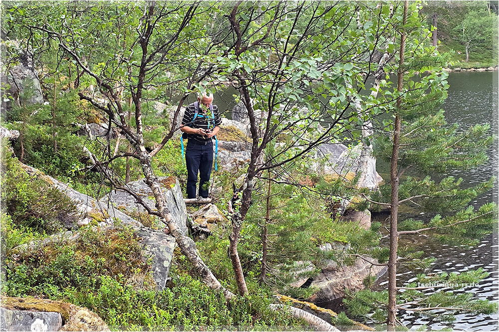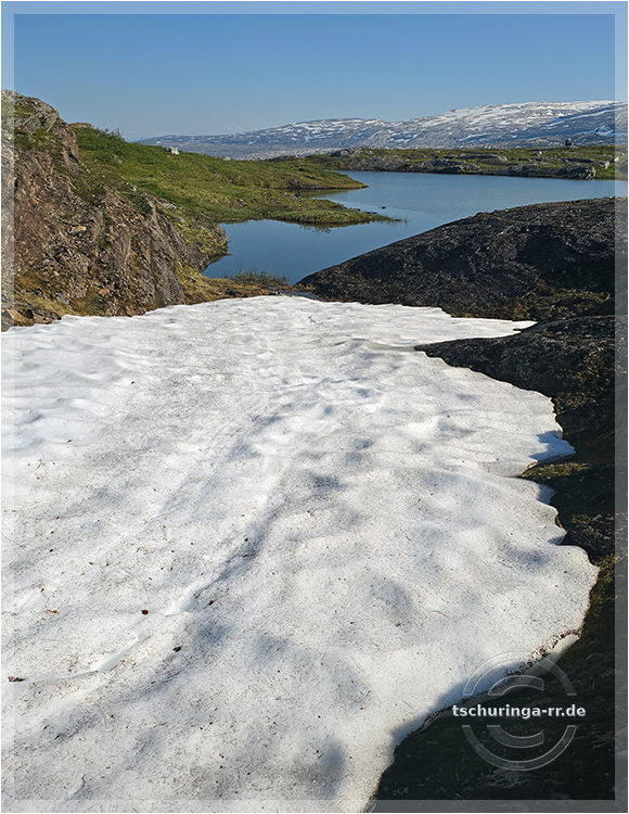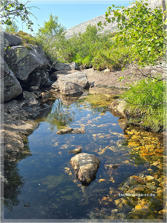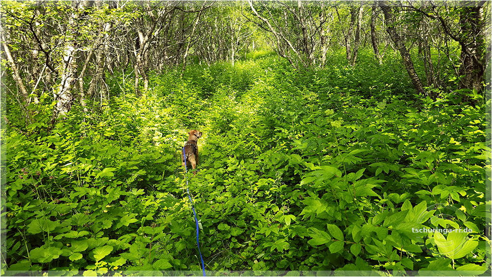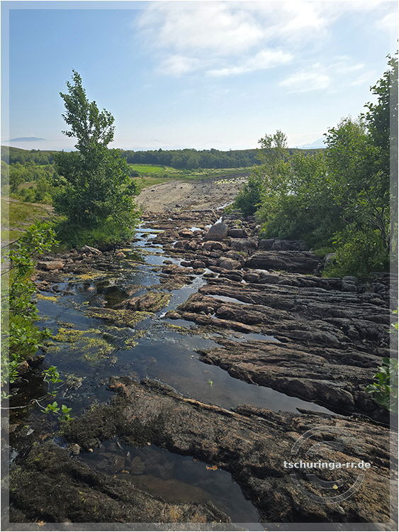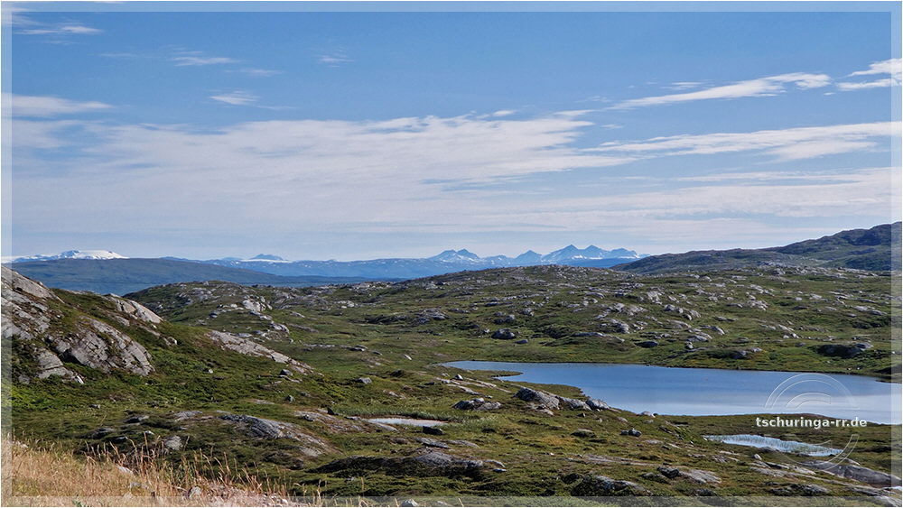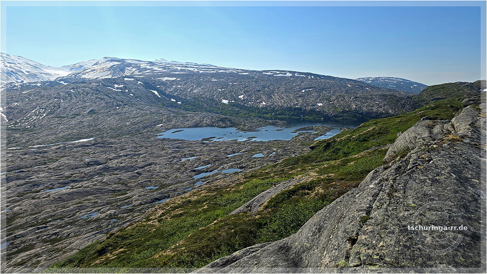 Nach einer größeren Waschaktion, weil Una ihre Box vollgek*tzt hat, laufe ich mit beiden Hunden eine kleine Gassirunde. Danach wollen wir eigentlich auf der anderen Seite der E6 wandern. Weit kommen wir allerdings nicht, denn kurz hinter dem Fluss Gubbeltædno steht ein Verbotsschild. Also heißt es: Umdrehen. Wir fahren weiter und lassen uns auf einem kleinen Parkplatz bei Storjord nieder. Nach dem Mittagessen starten wir zu einer Wanderung. Zuerst erkunden wir den Trampelpfad hinter dem Womo, der aber nach gut 100 Metern endet. Als wir zurück kommen ist "Manni" nicht mehr allein. Nach kurzem Gespräch mit den neuen Nachbarn wandern wir zum See Tjernfjelltjønna, den wir auf teilweise nicht vorhandem Pfad umrunden. Zum Teil geht es über Felsbrocken. Da läuft wohl sonst auch niemand her, denn die Angler nutzen eher die ausgetretenen Trampelpfade. |