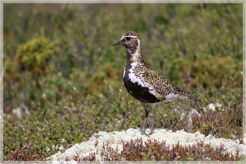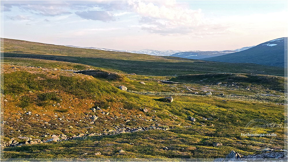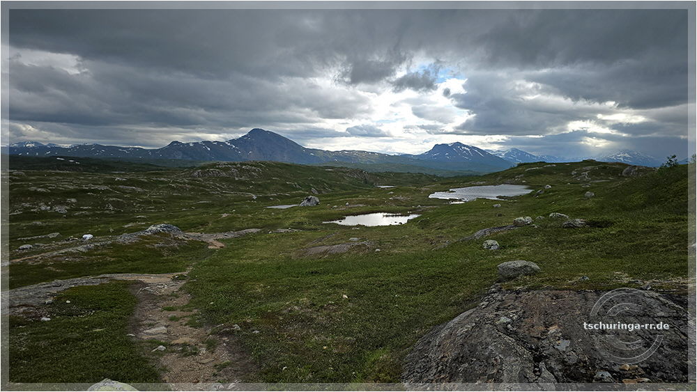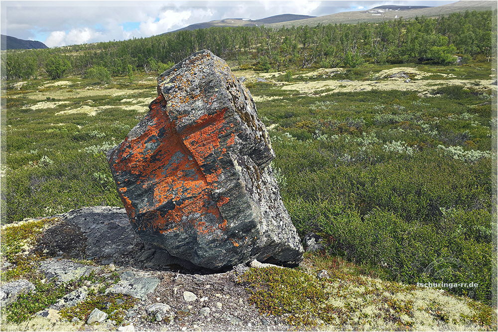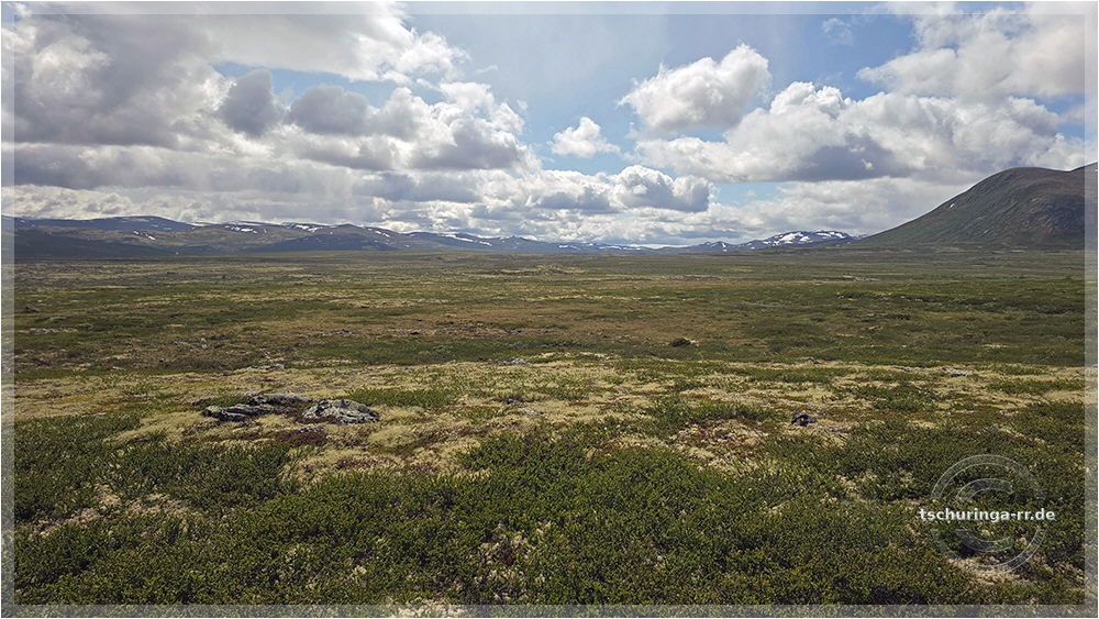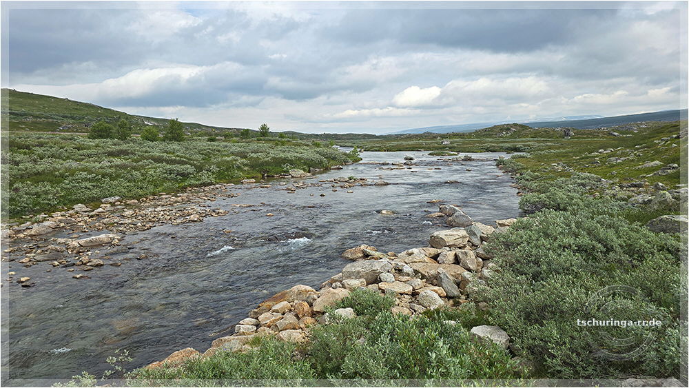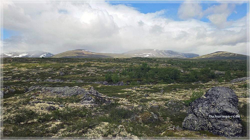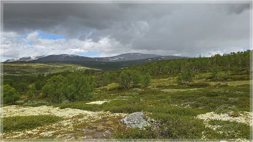 Heute geht es bereits am Vormittag los, denn das Wetter soll (angeblich) nachmittags unbeständiger sein. Wir sind wieder auf dem Kongevegen unterwegs, diesmal aber in die andere Richtung. Allzu weit kommen wir allerdings nicht. Zuerst treffen wir auf einen Goldregenpfeifer, der uns von seinem Nest ablenken will. Da muss ich natürlich fotografieren. Danach kommt der Regen immer näher und wir drehen um, denn auf "klatschnass" haben wir keine Lust. Es bleibt aber trocken und wir sehen den Guss nur aus der Ferne. Das Wetter ist besser als vorhergesagt, dehalb laufen wir am Nachmittag ein Stück des Weges von Vorgestern. Über den Gåvålivegen, am Ufer des Gåvålivann. Auf dem Rückweg biegen wir am Schneefanggitter ab, weil wir schauen wollen, wo die Brücke über die Svone führt. Denn die wollen wir morgen überqueren, um auf der anderen Seite zu wandern. Vorausgesetzt, dass Wetter hält sich an die Vorhersagen. |