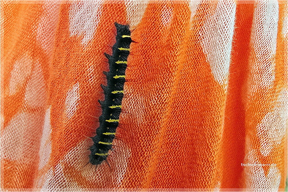 | Das verlorene Halstuch, das jemand in einen Busch gehängt hat, scheint diese Raupe des Brombeerspinners toll zu finden. |