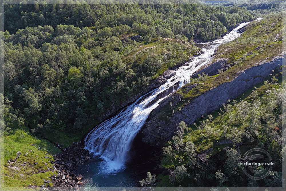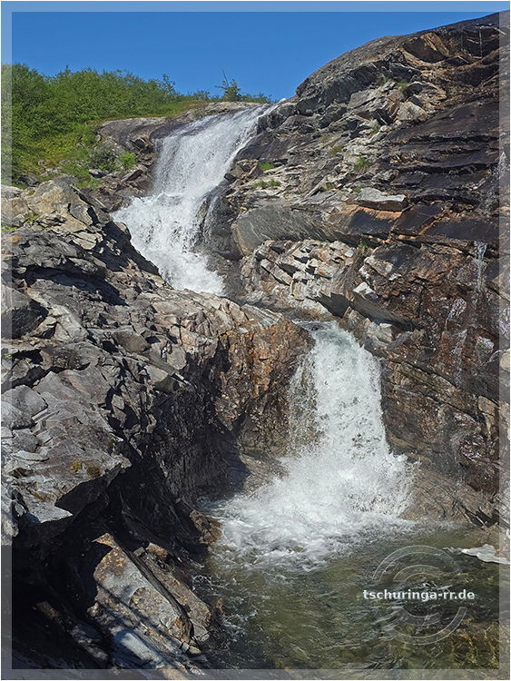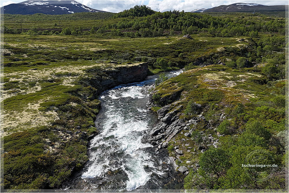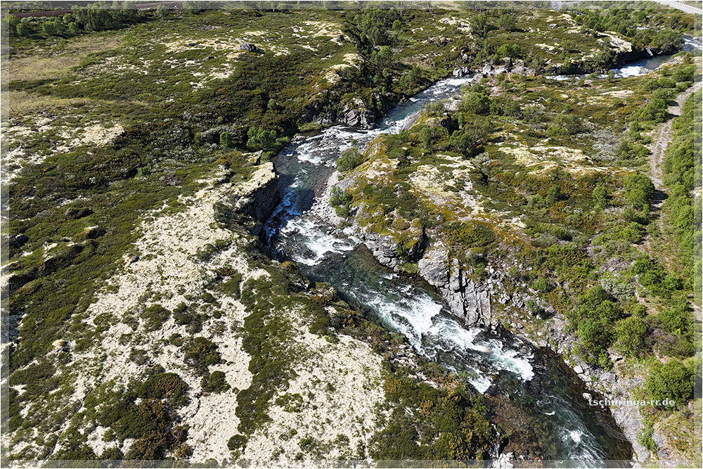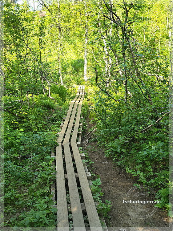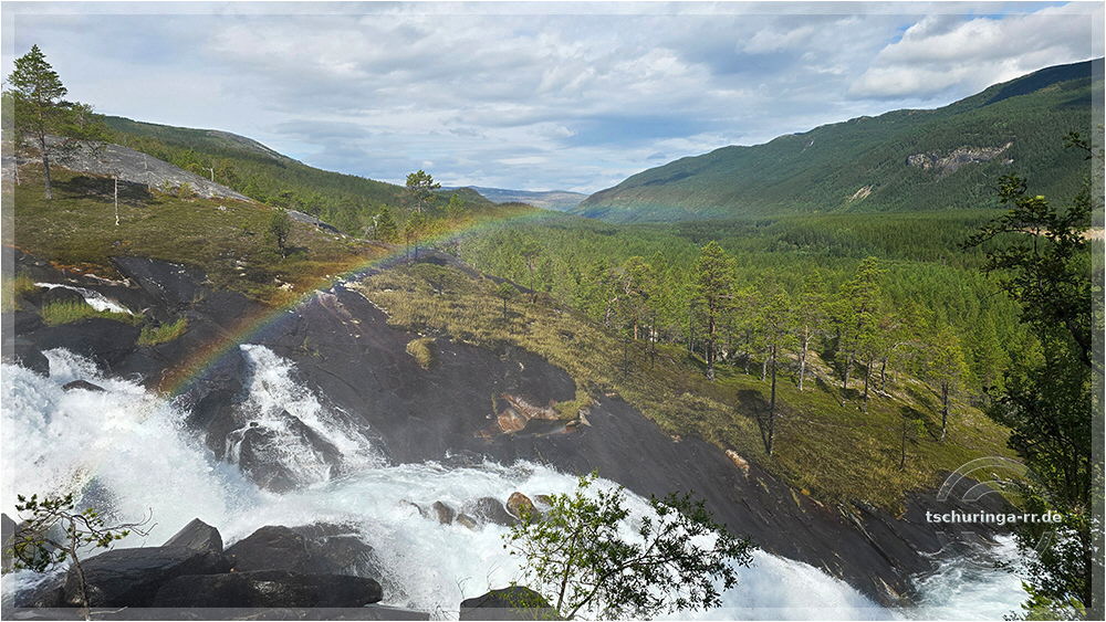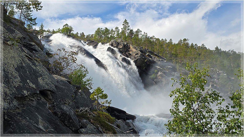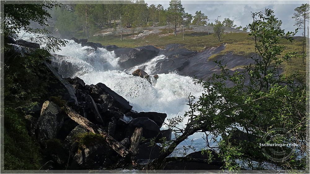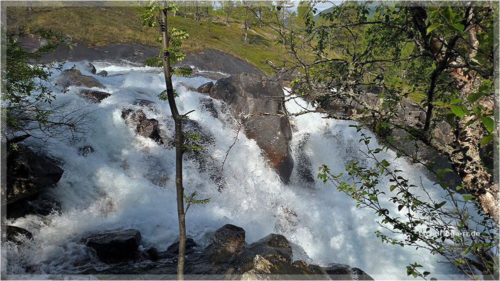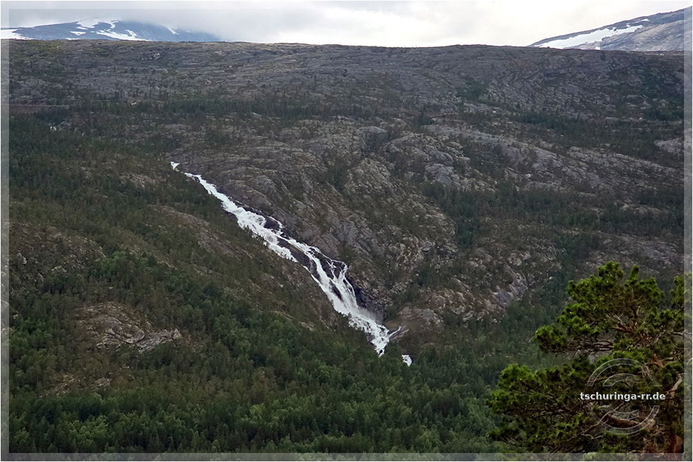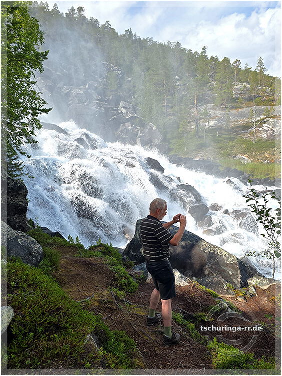Wir fahren das Nordland Nasjonalparksenter an, wo wir aber uns nur kurz umsehen. Auf einem kleinen Parkplatz in der Nähe stellen wir "Manni" ab und wandern zum Kjemåfossen. Etwa 60 Meter steigen wir nach oben, drehen dann aber nach etlichen Fotos wieder um. Auf dem Parkplatz machen wir Mittagspause, fahren dann weiter bis zum Reinhornheia Tunnel und lassen uns auf dem Parkplatz davor nieder. Nach Kaffee und Cappuccino mit leckeren Plätzchen ziehen wir noch mal los. Allerdings beginnt es bald zu regnen, so dass die Tour nicht allzu lang wird. |