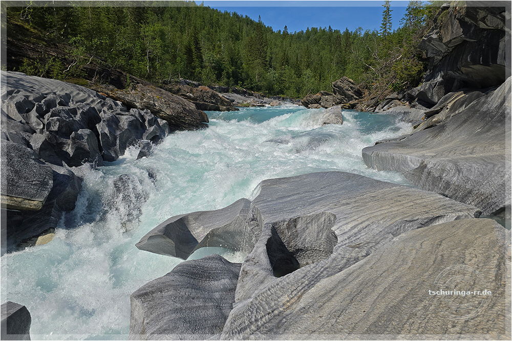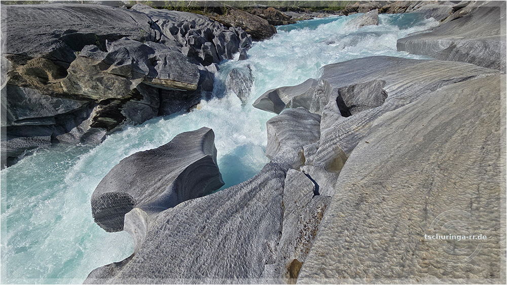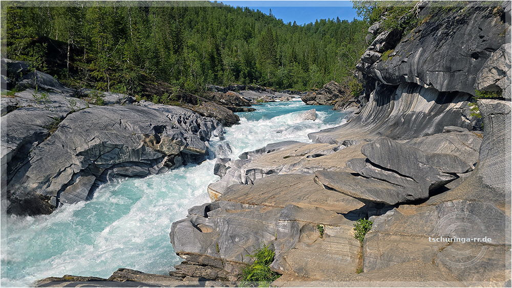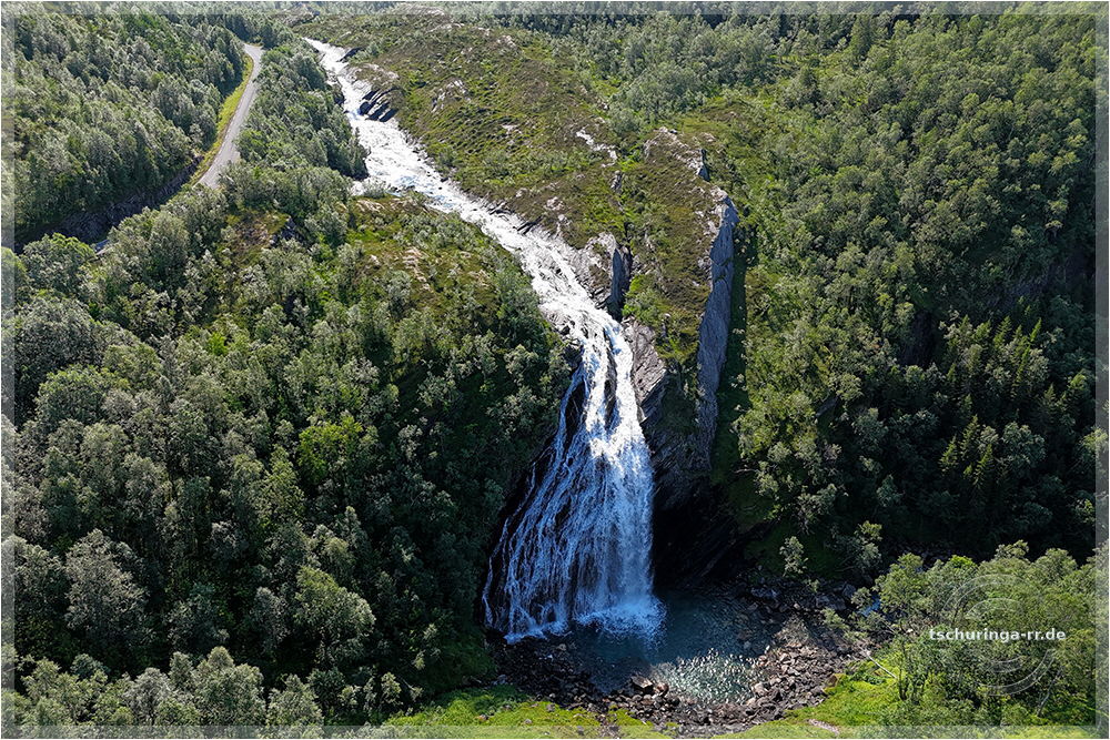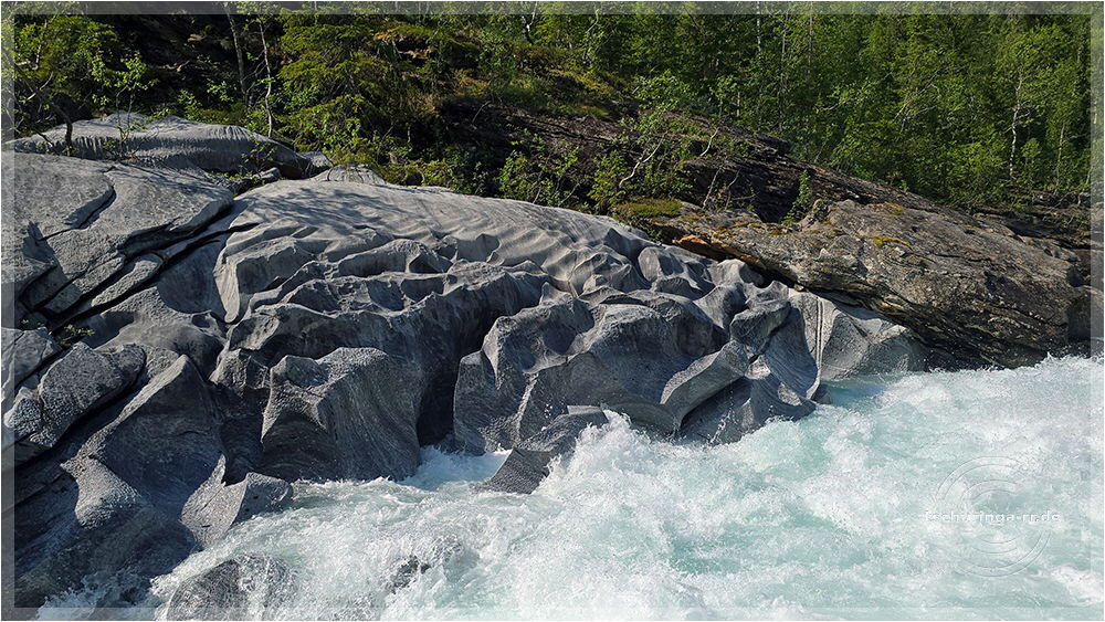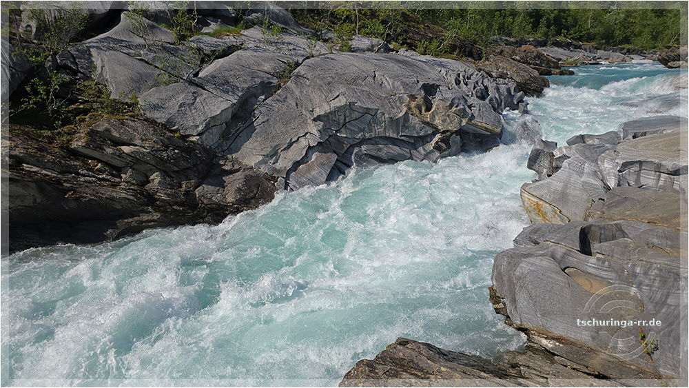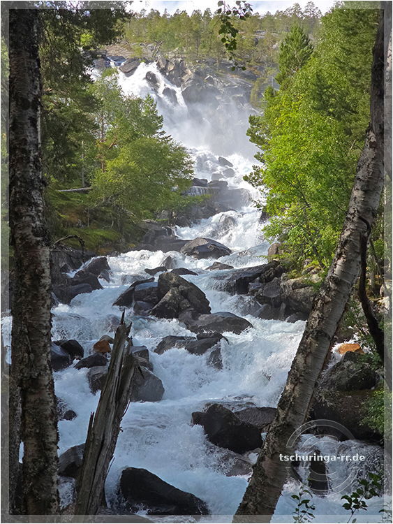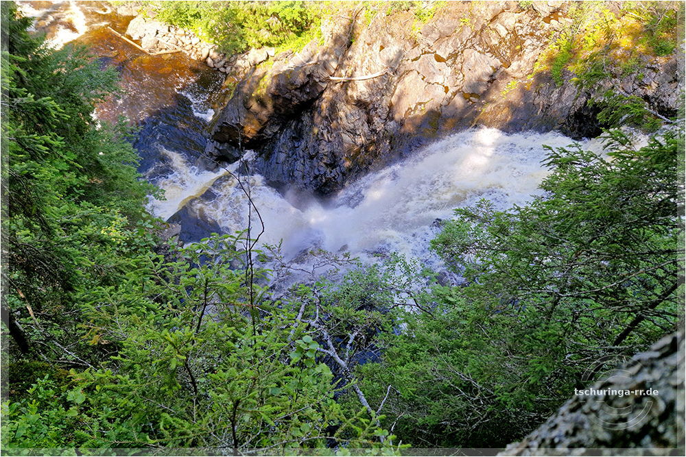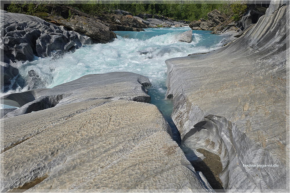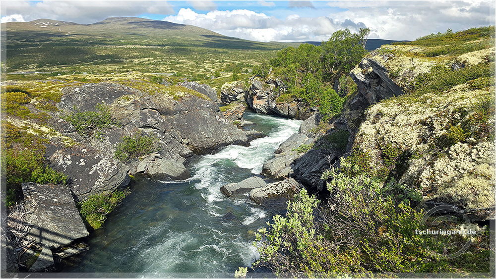 Wir fahren das Nordland Nasjonalparksenter an, wo wir aber uns nur kurz umsehen. Auf einem kleinen Parkplatz in der Nähe stellen wir "Manni" ab und wandern zum Kjemåfossen. Etwa 60 Meter steigen wir nach oben, drehen dann aber nach etlichen Fotos wieder um. Auf dem Parkplatz machen wir Mittagspause, fahren dann weiter bis zum Reinhornheia Tunnel und lassen uns auf dem Parkplatz davor nieder. Nach Kaffee und Cappuccino mit leckeren Plätzchen ziehen wir noch mal los. Allerdings beginnt es bald zu regnen, so dass die Tour nicht allzu lang wird. |