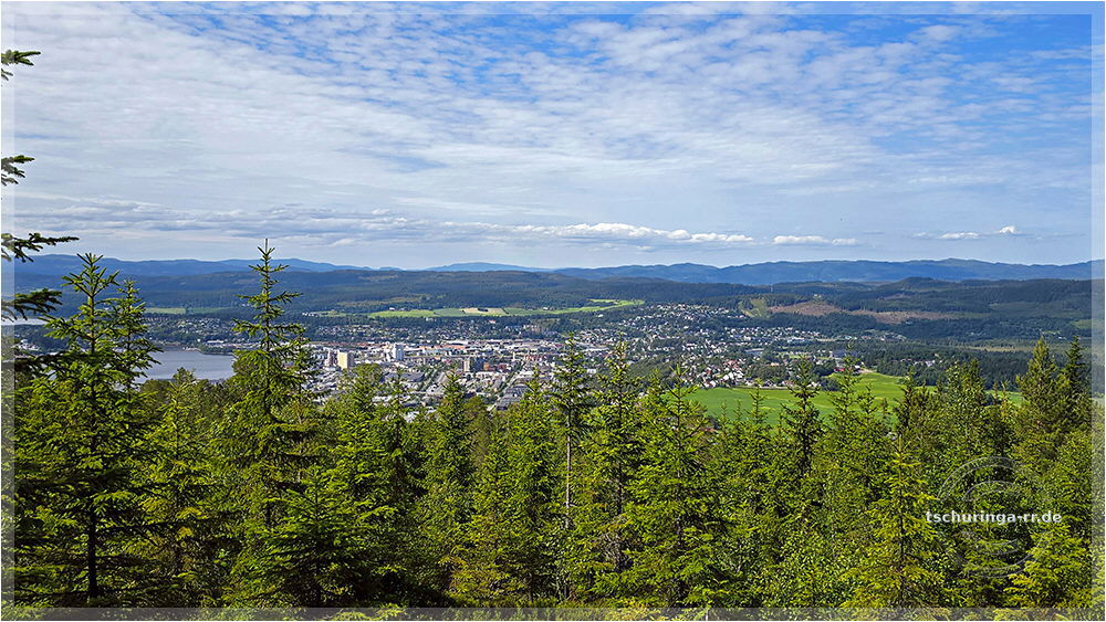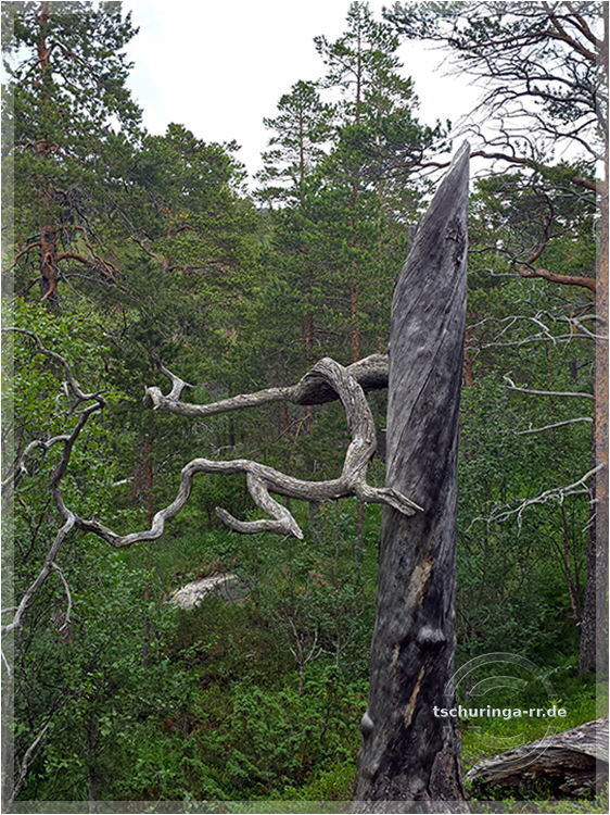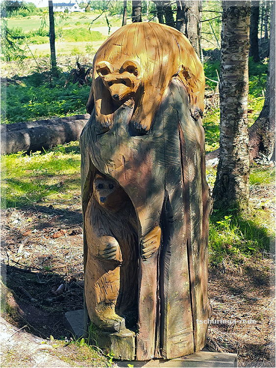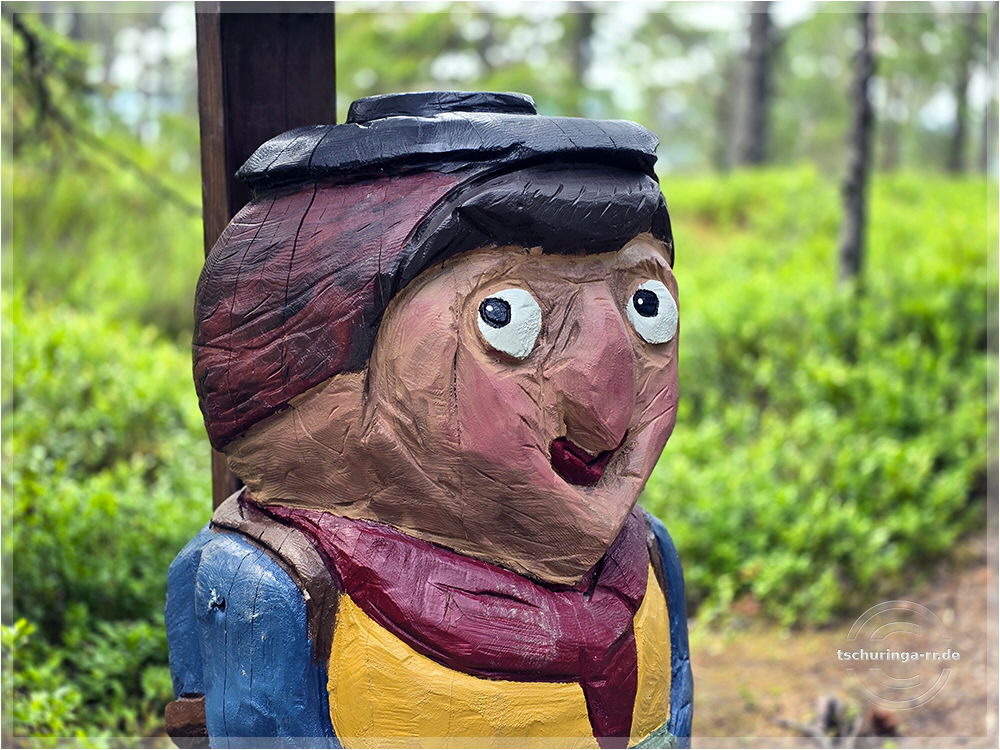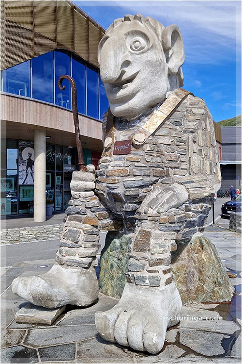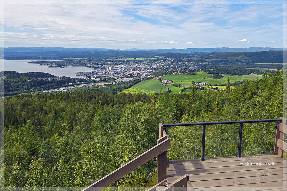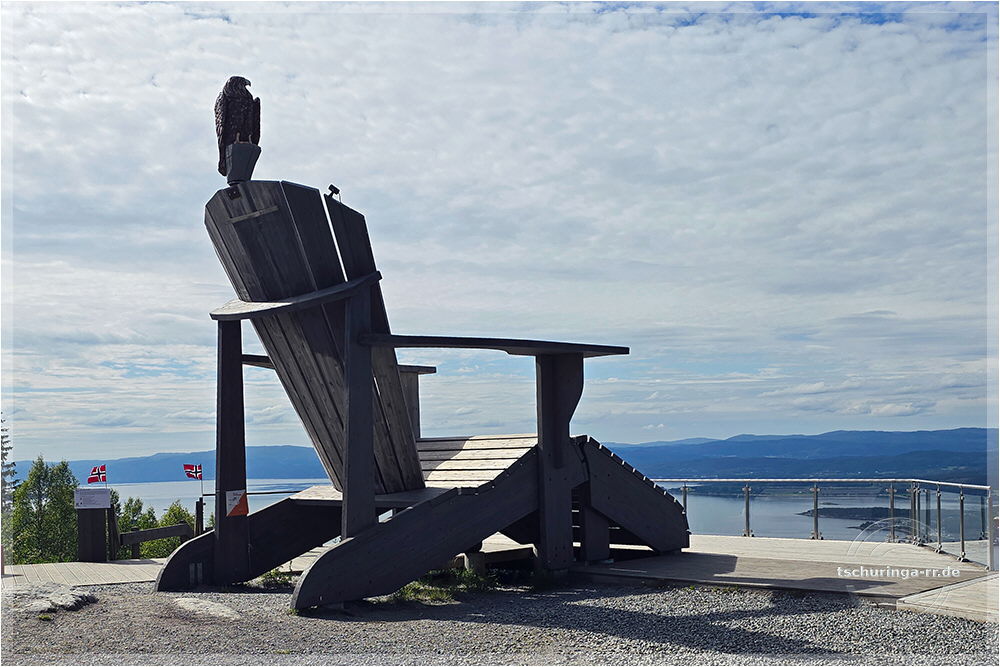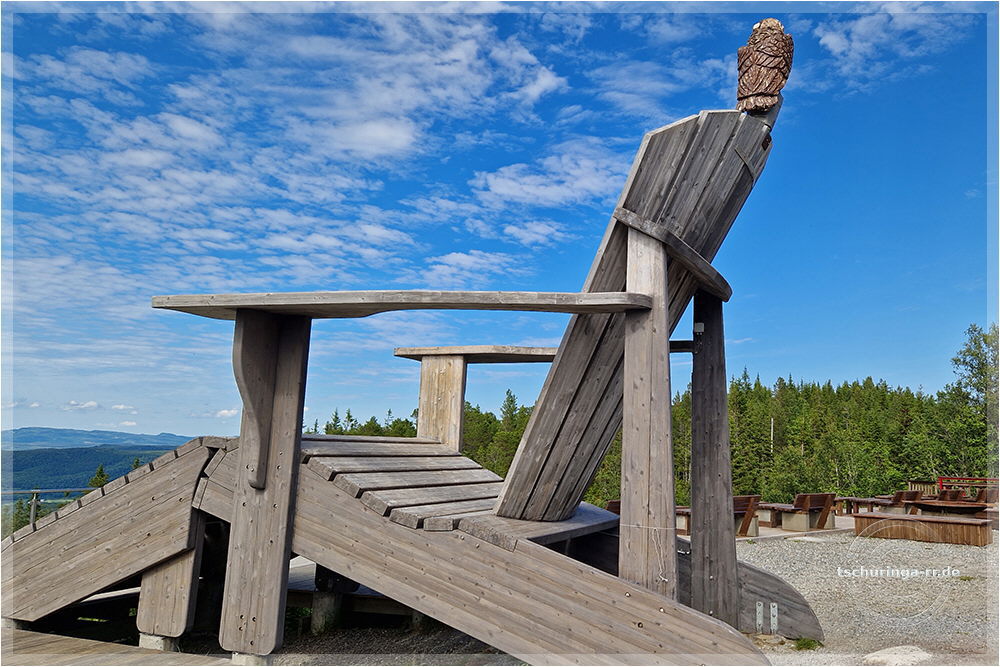 Heute ist mit 22° Celsius der bisher wärmste Tag, seit wir in Norwegen sind. Wir fahren bis Steinkjer, wo wir zum größten Liegestuhl der Welt wandern wollen. Über den Trollstien geht es rauf zum Oftenåsen, wo der Liegestuhl steht. Entlang des Trollstien sind viele Holzfiguren aufgestellt. Insgesamt sollen es über 60 sein. Nicht alle haben wir gesehen, weil wir einen Teil des Weges nicht gegangen sind. Gut sechs Kilometer und 290 Höhenmeter reichen uns aber auch. Es sind so viele Fotos geworden, dass ich dafür eine eigene Seite erstellt habe, weil die hier den Rahmen sprengen würden. |