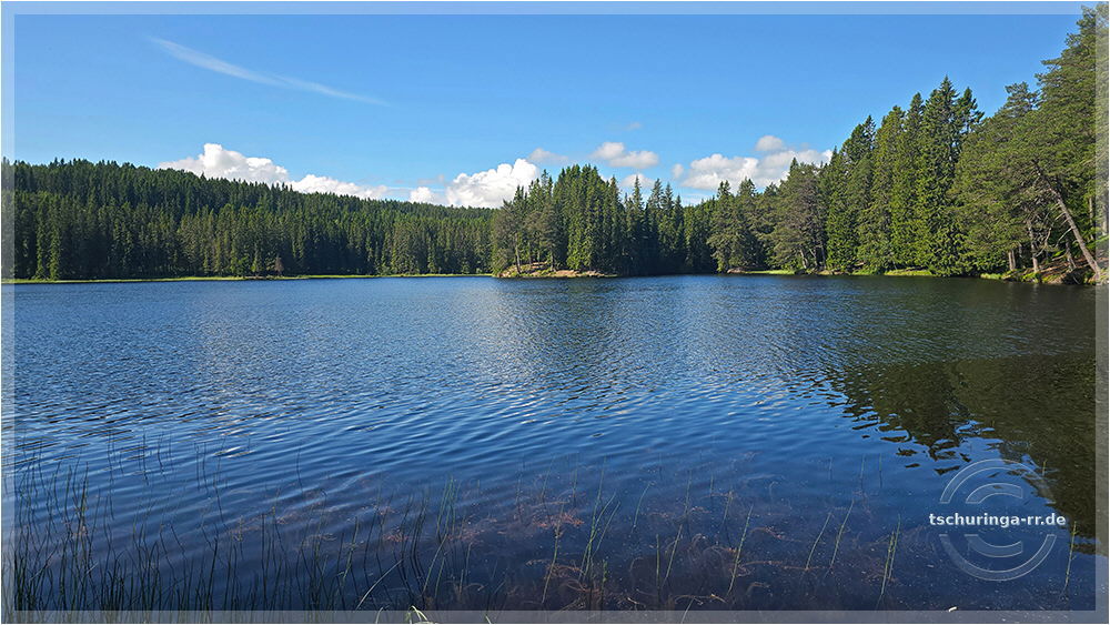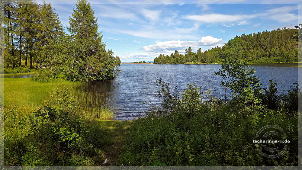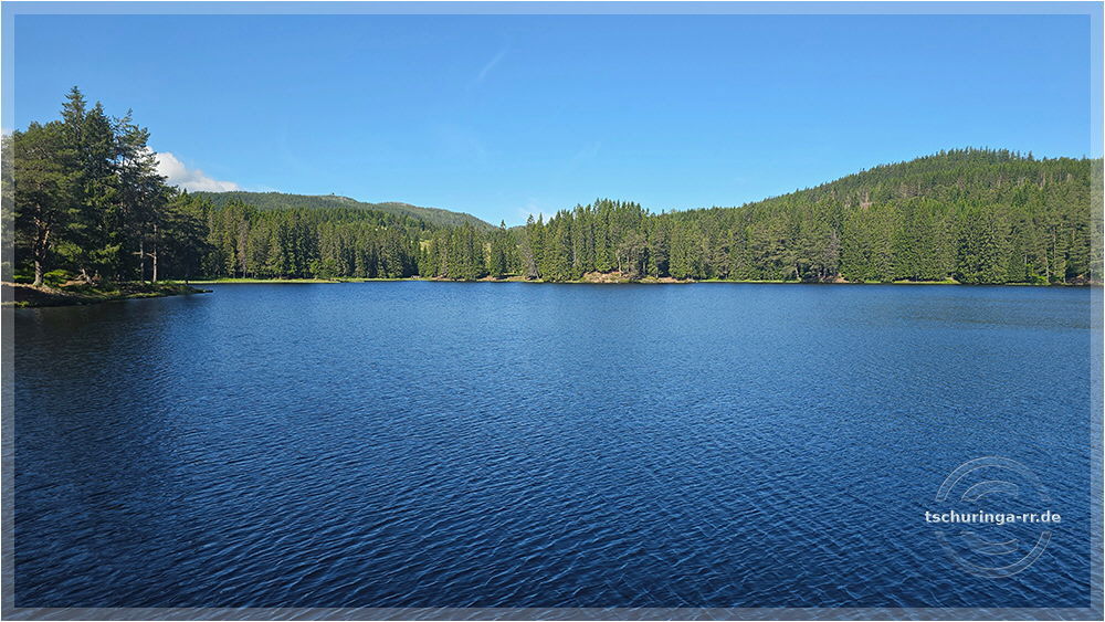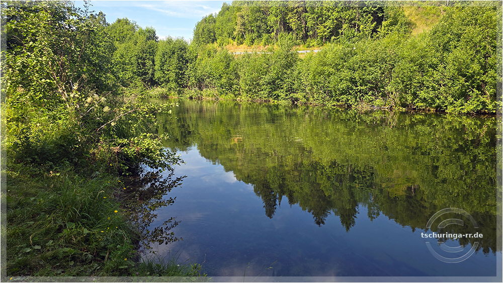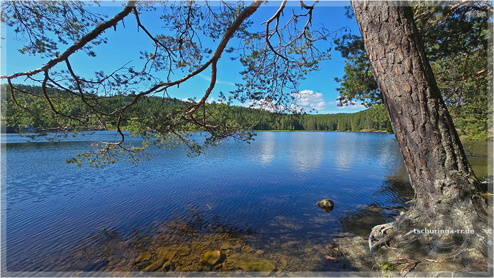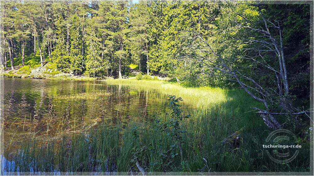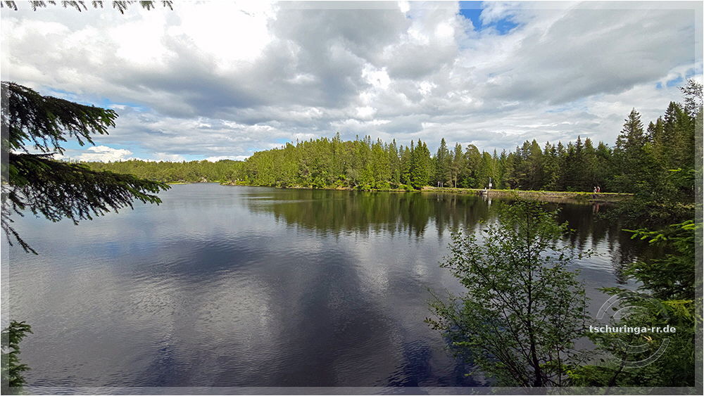 Die Sonne scheint. Wir verlassen unseren Platz, fahren anderthalb Kilometer bergab und lassen uns auf dem Parkplatz am Baklidammen nieder, der am Samstag so voll war. Am Vormittag laufen wir um den Baklidammen. Nachmittags wandern wir zum Theisendammen, den wir ebenfalls umrunden. |
