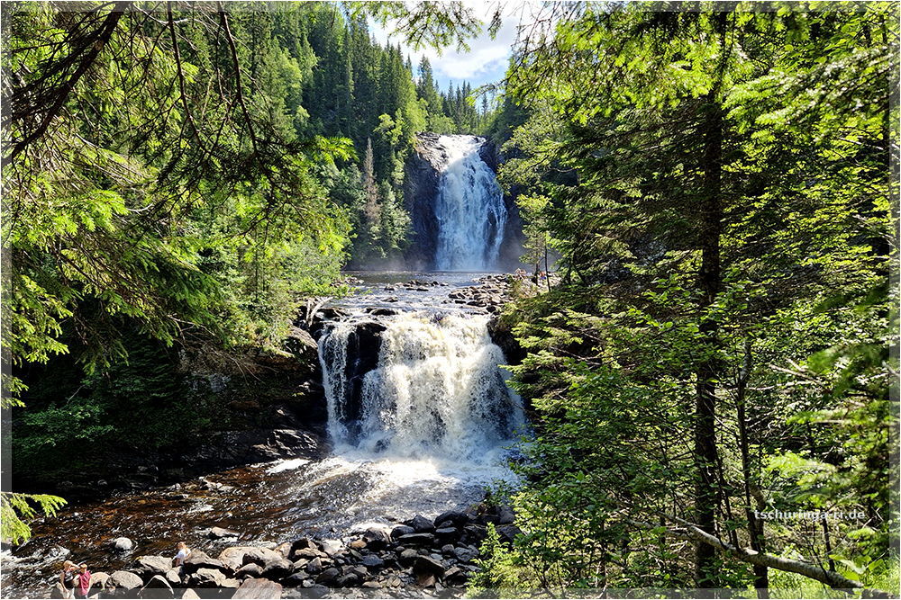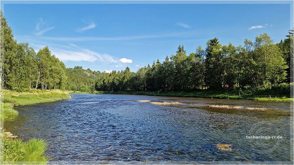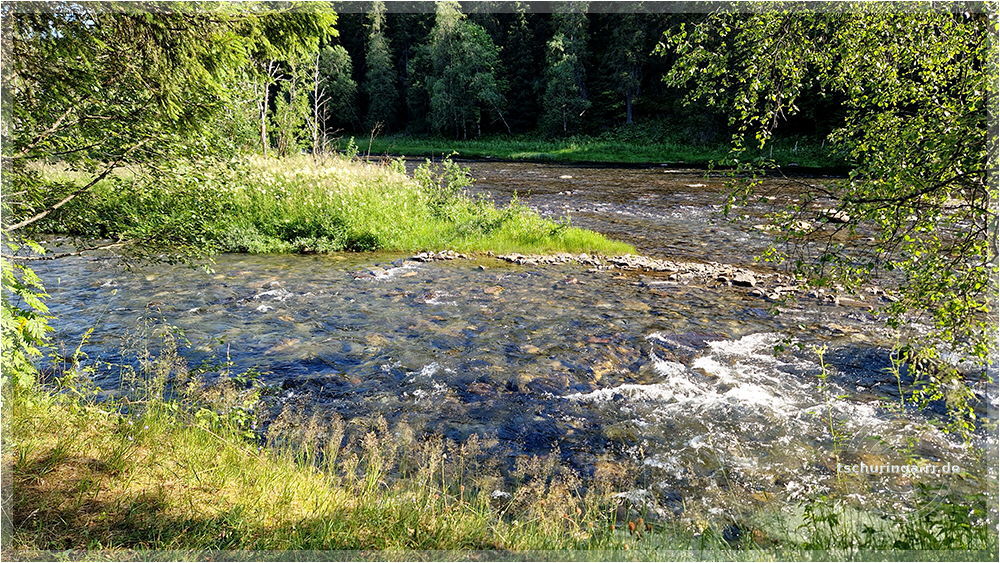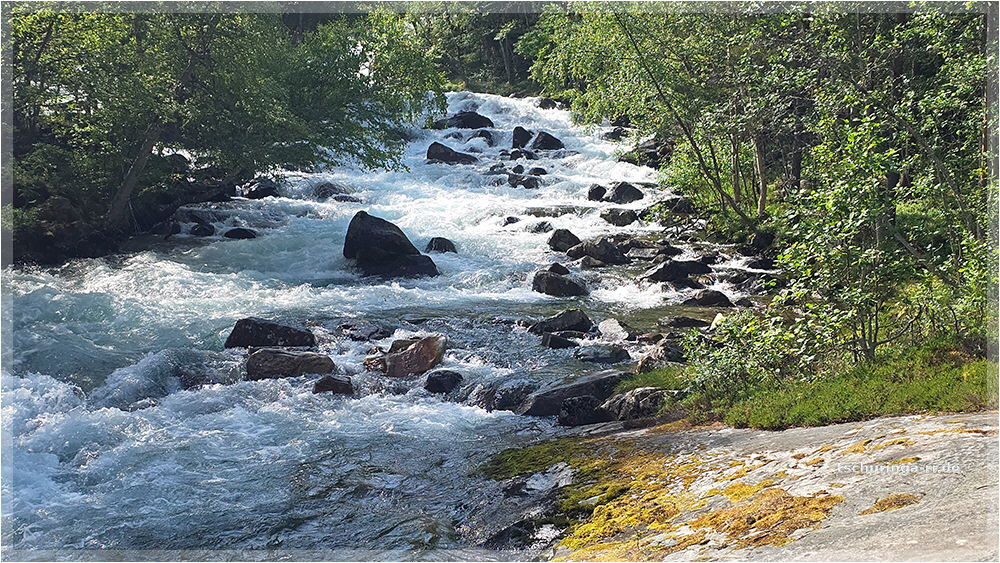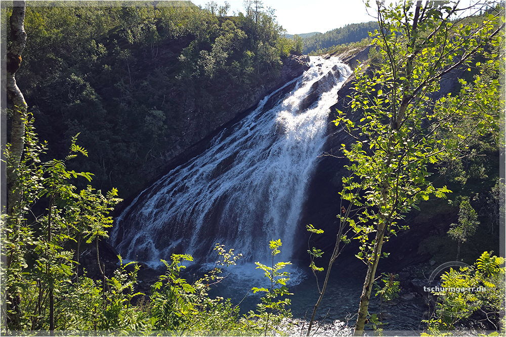 Auch heute scheint die Sonne. In Trondheim kaufen wir ein. Dann geht es weiter zum Parkplatz bei Hommelvik, von wo aus der Weg zum Storfossen losgeht. Nach dem Mittagessen laufen wir zu dem Wasserfall, der eine Fallhöhe von 40 Metern hat und gut besucht ist. Friedbert geht mit Una noch etwas weiter zu einem zweiten kleineren Wasserfall, dem Mettifossen. Zu dem dritten, dem Dølanfossen, steigt er aber auch nicht ab. Ich gehe in der Zeit gemütlich mit Lennox zum Wohnmobil zurück. |