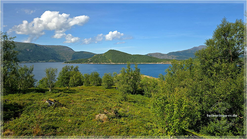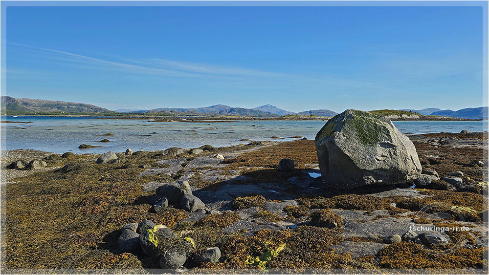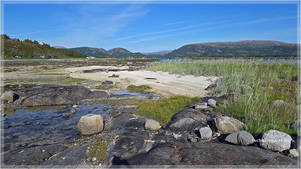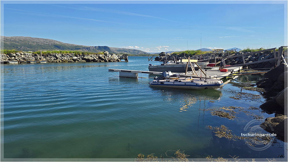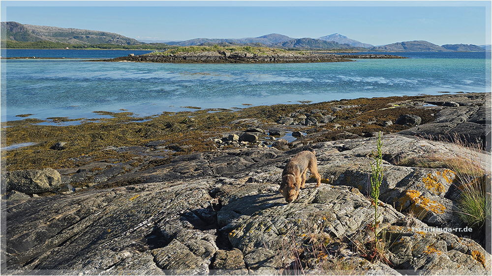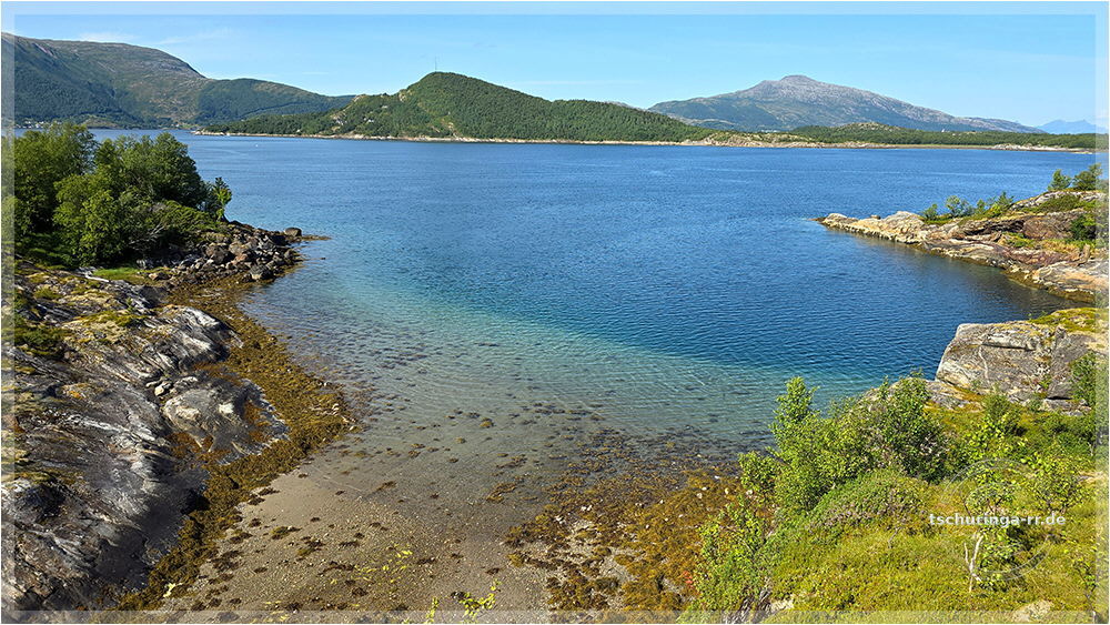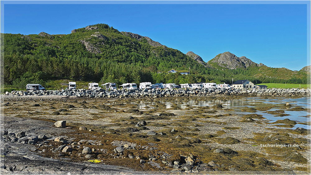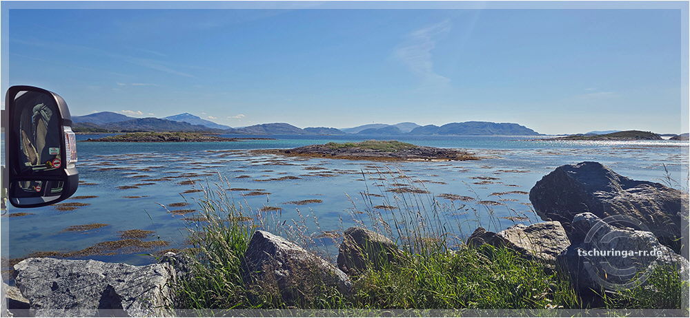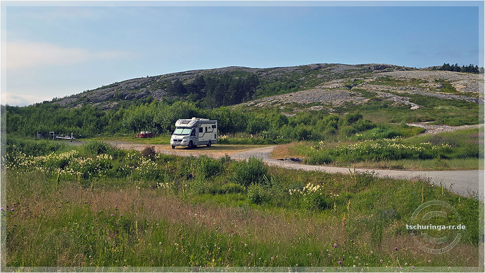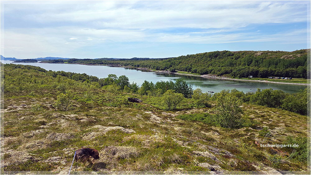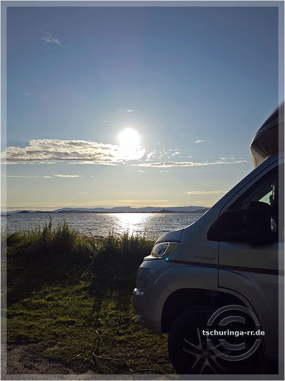 Wir fahren zurück nach Bodø, nutzen die Entsorgung noch einmal und dann geht es langsam wieder Richtung Süden. In gut einem Monat wollen wir wieder in Deutschland sein. Wir parken auf dem Parkplatz am Kystriksveien kurz hinter der Kjellingstraumenbru. Nach dem Mittagessen erkunden wir die Halbinsel. Viel laufen kann man zwar nicht, aber die Aussicht ist schon genial. Wir entscheiden, dass wir bleiben, obwohl es noch recht früh ist. Das Wetter ist spitze. Friedbert sitzt draußen und ich backe einen Apfelkuchen. Der Tag ist also ausgefüllt. |