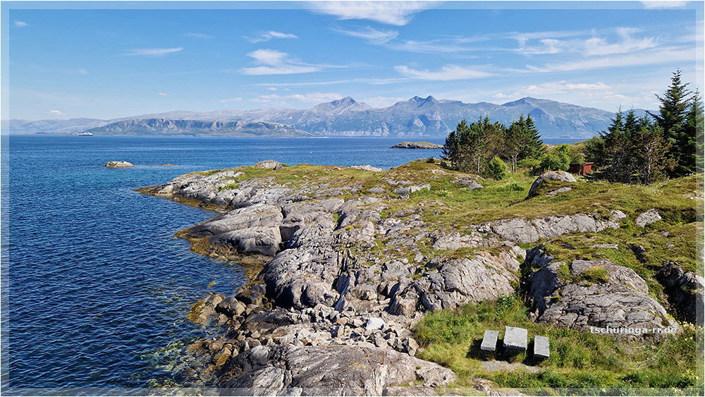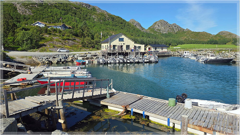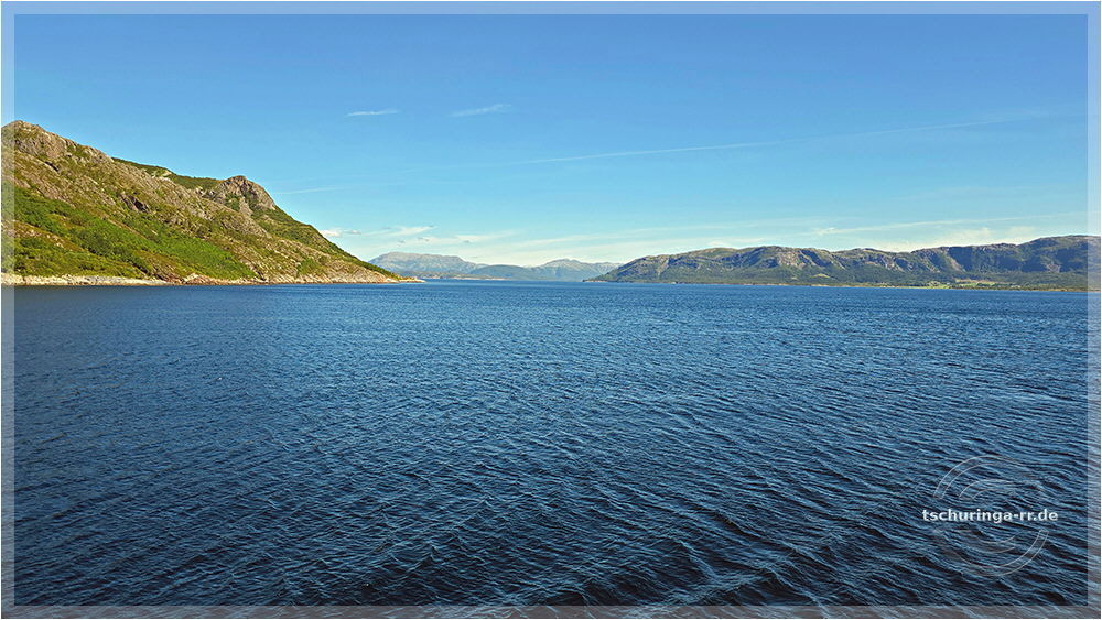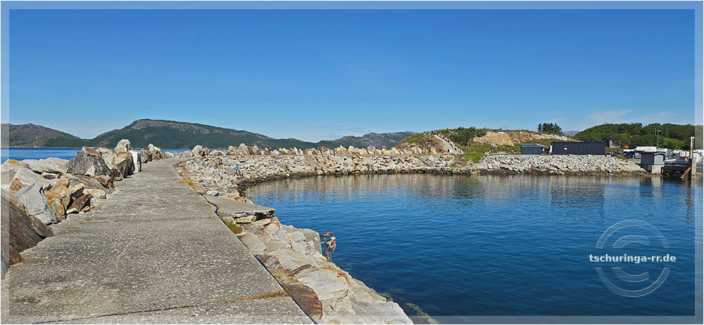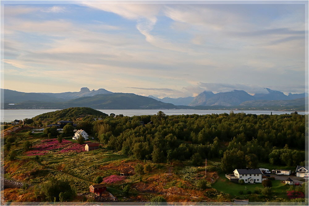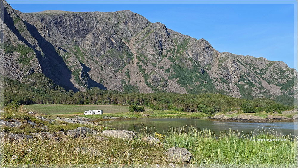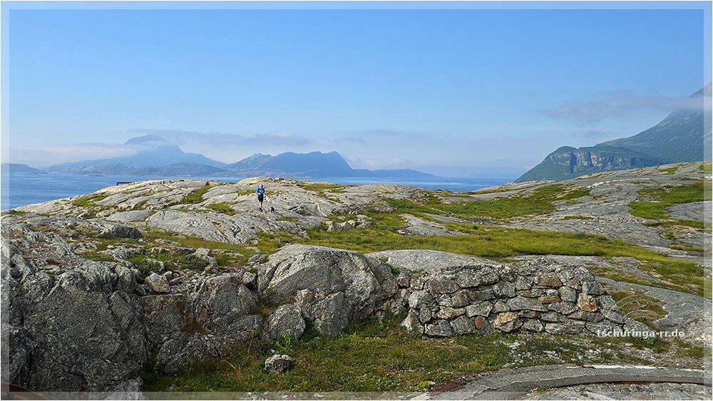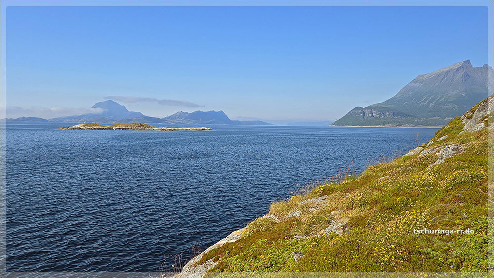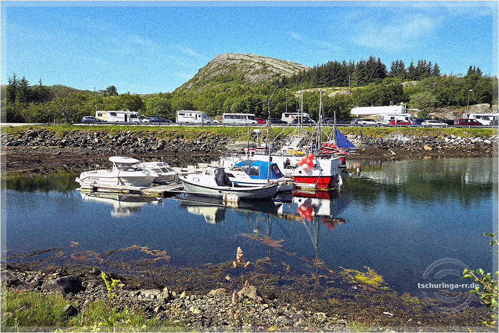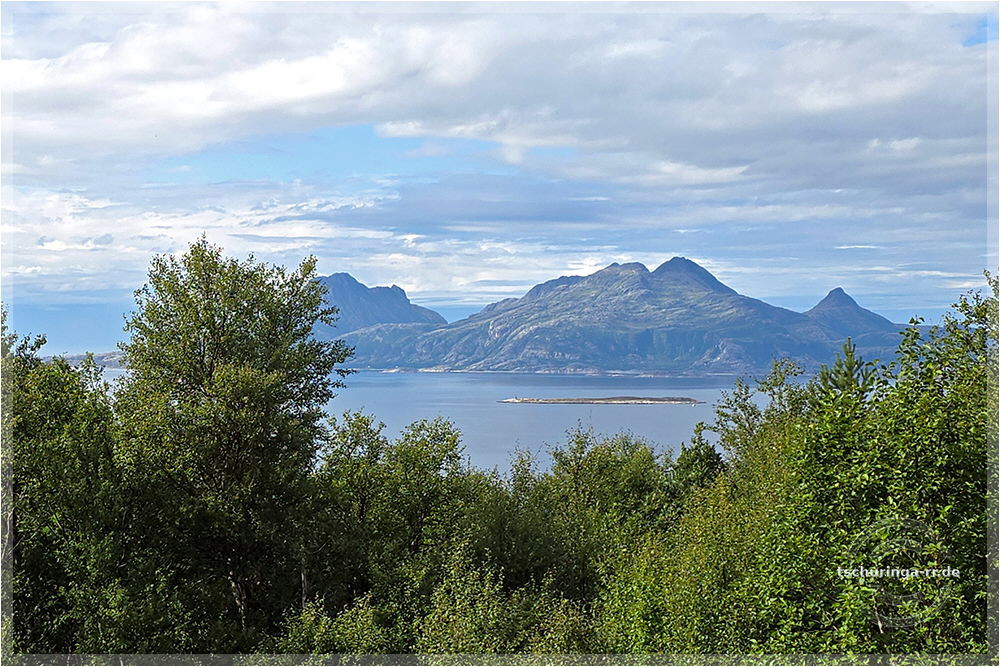 Wir fahren zurück nach Bodø, nutzen die Entsorgung noch einmal und dann geht es langsam wieder Richtung Süden. In gut einem Monat wollen wir wieder in Deutschland sein. Wir parken auf dem Parkplatz am Kystriksveien kurz hinter der Kjellingstraumenbru. Nach dem Mittagessen erkunden wir die Halbinsel. Viel laufen kann man zwar nicht, aber die Aussicht ist schon genial. Wir entscheiden, dass wir bleiben, obwohl es noch recht früh ist. Das Wetter ist spitze. Friedbert sitzt draußen und ich backe einen Apfelkuchen. Der Tag ist also ausgefüllt. |