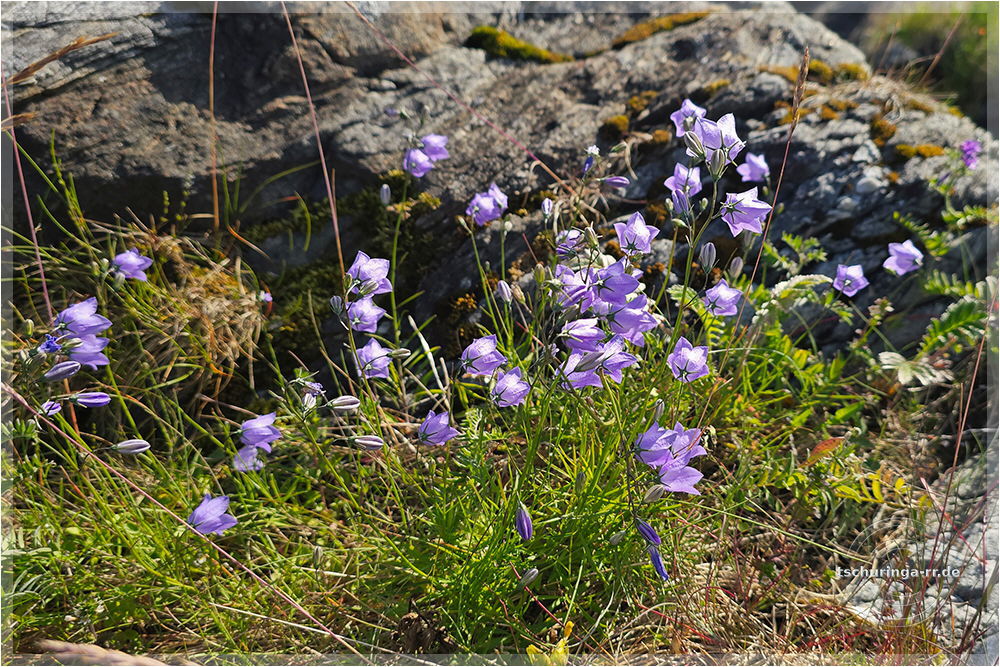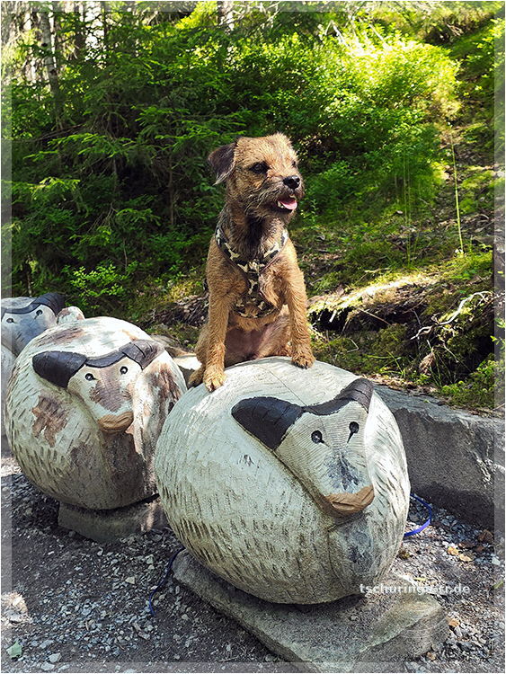 Heute Morgen sind es nur 8° Celsius und der Wind fühlt sich wie 1° an. Am Nachmittag soll es besser sein. Auf dem Hinweg fällt uns ein ziemlich schimpfender Vogel auf. Da muss die Canon ran und ich kann ein Blaukehlchen auf den Chip gebannt. Weiter geht es entlang des Schneefangzauns zur Brücke über die Svone, durch eine Unterführung unter der Bahn her und von da durch ein Gatter in den Bereich der Moschusochsen über den Moskusstien. Wir laufen den Wanderpfad bergan bis wir auf eine Gruppe stoßen, die mit Ferngläsern auf die Hochebene schaut. Angeblich haben sie dort Tiere gesehen. Ich mache mit dem großen Tele zwei Fotos, die am Rechner klar zeigen, dass da ausschließlich Felsen unterwegs waren. Zwischendurch brauchen wir unsere Regenjacken. Der Wind ist echt unangenehm. Una stört das gar nicht, aber Lennox ist froh über seine Jacke. |