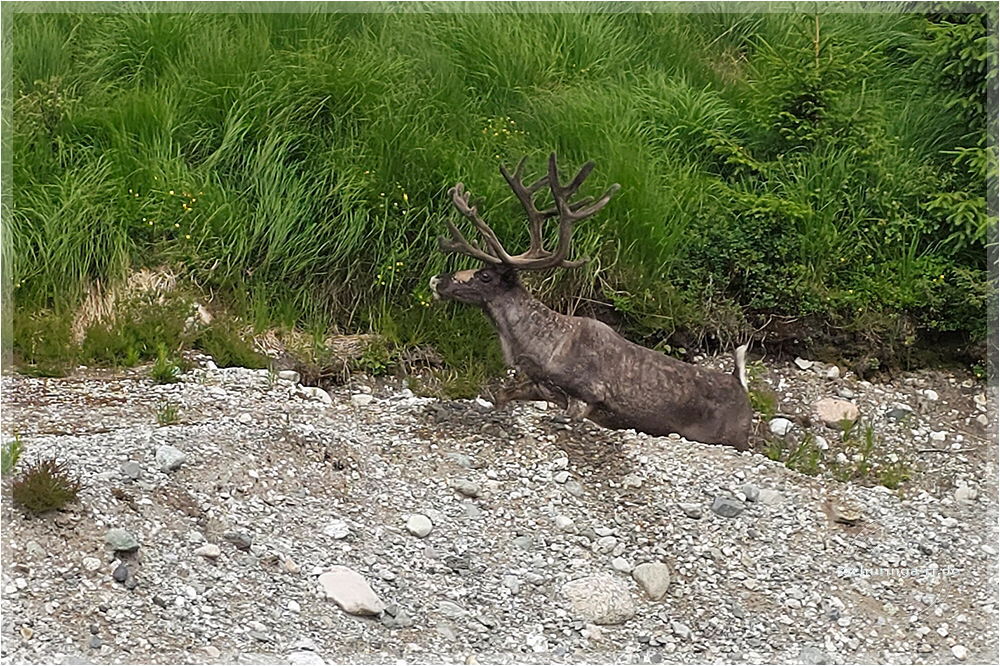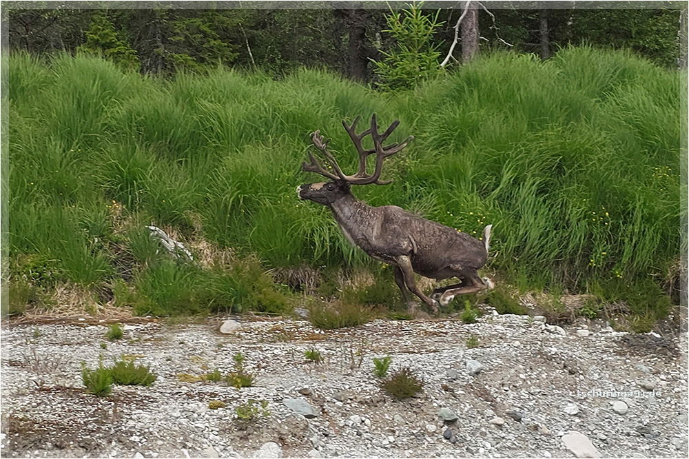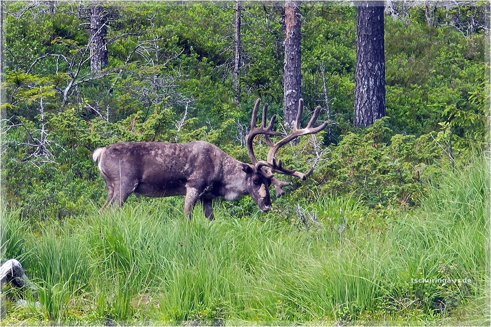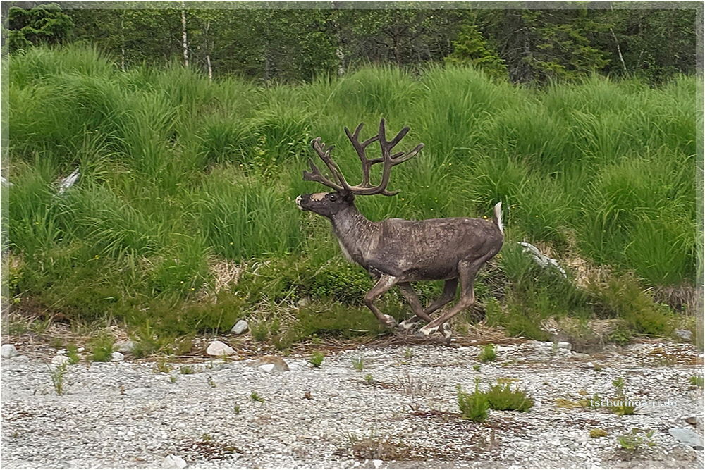 Für nachmittags ist Regen vorher gesagt. Deshalb starten wir schon um 10:00 Uhr zu einer kleinen Wanderung. Heute steht wieder Felsenklettern auf dem Plan, weil wir auf der anderen Seite ins Tal schauen wollen. Da aber natürlich nach dem Felsen der nächste Felsen kommt, geht es immer weiter. Wir überqueren den Reinhornheia-Tunnel und kommen auf der anderen Tunnelseite wieder runter. Dort ist ein großer Bereich eingezäunt, der zum Einfangen der Schafe und vermutlich auch Rentiere genutzt wird. Während wir im Wohnmobil sitzen, kommt ein Gruppe Wanderer zurück zum Parkplatz. Einer trägt ein großes Rentiergeweih, das er gefunden hat. Da komme ich mit meinem mickerigen Ding nicht mit. |