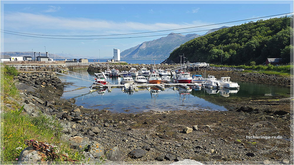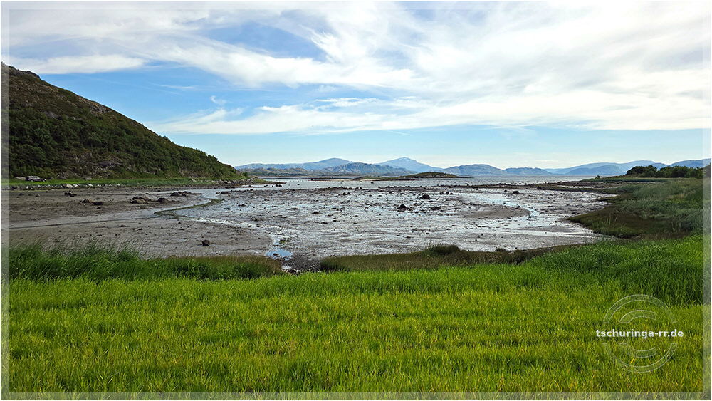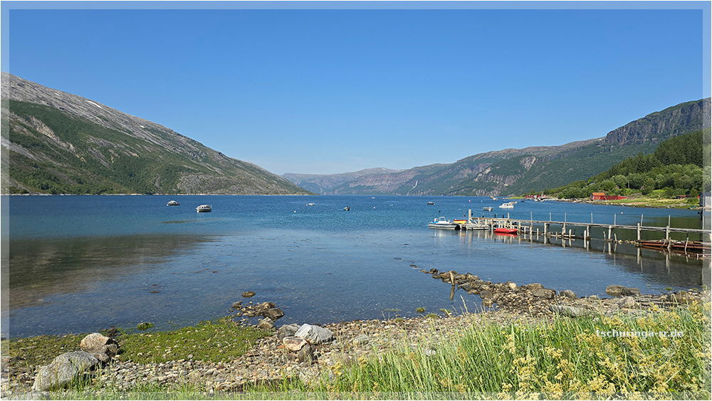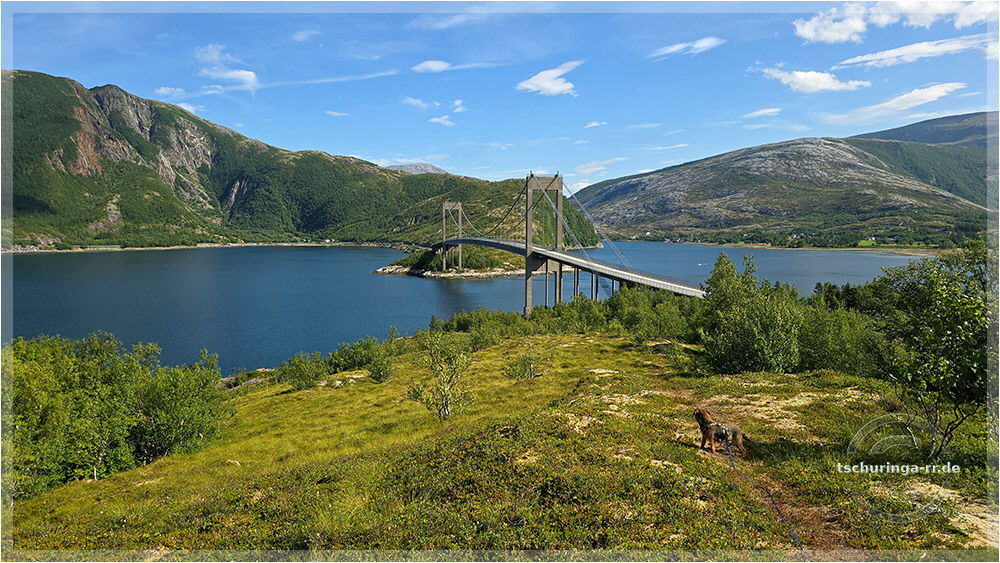Mit 34° ist heute der wärmste Tag in Norwegen. Wir hoffen, dass es dabei auch bleibt. Eigentlich sind wir auch nach Norwegen gefahren um der Sommerhitze in Deutschland zu entgehen. Das war dann wohl nix. Wir fahren den Melfjordveien runter bis Melfjordbotn, genießen die tollen Aussichten und fahren dann wieder rauf, denn der Melfjordveien ist eine Sackgasse. Mittagspause machen wir auf einem kleinen Platz, wo wir gleich zwei Mal aufgefordert werden, weiter zu fahren, weil es Privatgelände wäre. Ein Hinweis auf privates Gelände gibt es allerdings nicht. Solch ein Schild würde sicher nicht alle davon abhalten, dort zu bleiben, aber zumindest wir hätten erst gar nicht angehalten. Da wir aber nur Mittagessen und dann weiter fahren wollen, ist es okay, dass wir dort parken. Friedbert hat einen kleinen Parkplatz ausgeguckt, von wo aus man wandern kann. Aber bei der Hitze bleiben wir erstmal im Wohnmobil. Draußen wäre es zwar angenehmer, aber da wird man von Bremsen sofort attackiert und völlig zerstochen. Dann doch lieber drinnen, auch wenn es so warm ist, dass sogar Lennox ohne Decke liegt und hechelt. |