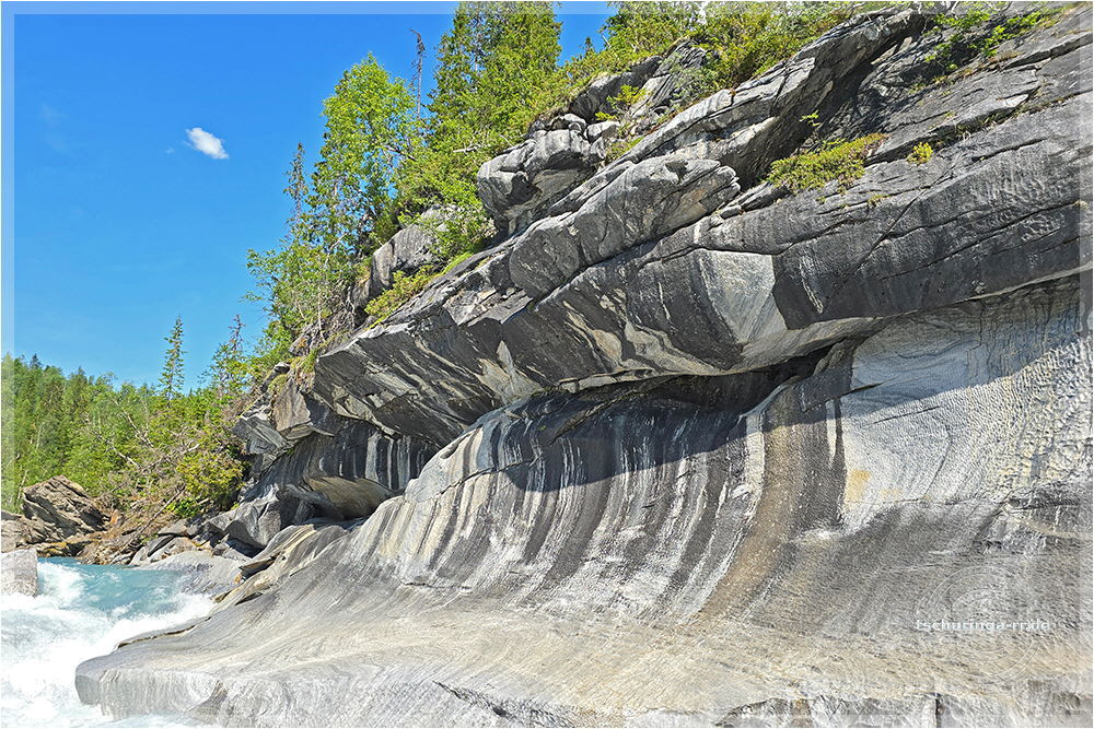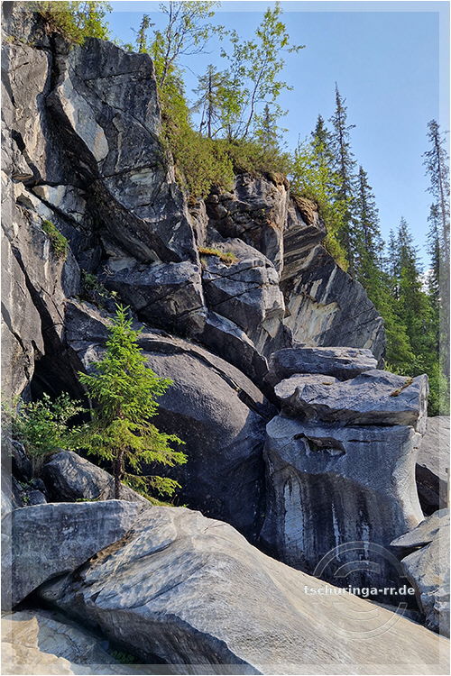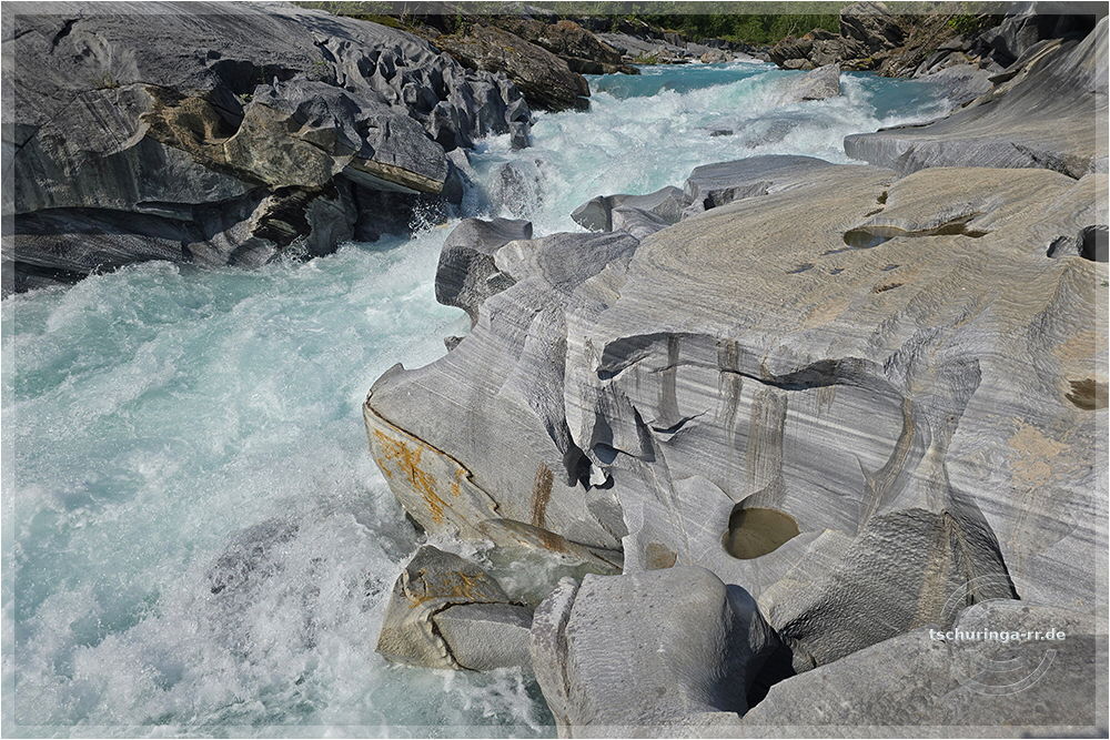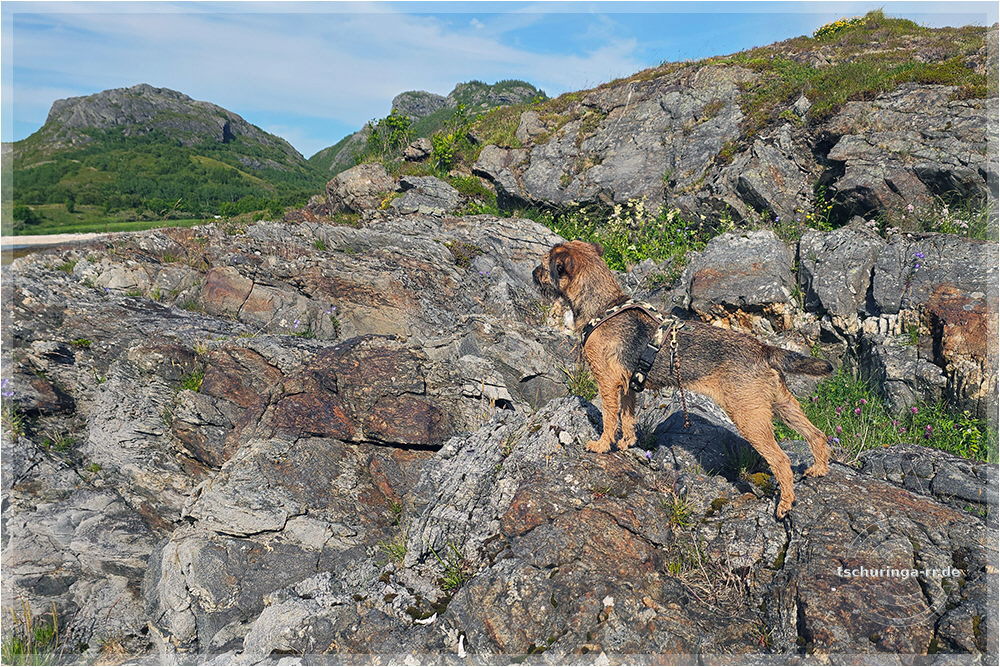 Heute Morgen müssen wir in Mo i Rana zuerst mal einige Dinge erledigen. Einkaufen, entsorgen, Wasser und Diesel tanken. Gas könnten wir tanken, aber die Flaschen sind noch fast voll. Das lohnt sich nicht. Seit wir keinen Gaskühli mehr haben, brauchen wir erheblich weniger Gas und heizen muss man zur Zeit nicht wirklich. Dann geht es weiter zum Marmorslottet. Das Navi hat mal wieder so seine eigenen Ideen und führt uns in ein Abbaugelände. Also umdrehen und neu suchen. Irgendwann kommen wir aber tatsächlich auf dem richtigen Parkplatz an. Nach Mittag starten wir über einen steinigen und mit Brettern ausgelegten Weg, der irgendwann in einer Kletterpartie endet. Um runter auf den "Marmor" zu kommen, müssen wir über große Felsbrocken turnen. Die Hunde machen das super mit. Una ist sehr vorsichtig, Lennox muss schon mal gebremst werden, weil er immer schnell hinter mir her will. Ist Friedbert mit ihm alleine unterwegs, ist er bedeutend vorsichtiger. An einer Stelle müssen wir die beiden heben, weil Springen zu gefährlich wäre und zumindest Una sich auch weigert, da runter zu gehen. Aber besser so als anders. Nach der Rückkehr gibt es ein superleckeres Schoko-Pistazien Eis, das uns heute Morgen im Kiwi angegriffen hat und zur Strafe mit musste. Während wir das schlemmen, kommt ein kleiner Gewitterschauer runter und spült das Wohnmobil mal etwas sauber. 70 NOK haben wir für 24 Stunden parken bezahlt, also bleiben wir heute hier. |