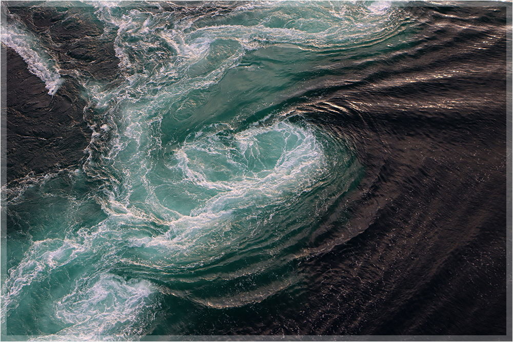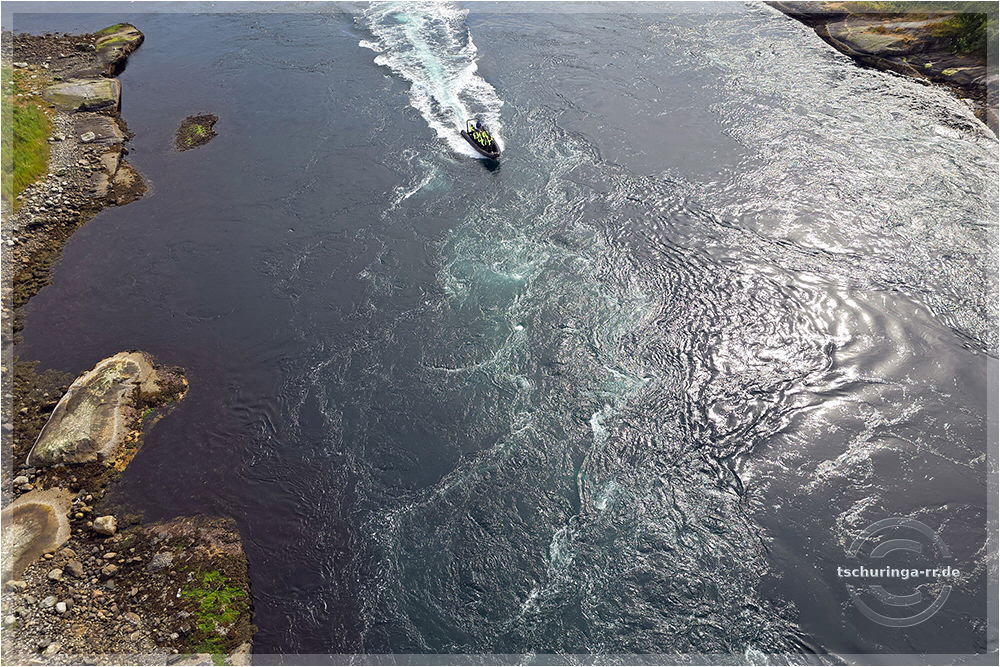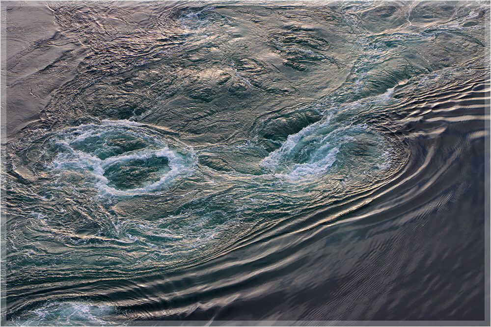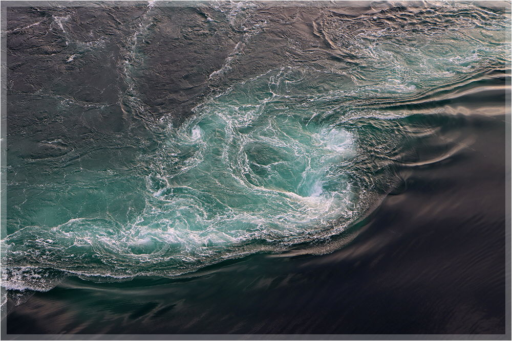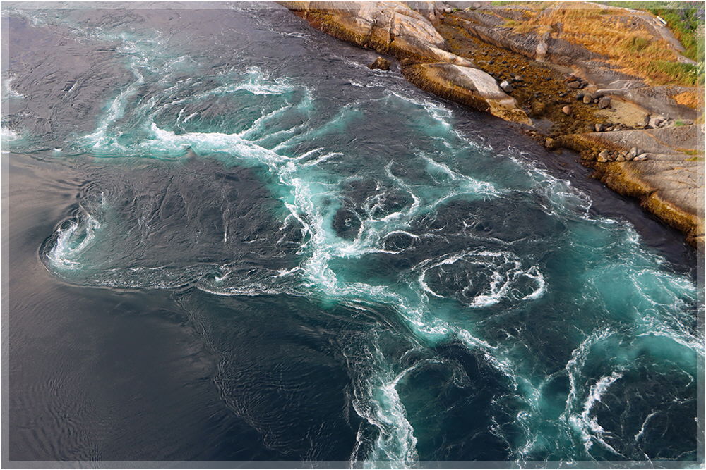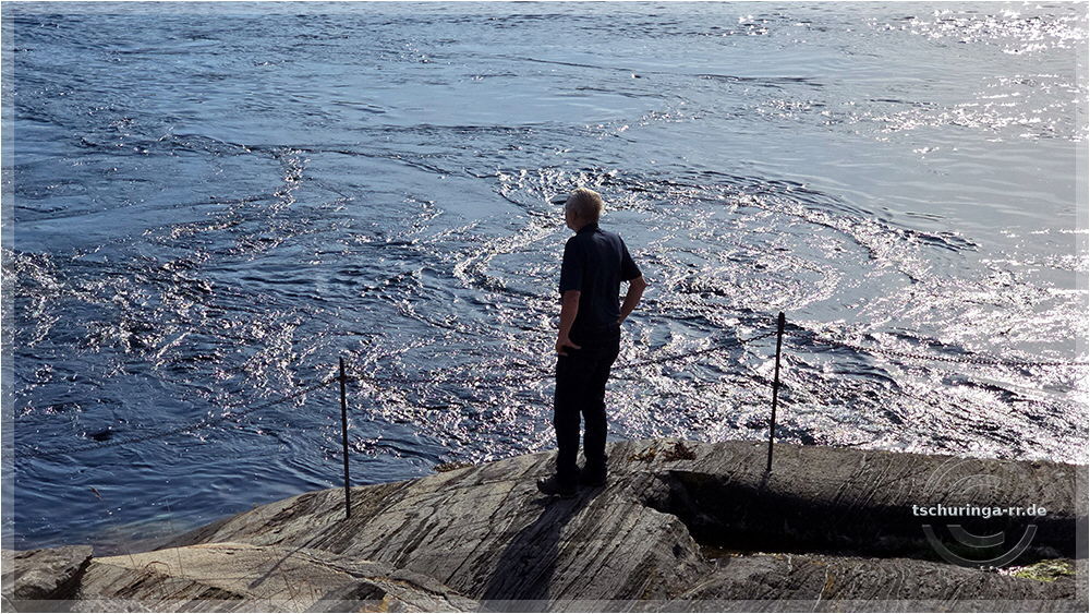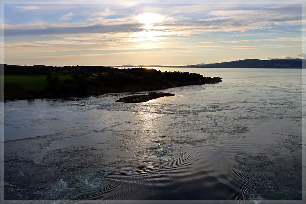 Zum dritten mal, nach 2009 und 2019, besuchen wir Saltstraumen, dem stärksten Gezeitenstrom der Welt, der bis zu 40 km/h erreichen kann und dadurch entsteht der berühmte Mahlstrom mit seinen Whirlpools, die einen Durchmesser von bis zu 10 Metern haben können. Wir fahren den Stellplatz an, der hinter der Saltstraumbrua liegt. Auch wenn wir das schon kennen, ist es immer wieder sehenswert. Wobei es 2019 kurz vor Vollmond ausgeprägter war als heute. Wir überqueren die Brücke, blicken von oben auf die beeindruckenden Wirbel im Wasser, kaufen auf der anderen Seite beim Coop ein Brot und wandern auf der anderen Seite der Brücke wieder zurück. Wie wir schon 2019 festgestellt haben, sind die Verwirbelungen und Whirlpools beim Ablauf des Wasser ausgeprägter. |