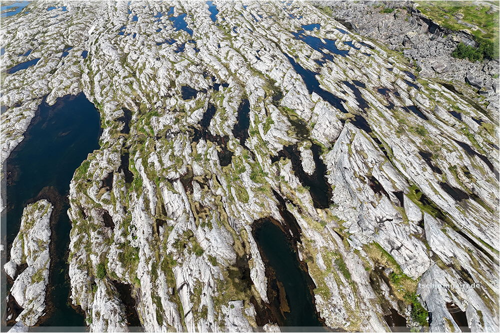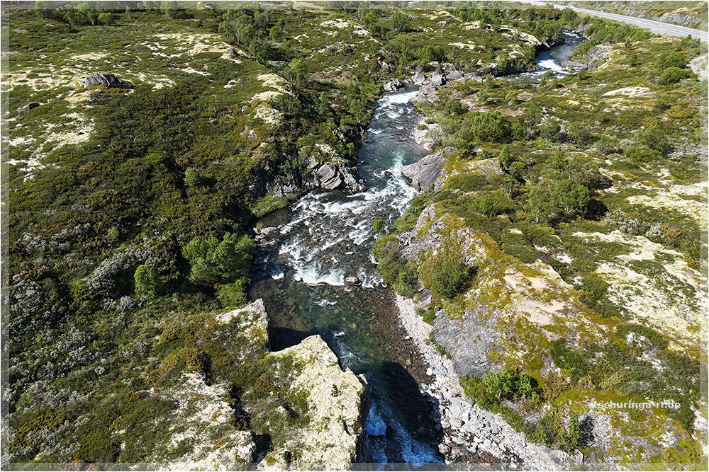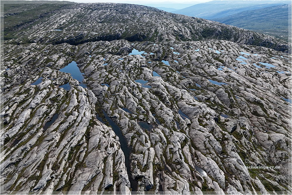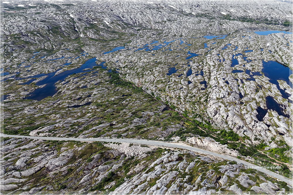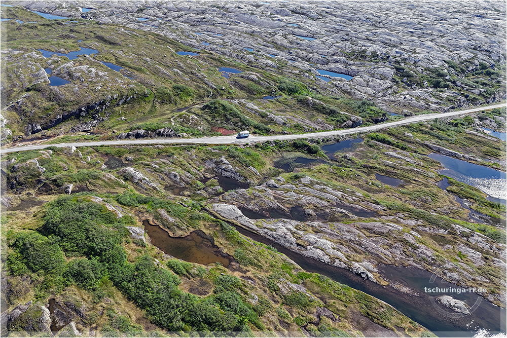 Das Wohnmobil steht heute Morgen herrlich im Schatten. Wir mögen gar nicht losfahren. Deshalb laufen wir eine halbe Stunde am letzten Übernachtungsort mit den Hunden. Leider sind auch heute Bremsen und noch größere Viecher, ich meine das wären Rentierbremsen, sehr aktiv und wir sind völlig zerstochen als wir zurück kommen. Es hift nichts, der Schatten ist hier bald nicht mehr da und wir fahren die Löcherstrecke wieder zurück. Mit unter 10 km/h versucht Friedbert die Krater auf dem Schotterweg zu umfahren. Nicht immer gelingt das. Auf dem Melfjordveien halten wir in einer großen Parkbucht. Da haben wir 2019 schon mal übernachtet. Man kann wunderbar querfjellein laufen. Wege gibt es keine. Auch diesmal sind wir wieder getrennt unterwegs, denn es immer noch ziemlich heiß in Norwegen. Wir laufen jeder etwa vier Kilometer einfach der Nase nach durch das Gelände. Über Felsen, durch Sumpfgebiete, rund um kleine Seen und manchmal auch durch dichtes Zwergbirkengestrüpp. Während Friedbert mit Lennox unterwegs ist, werfe ich mal die Drohne in die Luft und mache ein paar Fotos von oben. Die Wanderung durch die einsame Natur genieße ich sehr. Nur Una und ich und gefühlt 100 lauthals schimpfende Goldregenpfeifer und 100 000 Bremsen. Sonst ist ein ruhiger Tag, denn es gibt weder Telefon noch Internet, selbst das Fernsehen will nicht, weil wir wohl zu weit nördlich sind. Wir sind halt am Ar*** der Welt. |