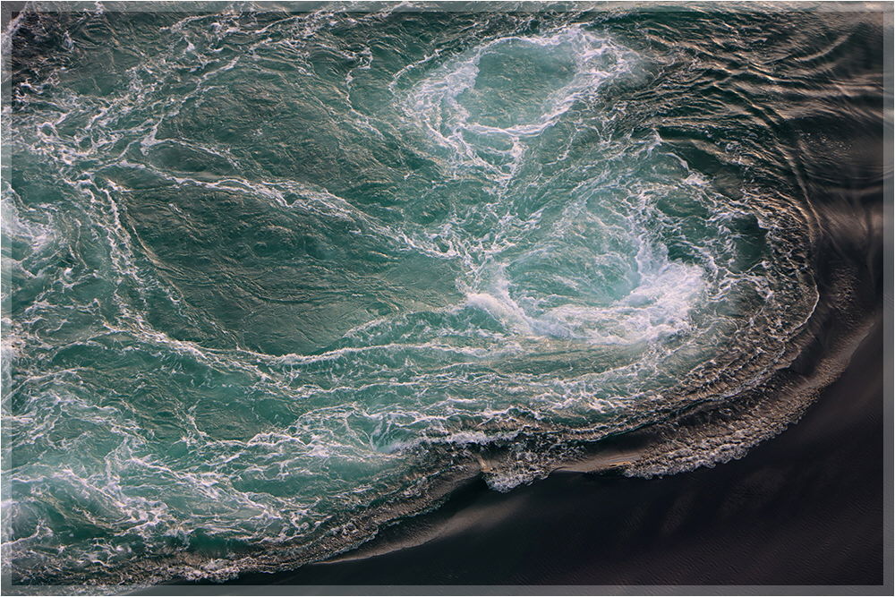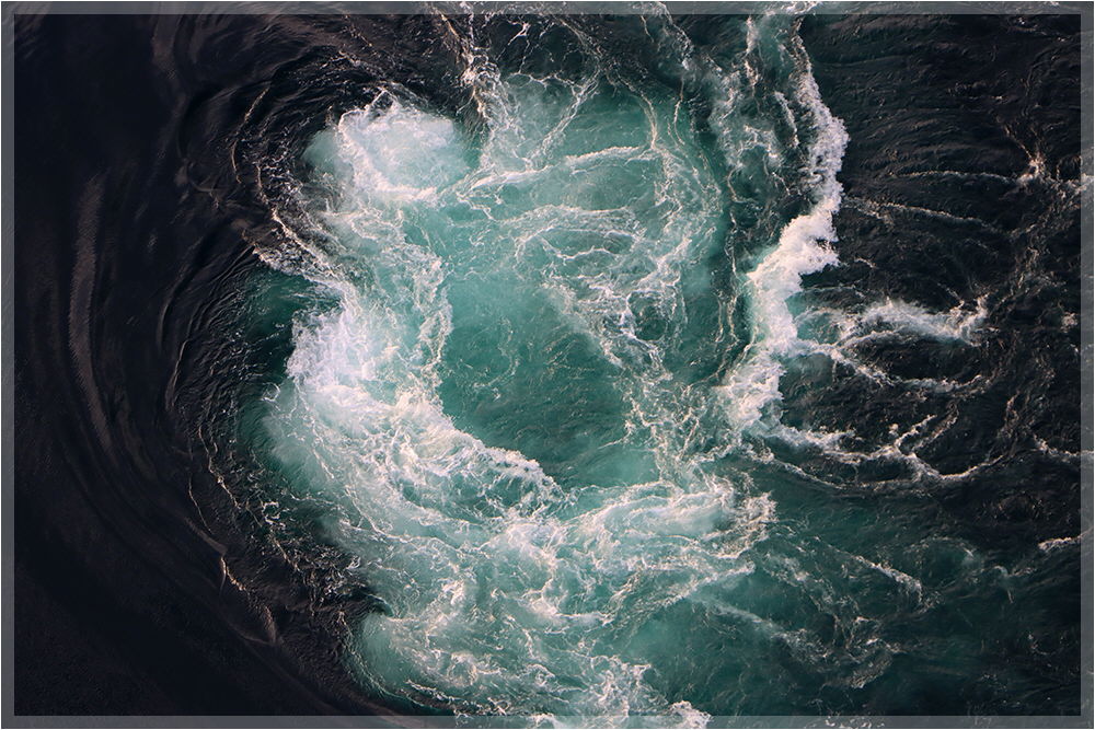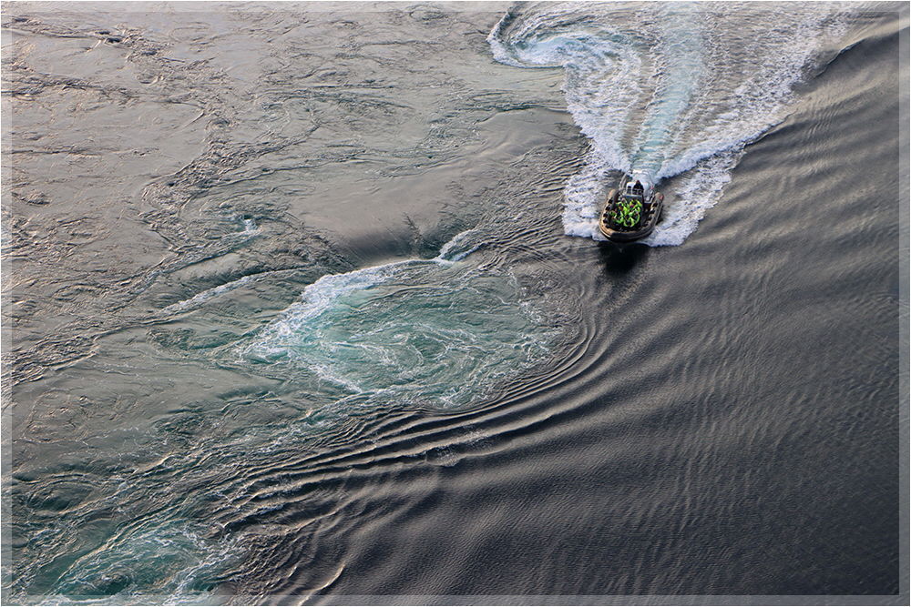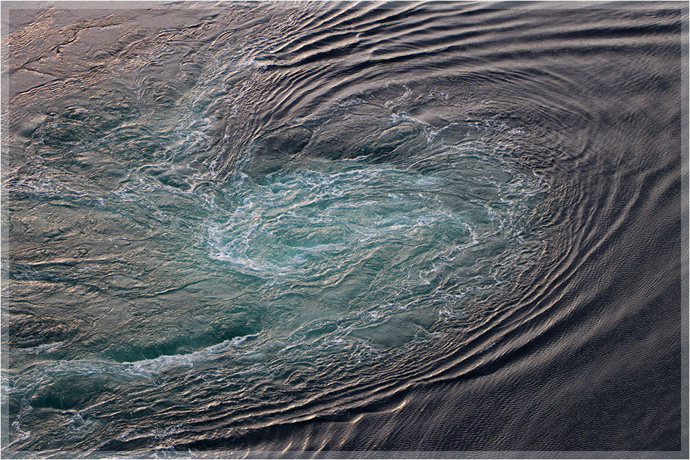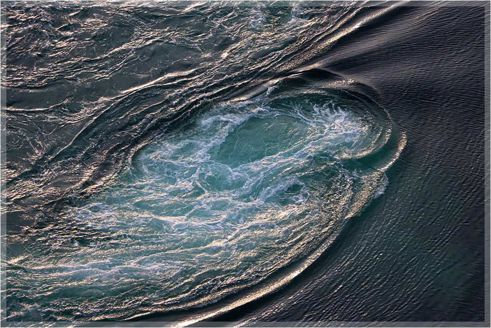 Der Whirlpool ist mehr als doppelt so lang wie das Boot, das ungefähr sechs Meter lang sein dürfte |