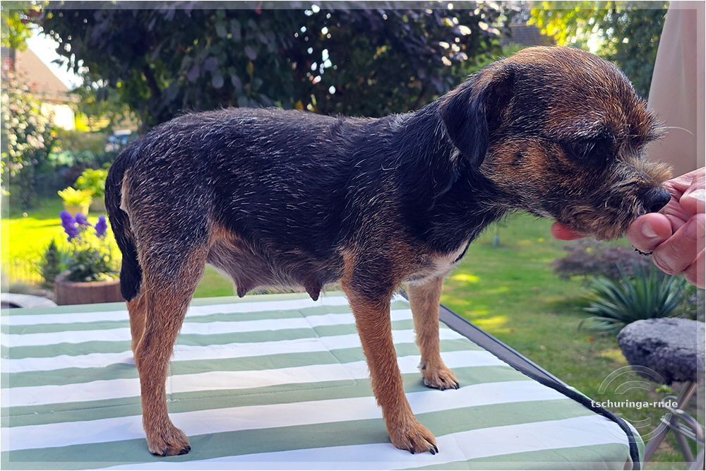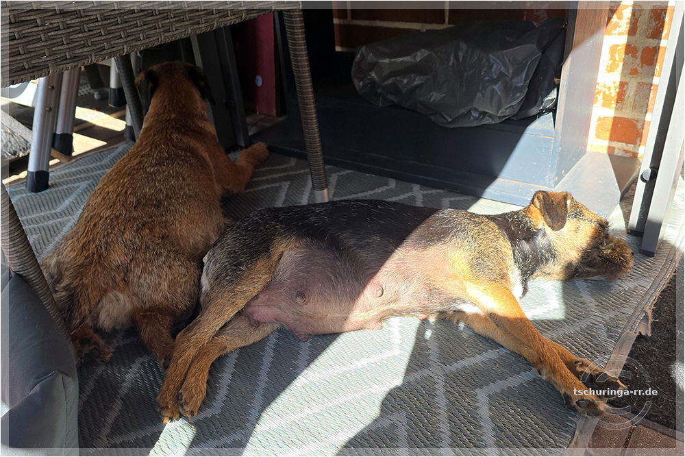 Wir kaufen kurz beim Aldi ein und fahren dann nach Marxen, wo Unas Züchter wohnen. Dort sind zwei Hündinnen tragend und wir wollen "dicke Bäuche gucken". Auf einem Platz neben einer Holzscheune können wir parken. Dann laufen wir erst einmal mit den Hunden los. Später kommen Beate und Karsten samt Campingstühlen zum Wohnmobil und es gibt Apfelkuchen, den ich gestern gebacken habe. Wir brechen später zu einer zweiten Hunderunde auf. Abends kommen Beate und Karsten zum Wohnmobil. Wir killen zwei Flaschen Wein und klönen bis spät in die Nacht. Una und ihr früheres (Züchter)Frauchen kuscheln stundenlang miteinander. |