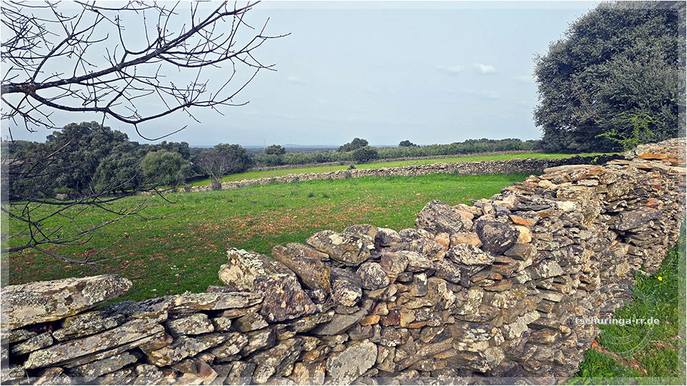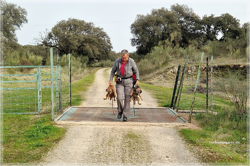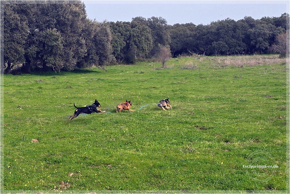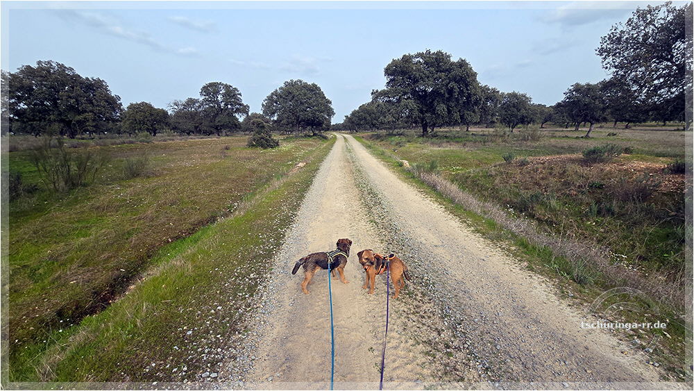 Wir sind wieder in Spanien. Heute steht Diesel tanken auf dem Plan, was sich irgendwie als schwierig darstellt. Die erste Tankstelle ist schlicht und ergreifend nicht da. Die zweite ist bei einem Carrefour und ist so niedrig, dass wir mit dem Womo keine Chance haben. Wir tanken dann bei einer GALP 40 Liter für 1,55 €. Wenig später kommen wir doch tatsächlich an einer Tankstelle vorbei, bei der der Diesel nur 1,34 € kostet. Also machen wir den Tank doch noch voll. Hätten wir das mal nur vorher gewusst. Der Stellplatz ist das nächste Problem. Um zu bezahlen muss man eine App runterladen. Die Besatzung des Womos, das nach uns kommt, schiebt das Tor einfach auf und fährt drauf. Der Haken ist, dass man einen Code braucht, um wieder runter zu kommen. Selbst für das Fußgängertor braucht man den Code. Ohne besteht die Gefahr, dass man gar nicht wieder wegkommt. Wir entscheiden uns dagegen, zumal auch die Gegend uns nicht wirklich zu Begeisterungsstürmen hinreißt. 70 Kilometer später fahren wir in Serrejón auf den Stellplatz und laufen noch eine knapp fünf Kilometerrunde mit den Hunden. Auf einer Wiese können die Drei 'ne ordentlich Runde toben. Das hat vor allem den Border Mädels gefehlt. |