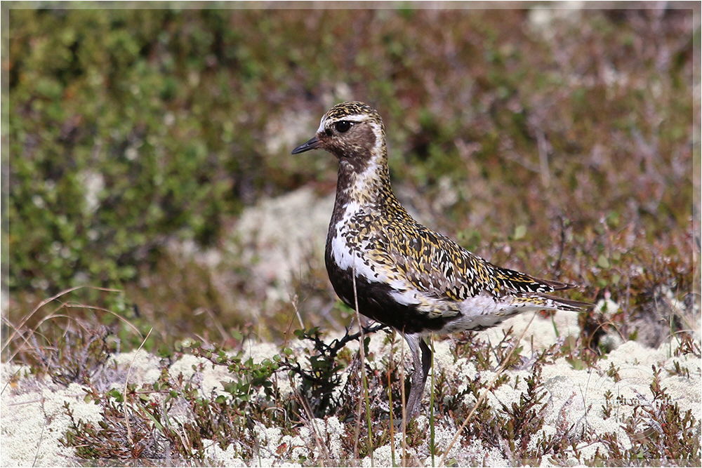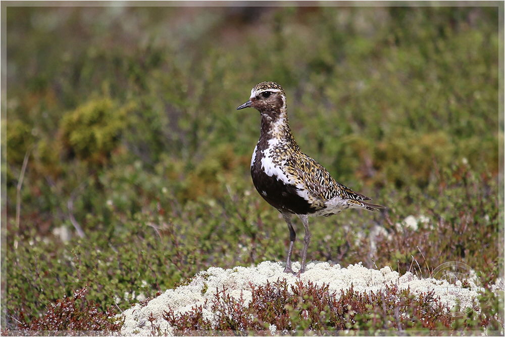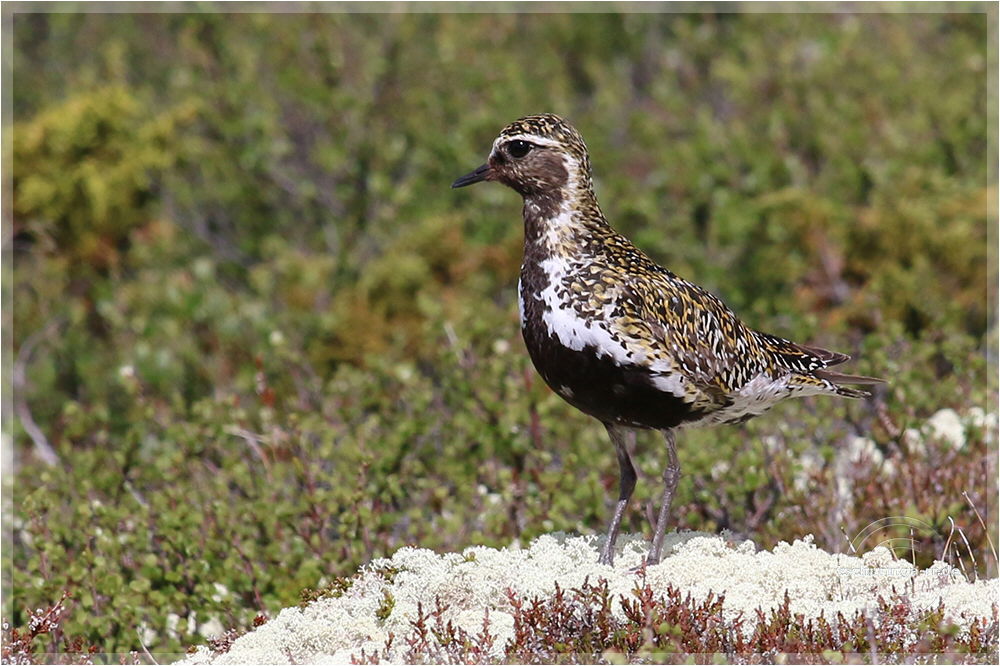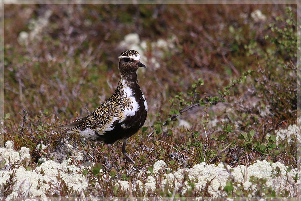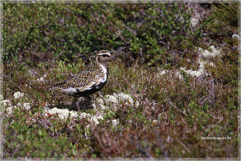 Goldregenpfeifer am Dovrefjell Der lange und laute Pfeifton des Goldregenpfeifers ist gut zu hören. Das Tier kommt immer näher heran, weil wir stehen geblieben sind, um zu fotografieren. Es versucht uns vom brütenden Partner wegzulocken und ist zeitweilig nur sieben/acht Meter von uns entfernt. |
