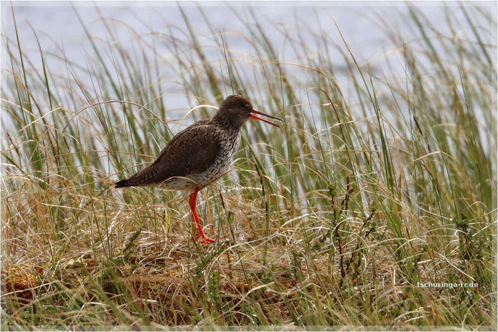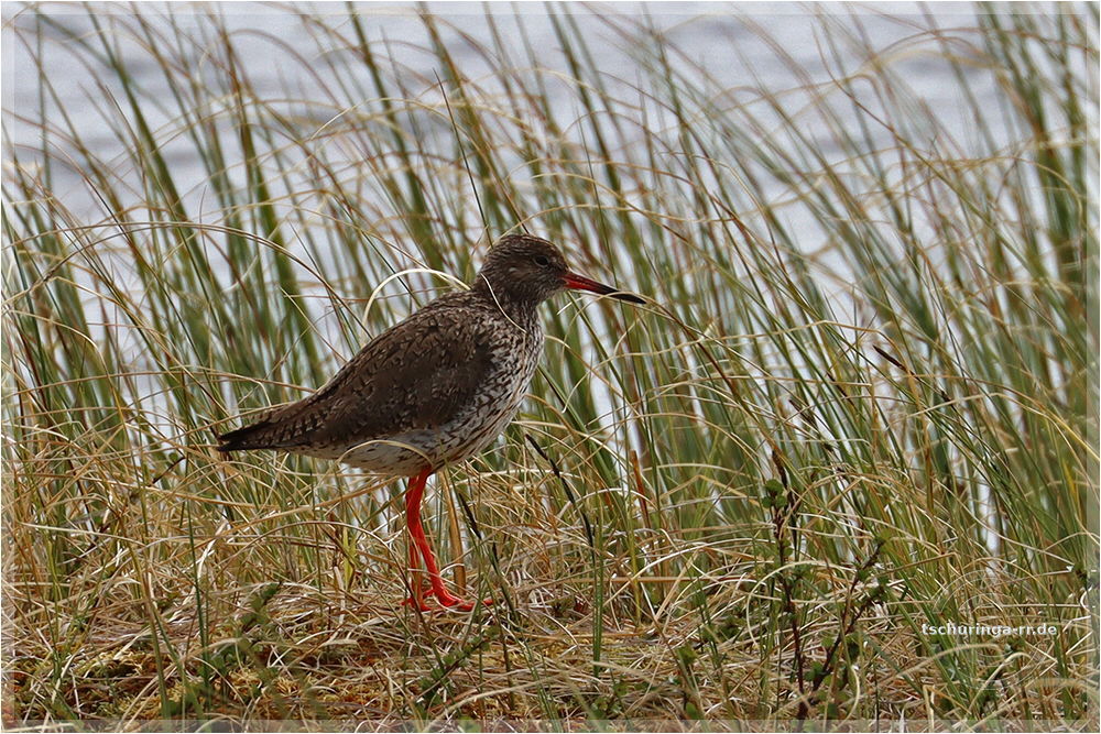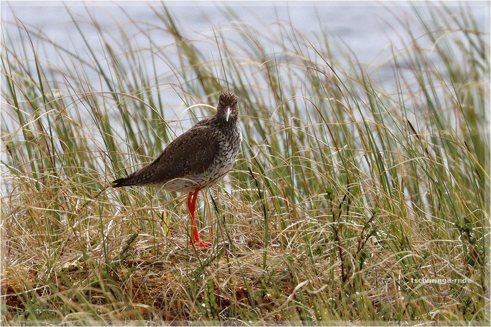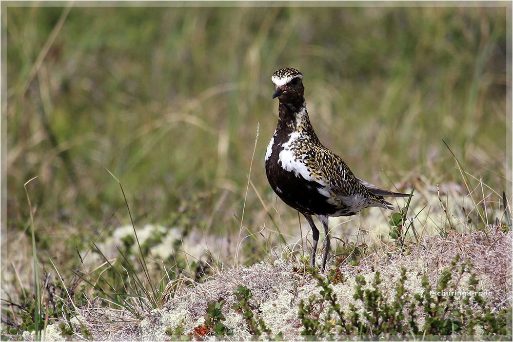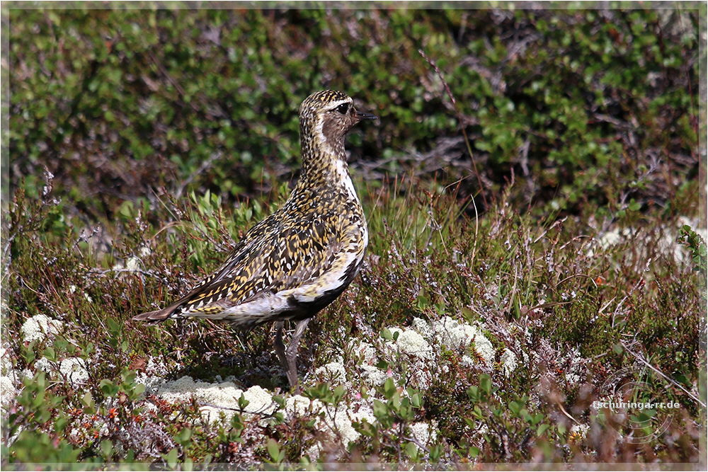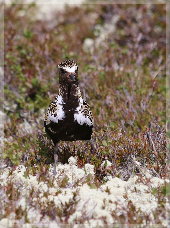 Goldregenpfeifer am Dovrefjell Der lange und laute Pfeifton des Goldregenpfeifers ist gut zu hören. Das Tier kommt immer näher heran, weil wir stehen geblieben sind, um zu fotografieren. Es versucht uns vom brütenden Partner wegzulocken und ist zeitweilig nur sieben/acht Meter von uns entfernt. |