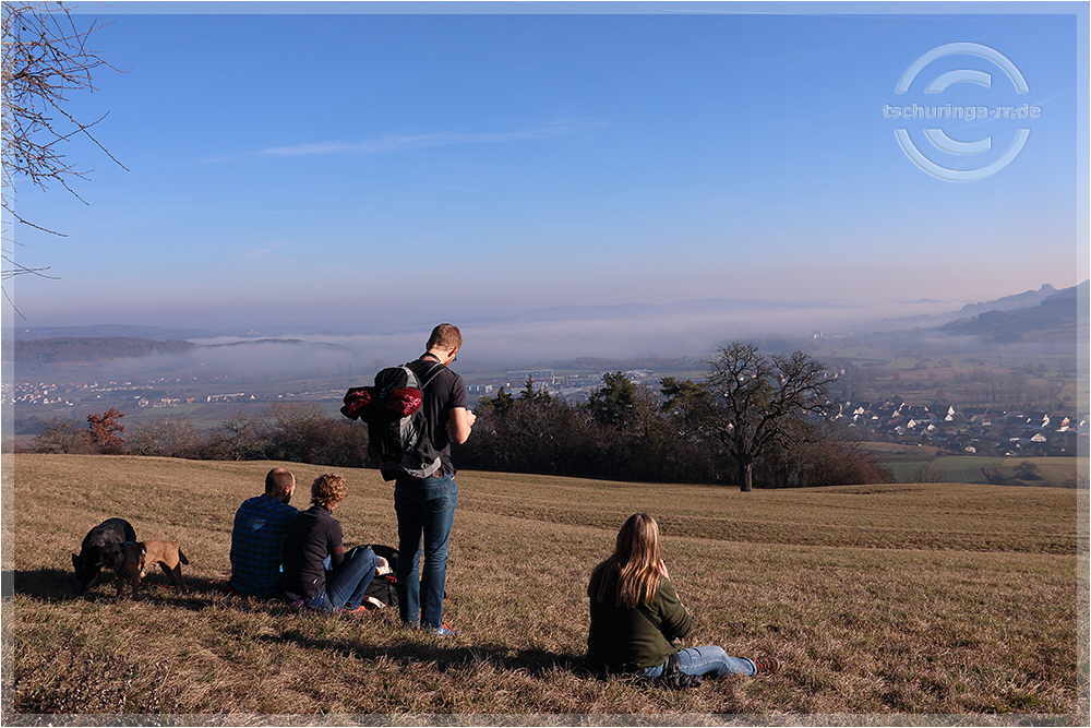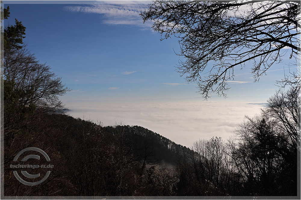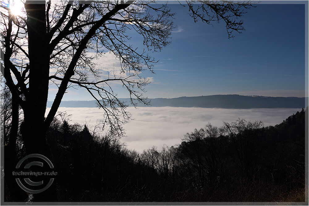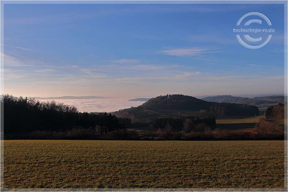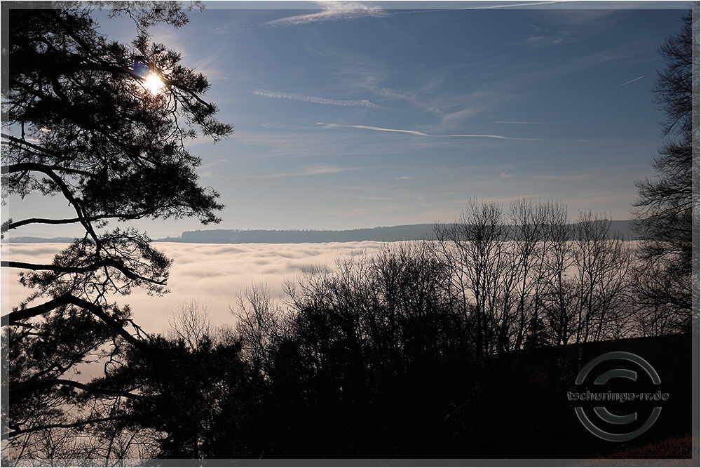 | Ausblick von der Zimmerwiese bei Sipplingen über den Bodensee, der vom Nebel verdeckt ist. | ||